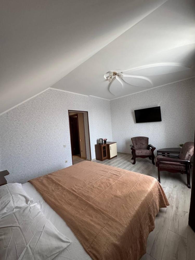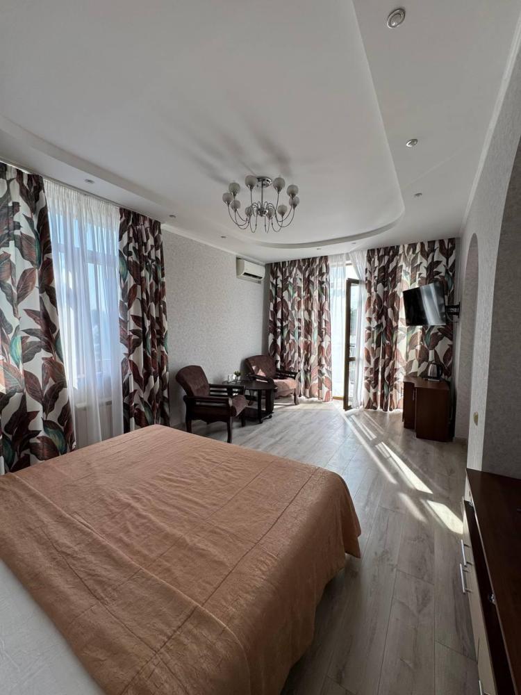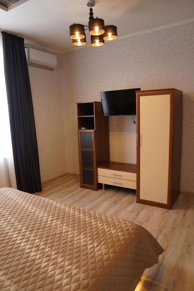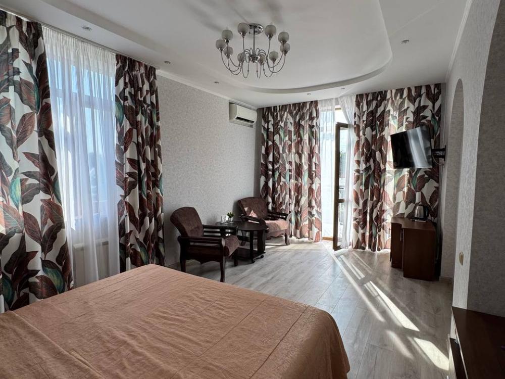 В номере: одна большая кровать, диван, стол, 2 кресла, шкаф, прикроватные тумбочки, зеркало, кондиционер, набор постельного белья, телевизор, холодильник. В ванной: туалет, раковина, душ, средства личной гигиены, зеркало, набор полотенец, фен.