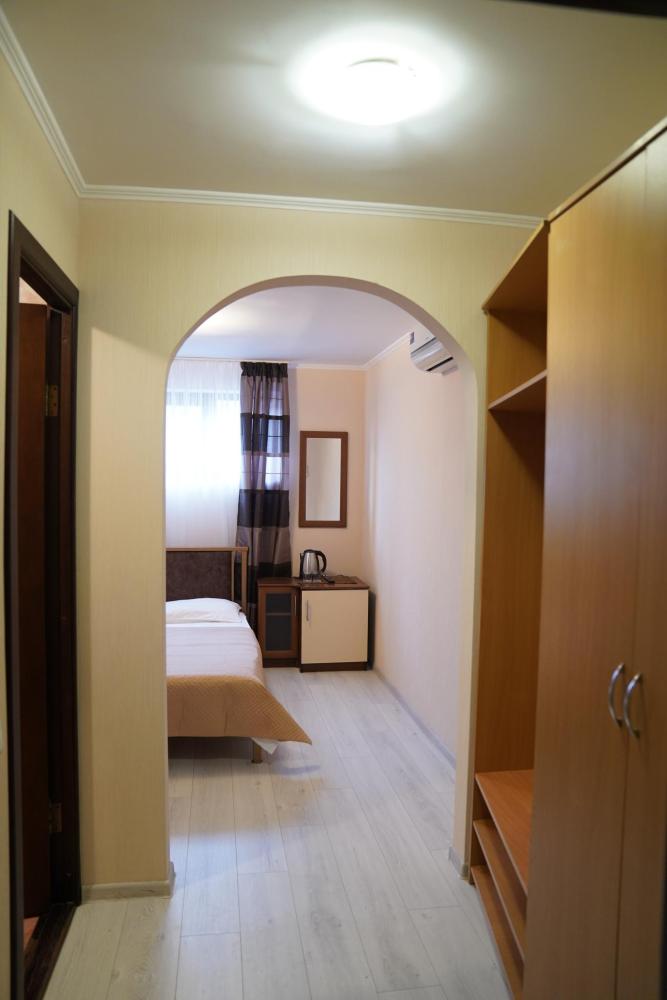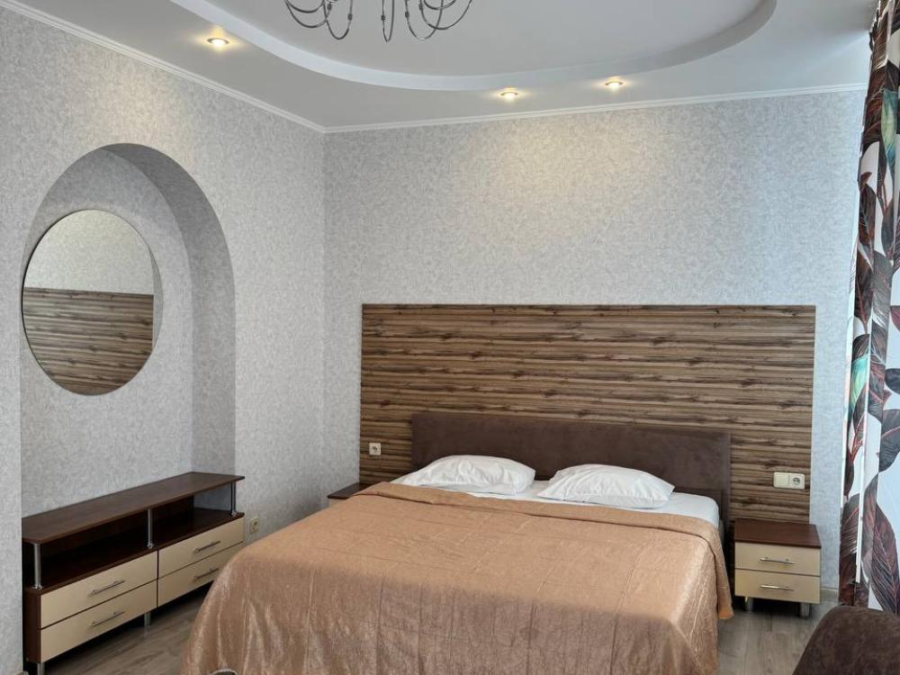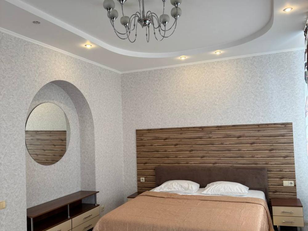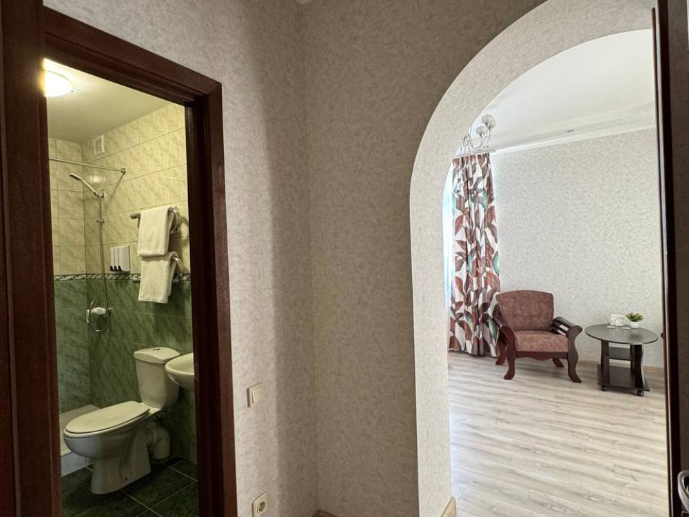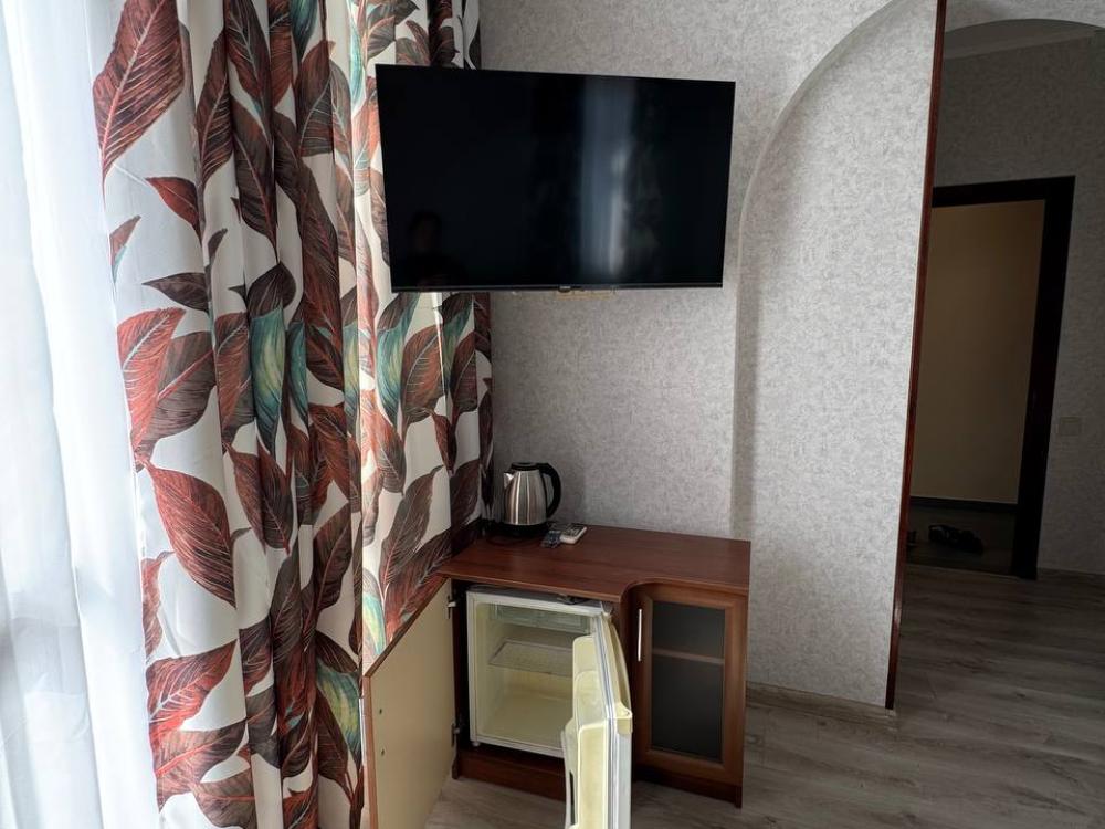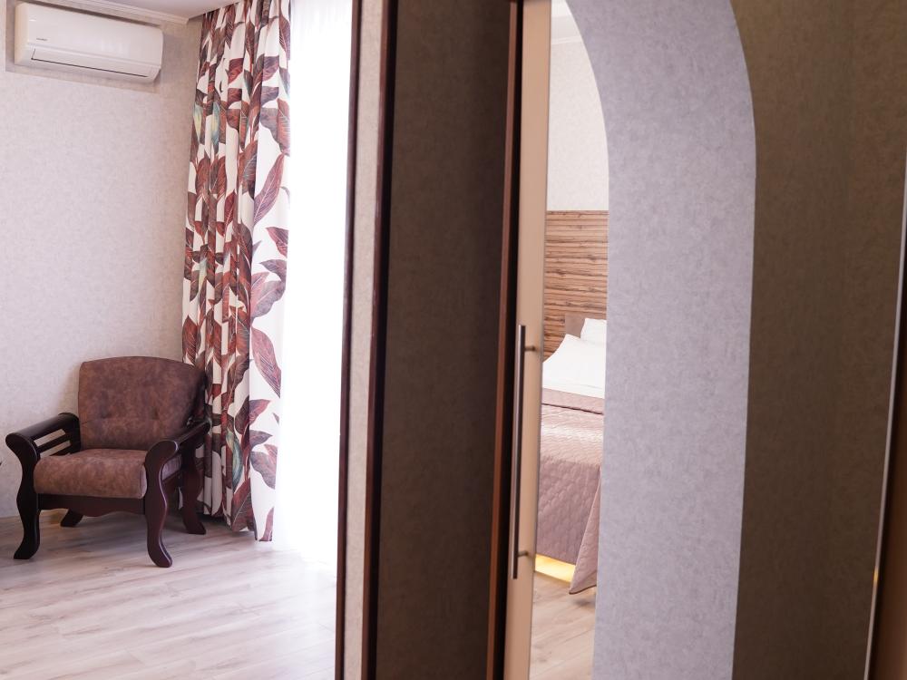 Четырех местный номер. В номере две спальни: В одной: двуспальная кровать прикроватные тумбы, Туалетный столик, телевизор, сплит система, набор постельного бель В другой: две односпальные кровати, журнальный стол, стулья, прикроватные тумбочки, кондиционер, холодильник, телевизор, тумбочка. набор постельного белья. В коридоре: шкаф-купе, зеркало. В ванной комнате: унитаз, раковина, ванна, средства личной гигиены, зеркало, набор полотенец.
