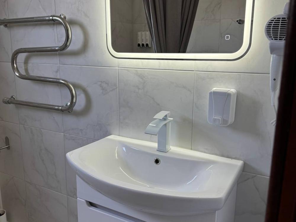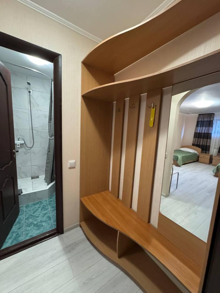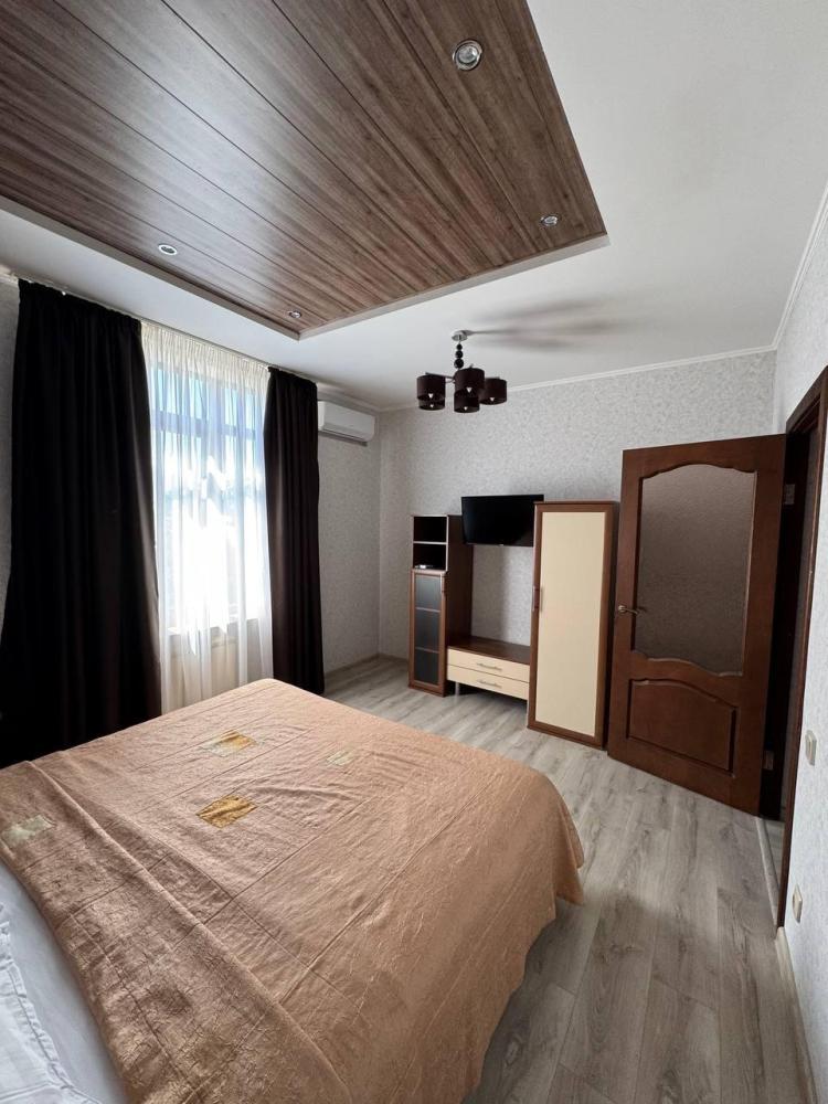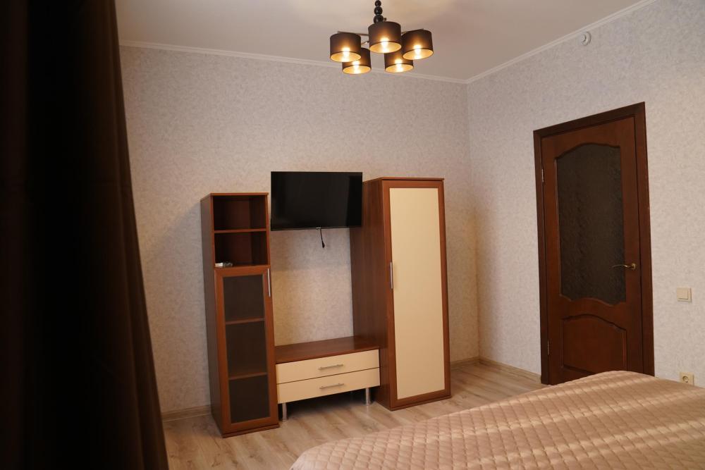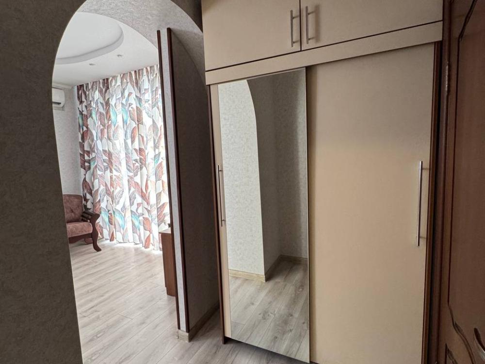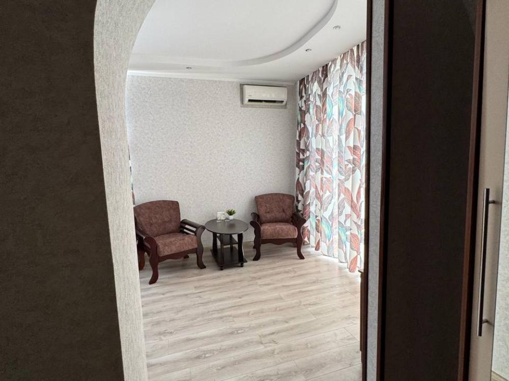 Четырех местный номер. В номере две спальни: В одной: двуспальная кровать прикроватные тумбы, Туалетный столик, телевизор, сплит система, набор постельного бель В другой: две односпальные кровати, журнальный стол, стулья, прикроватные тумбочки, кондиционер, холодильник, телевизор, тумбочка. набор постельного белья. В коридоре: шкаф-купе, зеркало. В ванной комнате: унитаз, раковина, ванна, средства личной гигиены, зеркало, набор полотенец.
