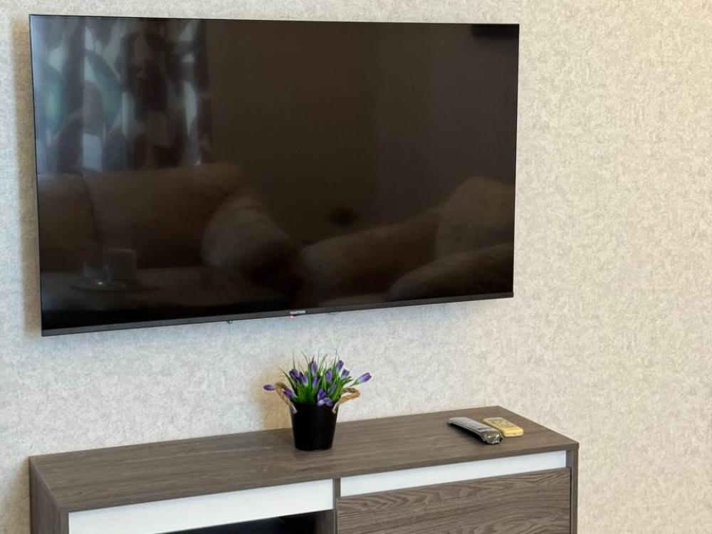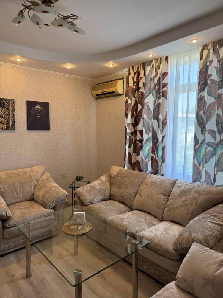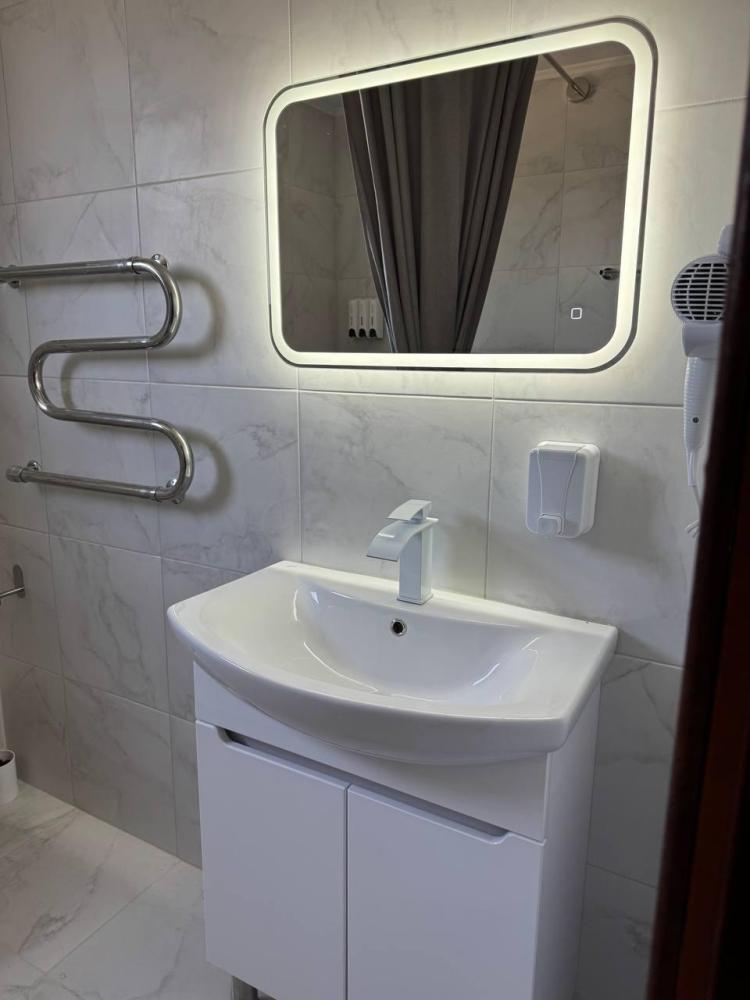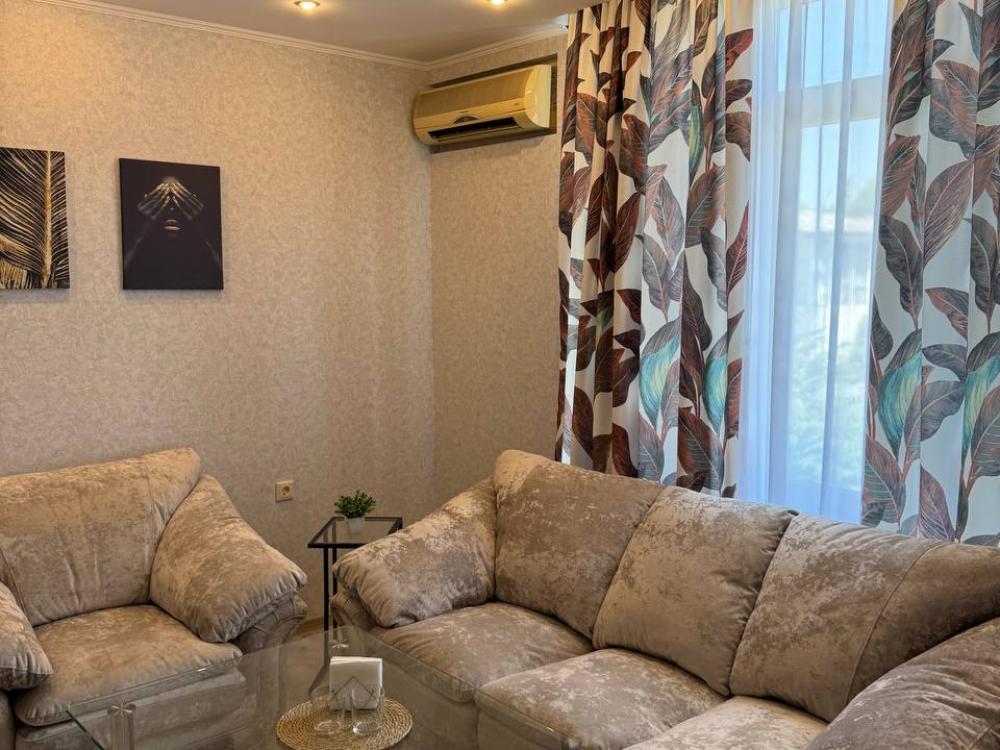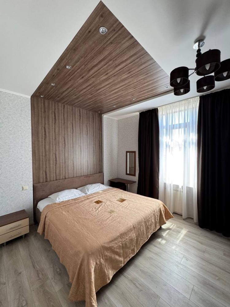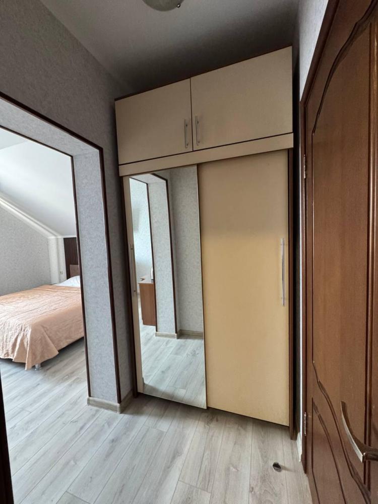 Четырех местный номер. В номере две спальни: В одной: двуспальная кровать прикроватные тумбы, Туалетный столик, телевизор, сплит система, набор постельного бель В другой: две односпальные кровати, журнальный стол, стулья, прикроватные тумбочки, кондиционер, холодильник, телевизор, тумбочка. набор постельного белья. В коридоре: шкаф-купе, зеркало. В ванной комнате: унитаз, раковина, ванна, средства личной гигиены, зеркало, набор полотенец.