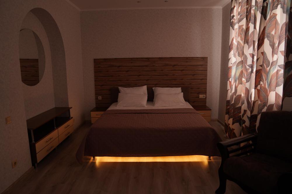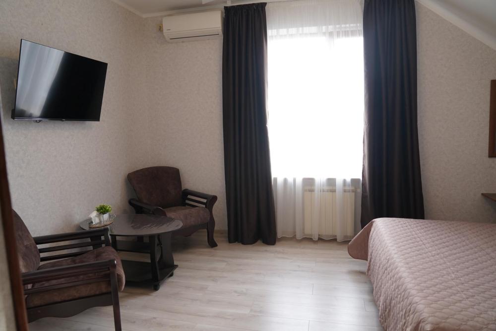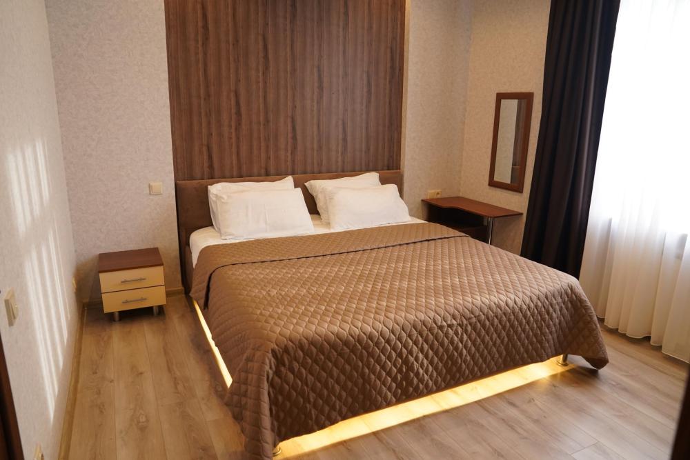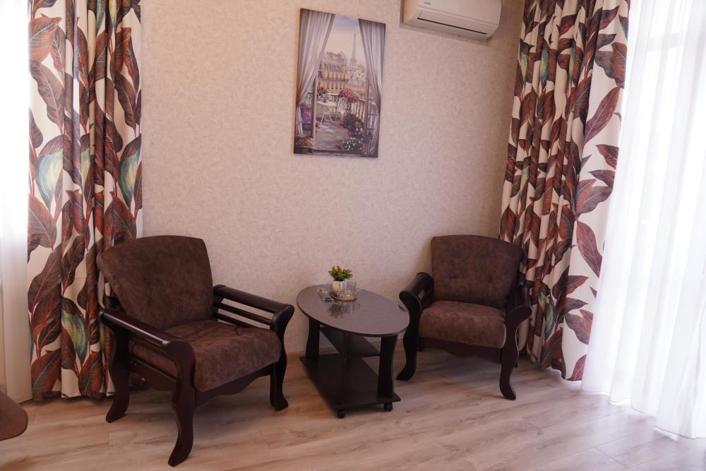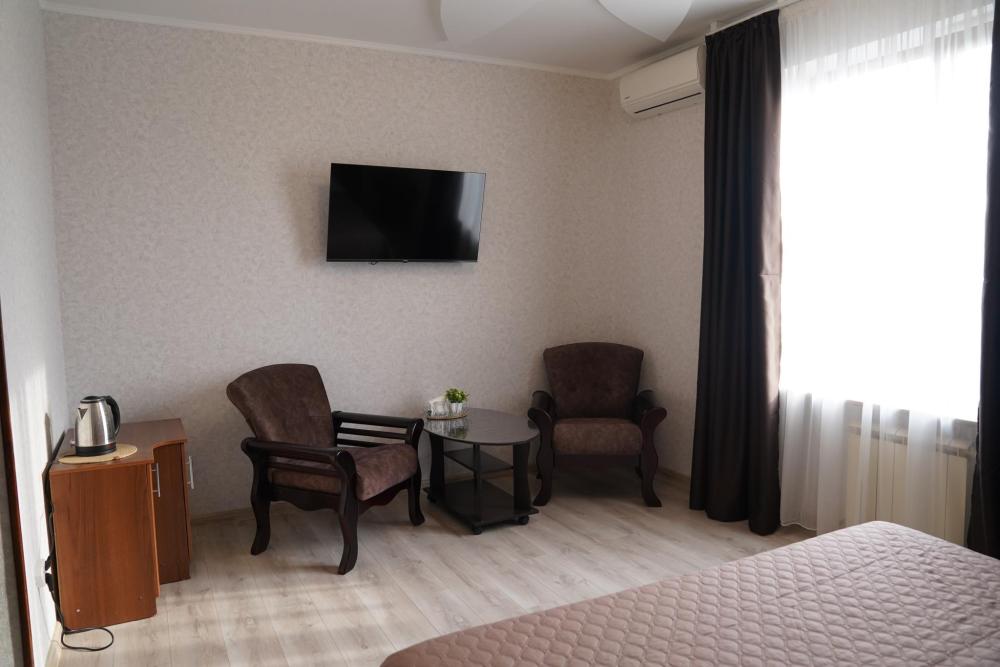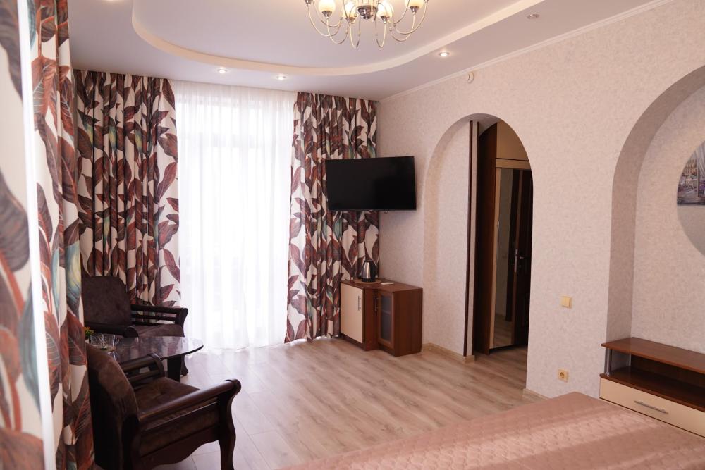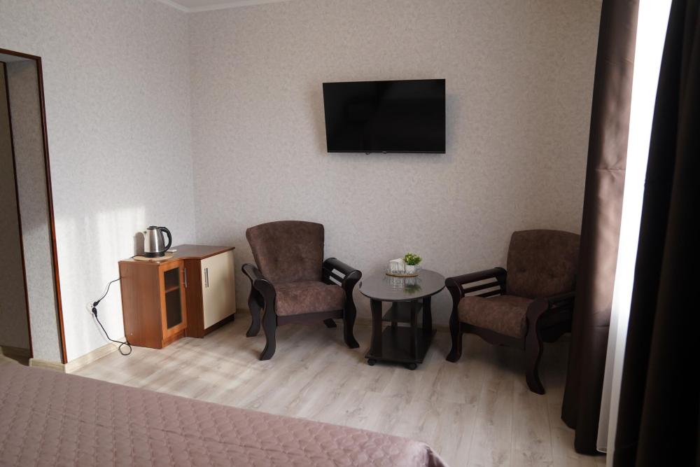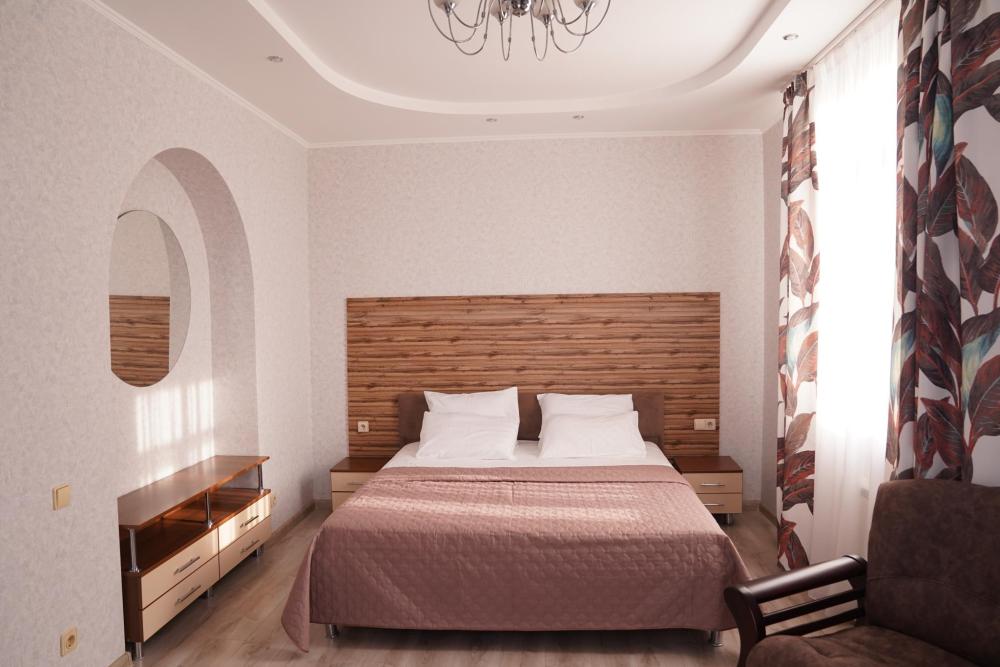 Двухместный номер. В номере: двуспальная кровать, прикроватная тумбочка, туалетный столик, шкаф-купе, кондиционер, зеркало, журнальный столик,кресла, набор постельного белья, телевизор, холодильник. В ванной: унитаз, раковина, душевая кабина, средства личной гигиены, тапочки, зеркало, набор полотенец.