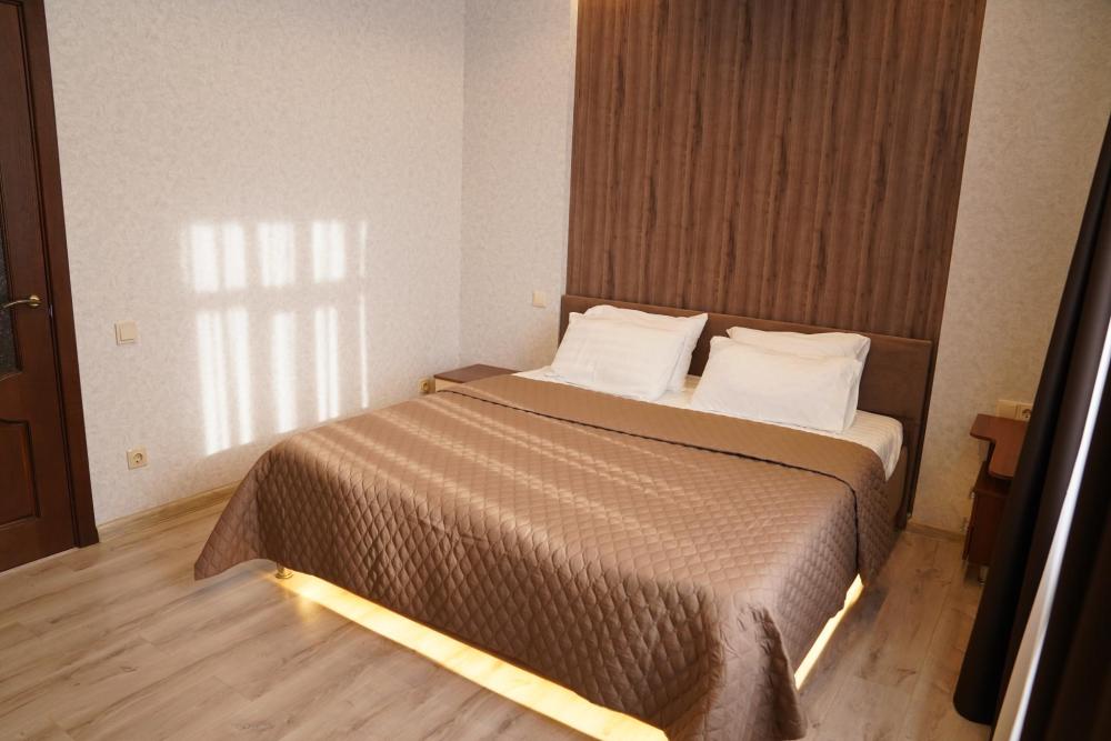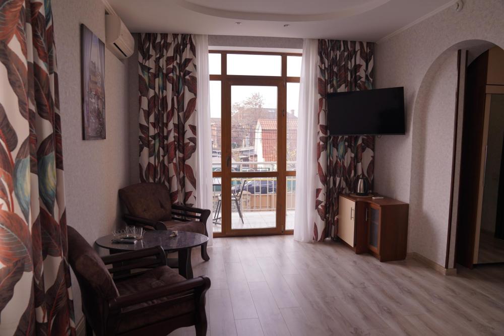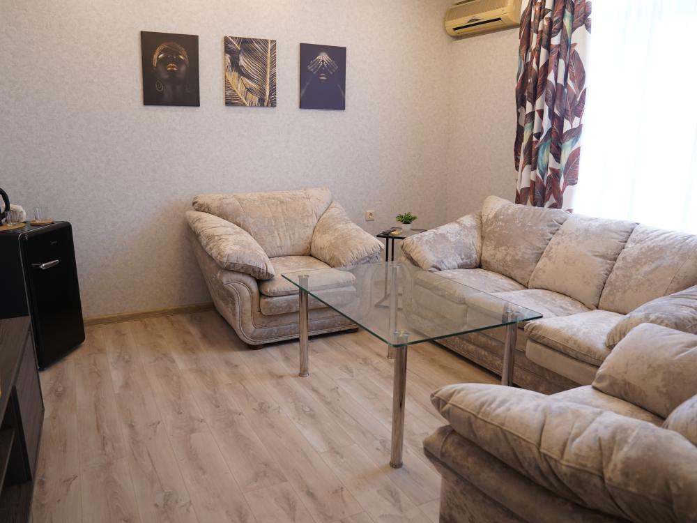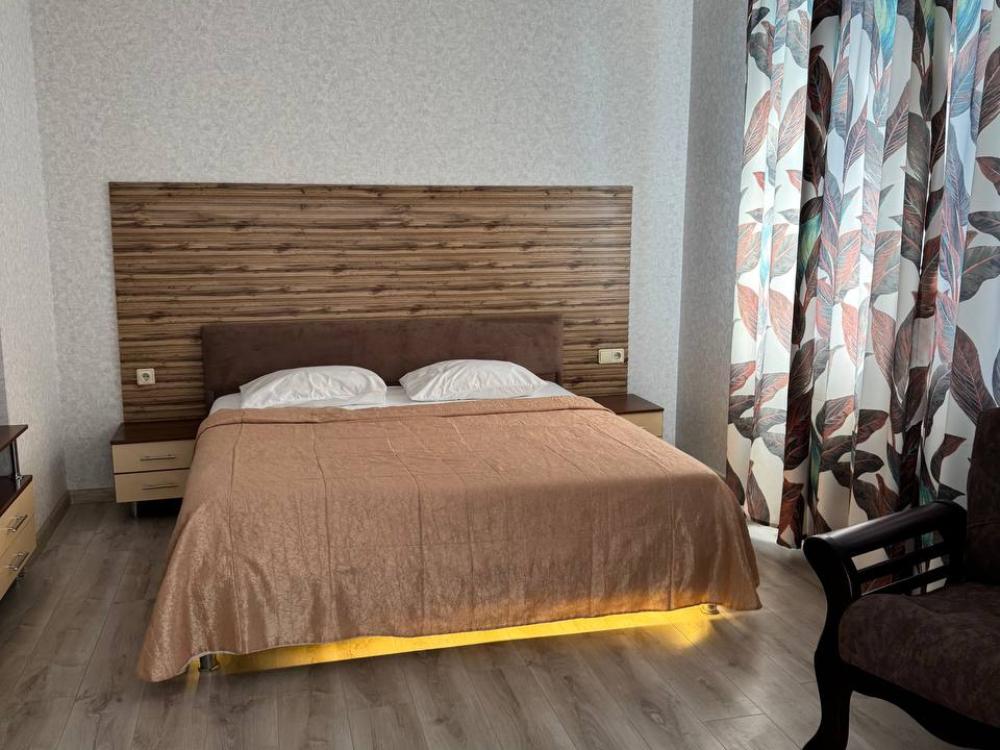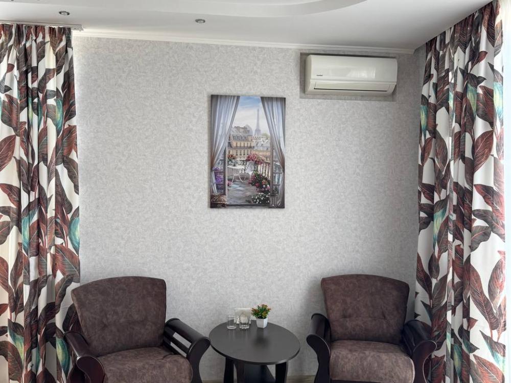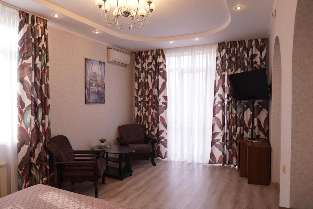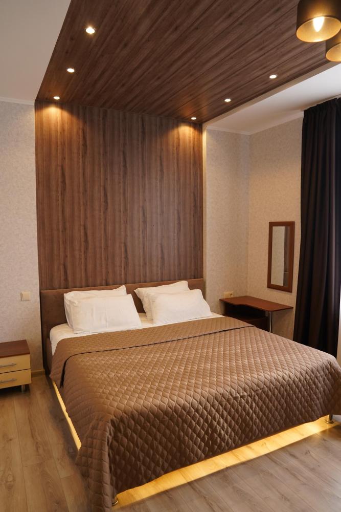 Двухместный номер. В номере: двуспальная кровать, прикроватная тумбочка, туалетный столик, шкаф-купе, кондиционер, зеркало, журнальный столик,кресла, набор постельного белья, телевизор, холодильник. В ванной: унитаз, раковина, душевая кабина, средства личной гигиены, тапочки, зеркало, набор полотенец.