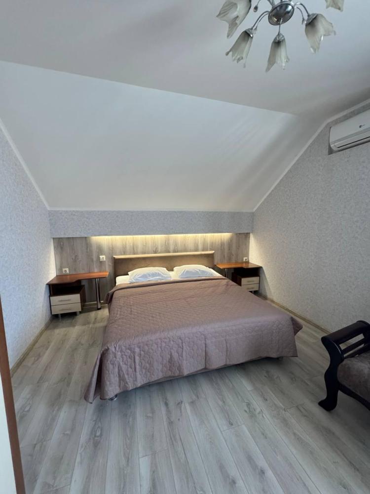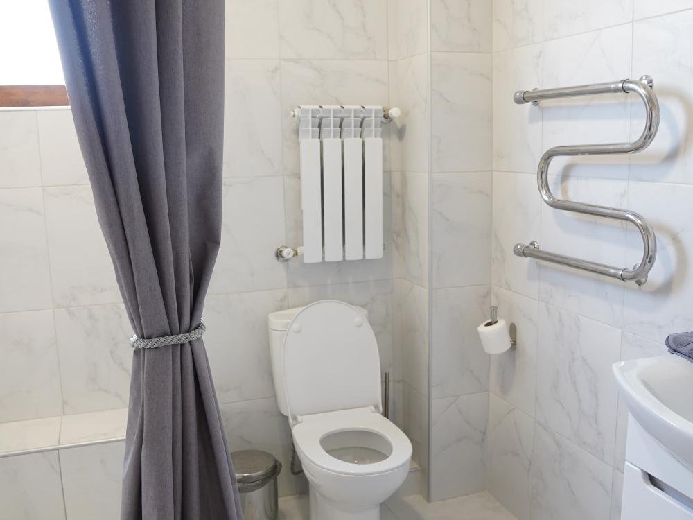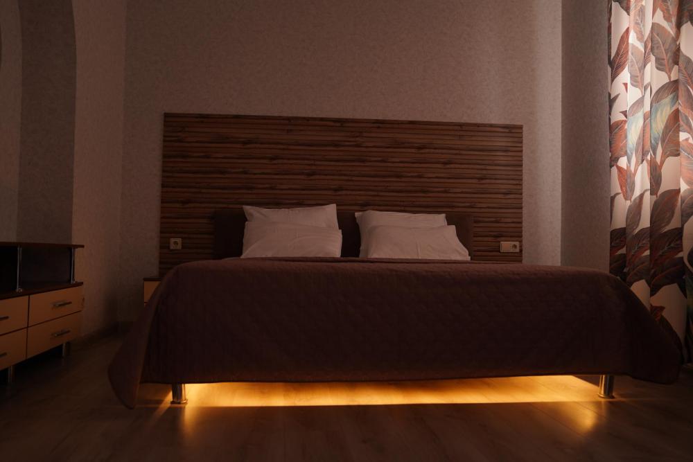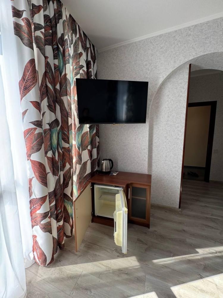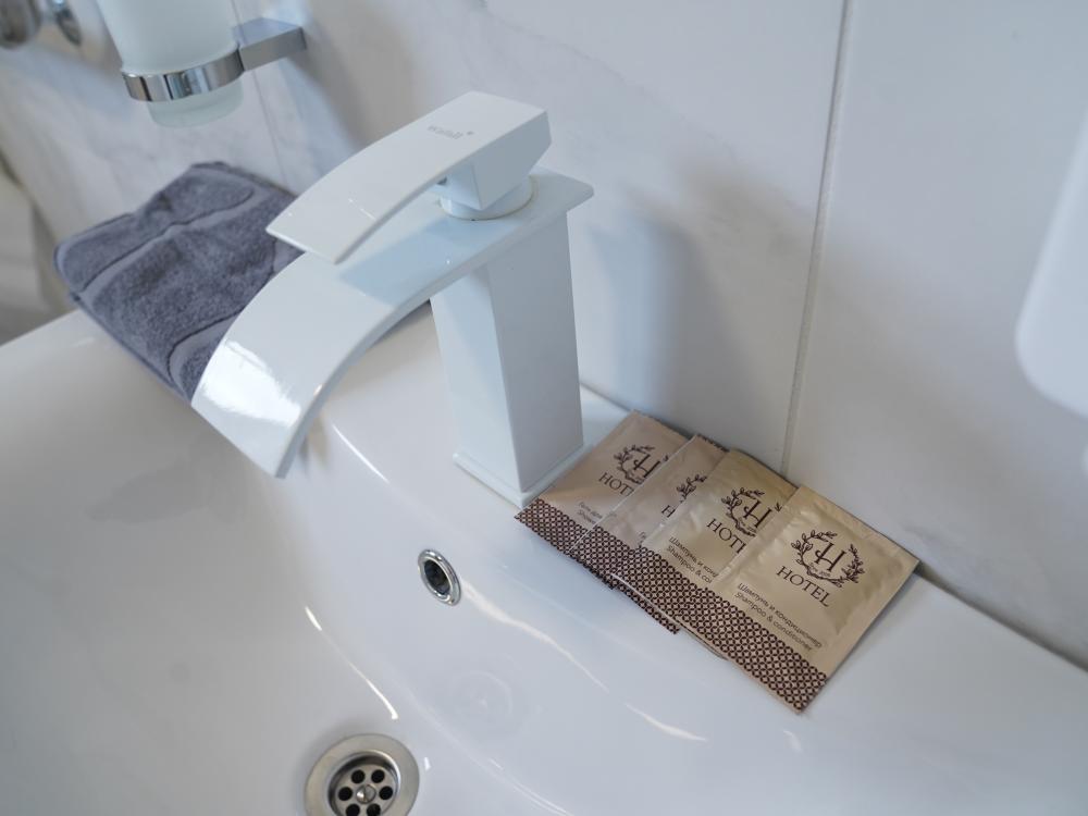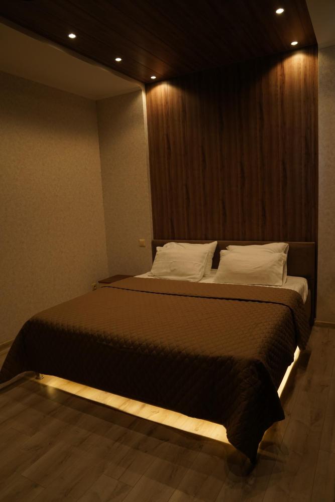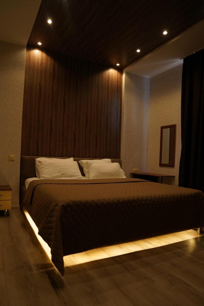 В номере: одна большая кровать, стол, стулья, шкаф, прикроватные тумбочки, зеркало, кондиционер, набор постельного белья, телевизор, холодильник. В ванной: туалет, раковина, душ, средства личной гигиены, зеркало, набор полотенец, фен.