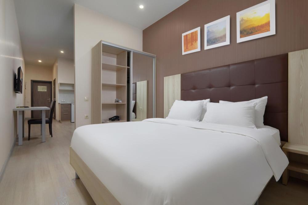 Studio Superior Улучшенные Апартаменты – для истинных ценителей удобства и уюта в интерьере с отдельной спальной и кухонной зонами. Пространство для полноценного отдыха после плодотворного трудового дня с большая двуспальной кроватью, прикроватными тумбами, шкафом-купе и телевизором. Кухонная зона с диваном оборудована индукционной плитой, посудомоечной машиной, микроволновой печью и холодильником. Полностью укомплектованная ванная комната – душ, фен, стиральная машина, полотенца премиального бренда Togas, линия гипоаллергенной luxe-косметики с аргановым маслом.