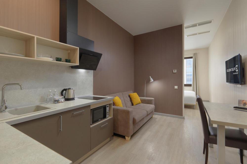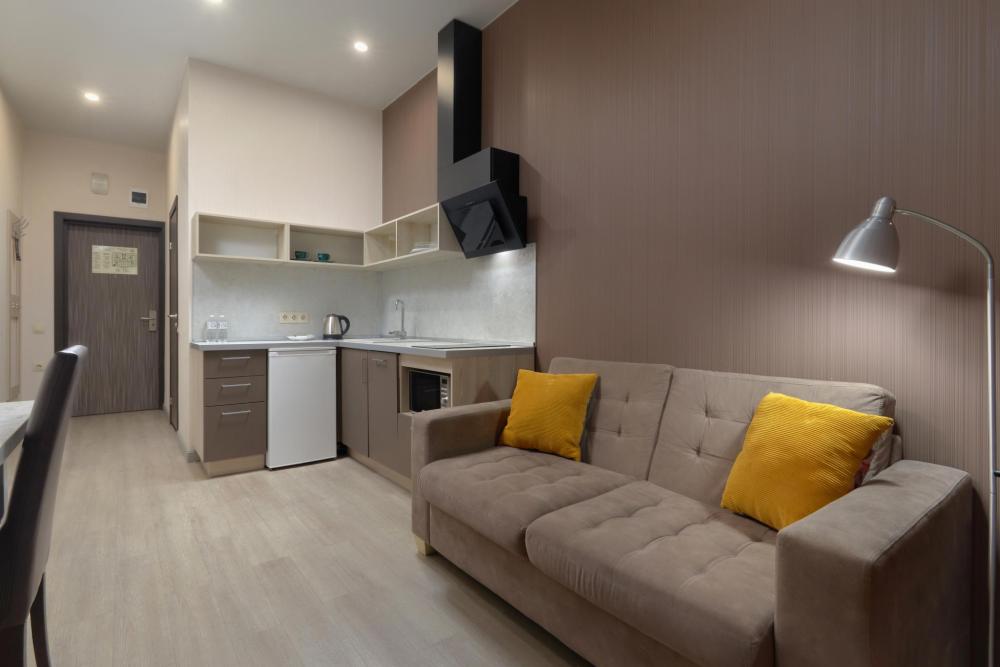 Studio Apartment Twin Улучшенные Апартаменты с двумя односпальными кроватями оснащены прикроватными тумбами, шкафом-купе и телевизором. Кухонная зона с диваном оборудована индукционной плитой, посудомоечной машиной, микроволновой печью и холодильником. Ванная комната с душем, стиральной машиной, гипоаллергенной luxe-косметикой. Лучшее решение для путешественников, которые привыкли получать самые выгодные предложения!