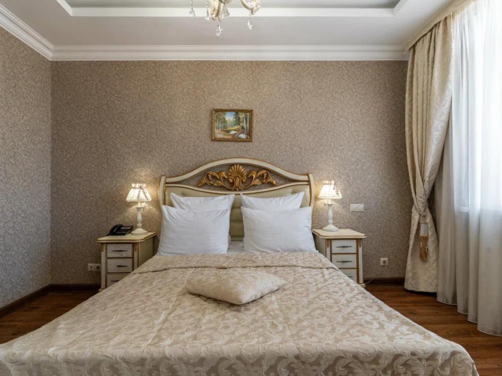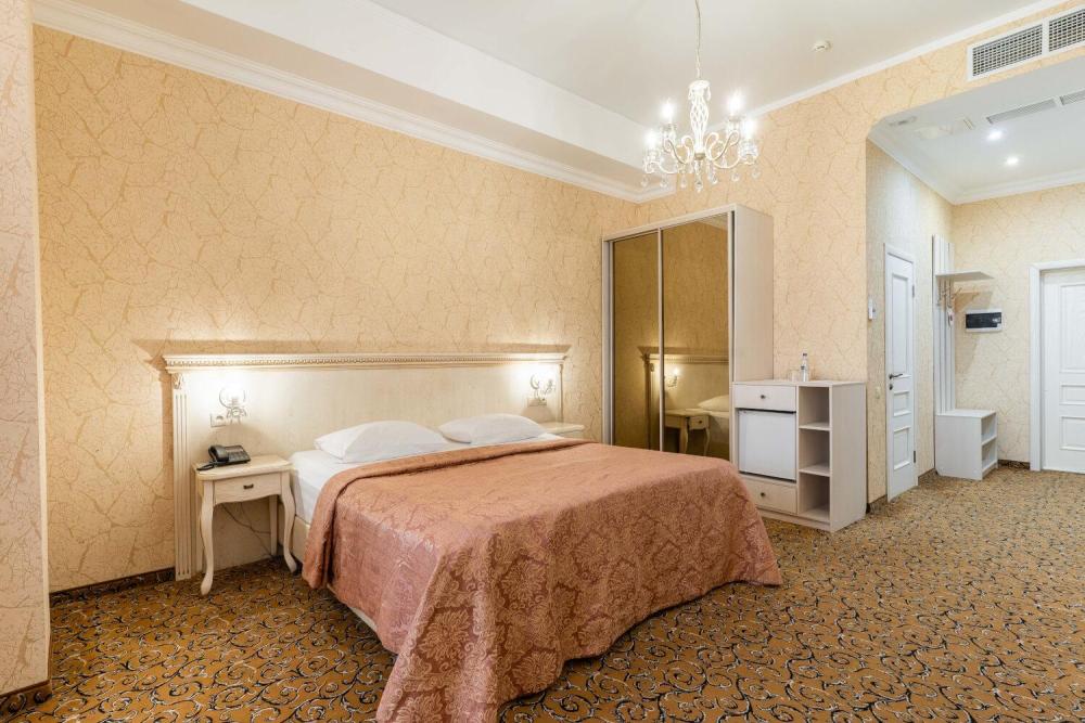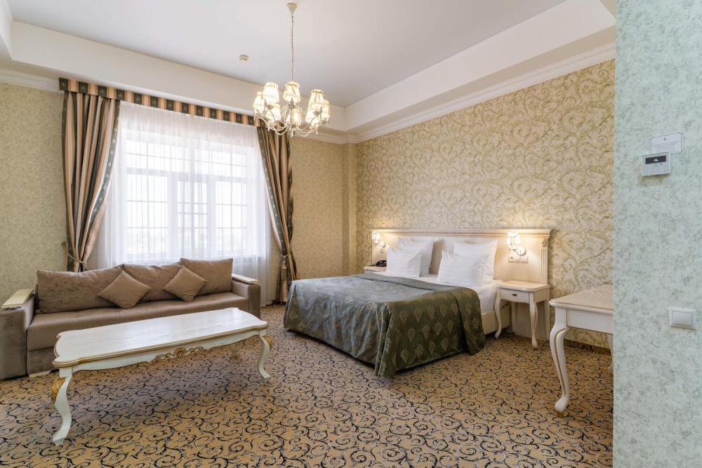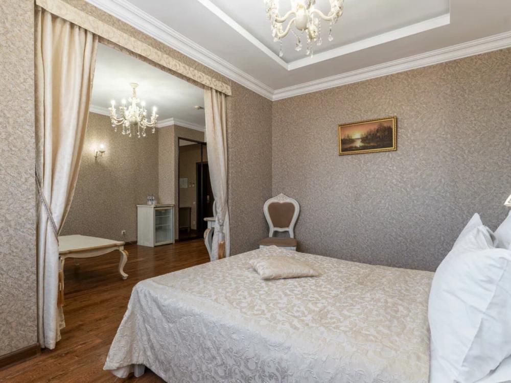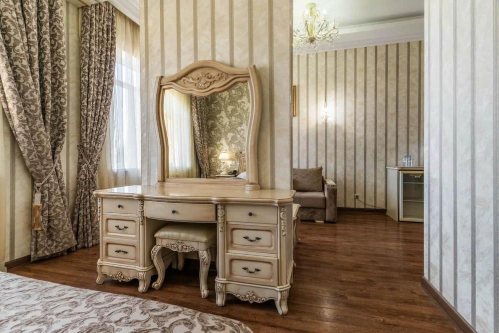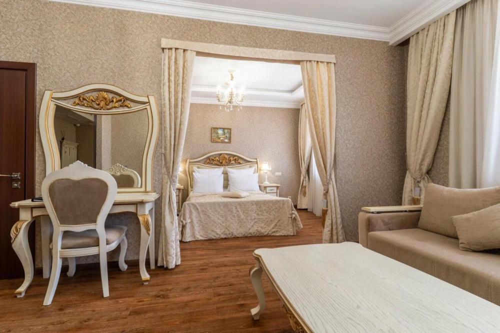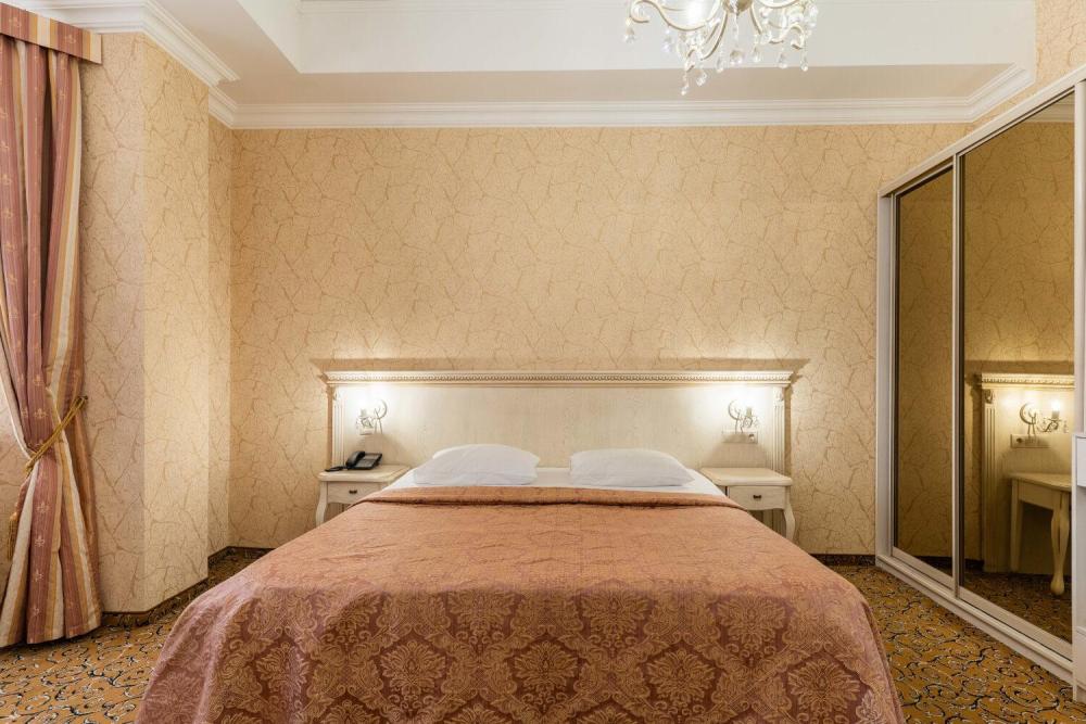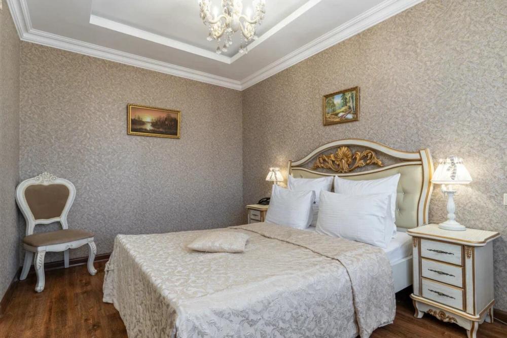Номер выдержан в атмосфере аристократической роскоши. Предусмотрены отдельные зоны для сна и общения. В номере есть все необходимое для комфорта гостей — двуспальная кровать, шкаф-купе, мягкая мебель, телевизор, рабочий стол со стульями, сейф. Санузел оснащен большой ванной и биде. Для гостей предоставляются полотенца, халаты, тапочки, фен, набор туалетно-косметических принадлежностей.