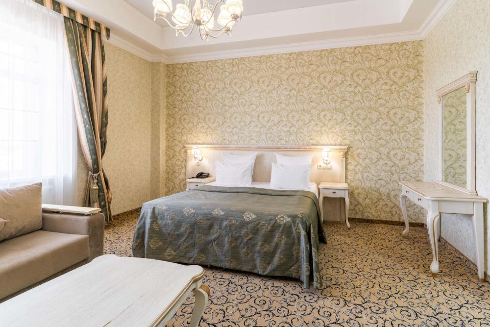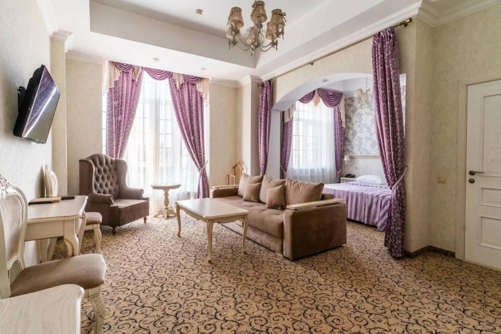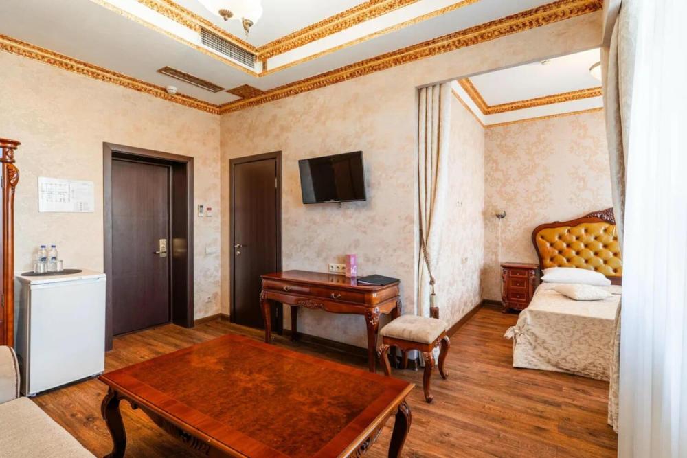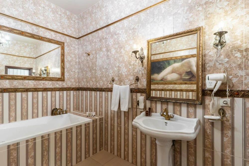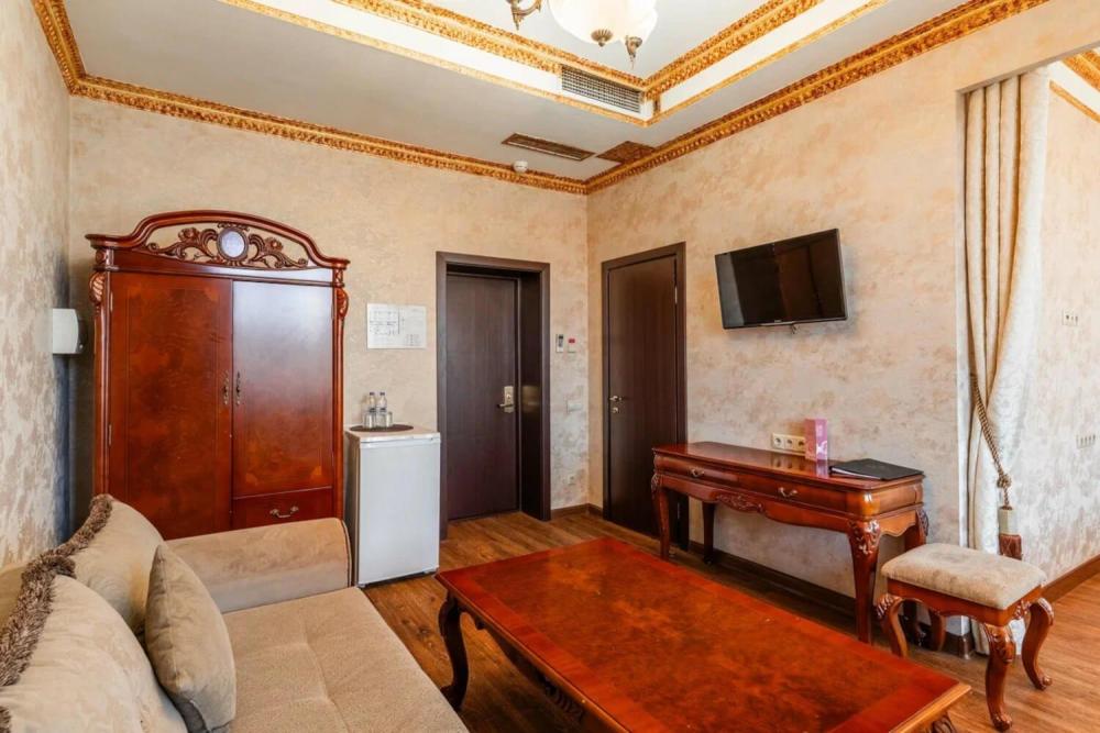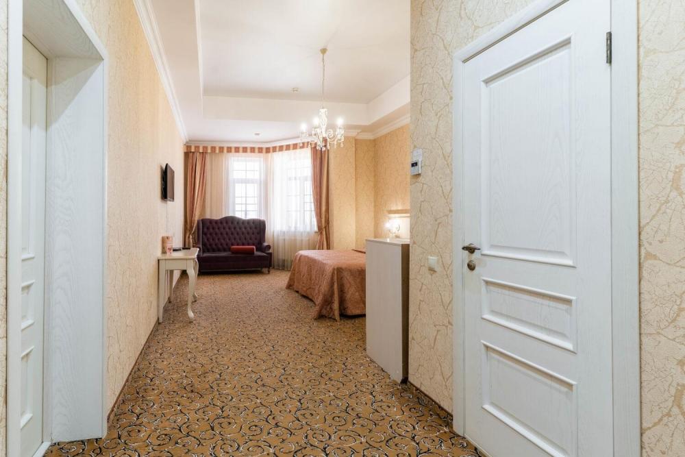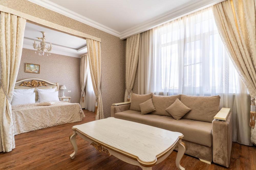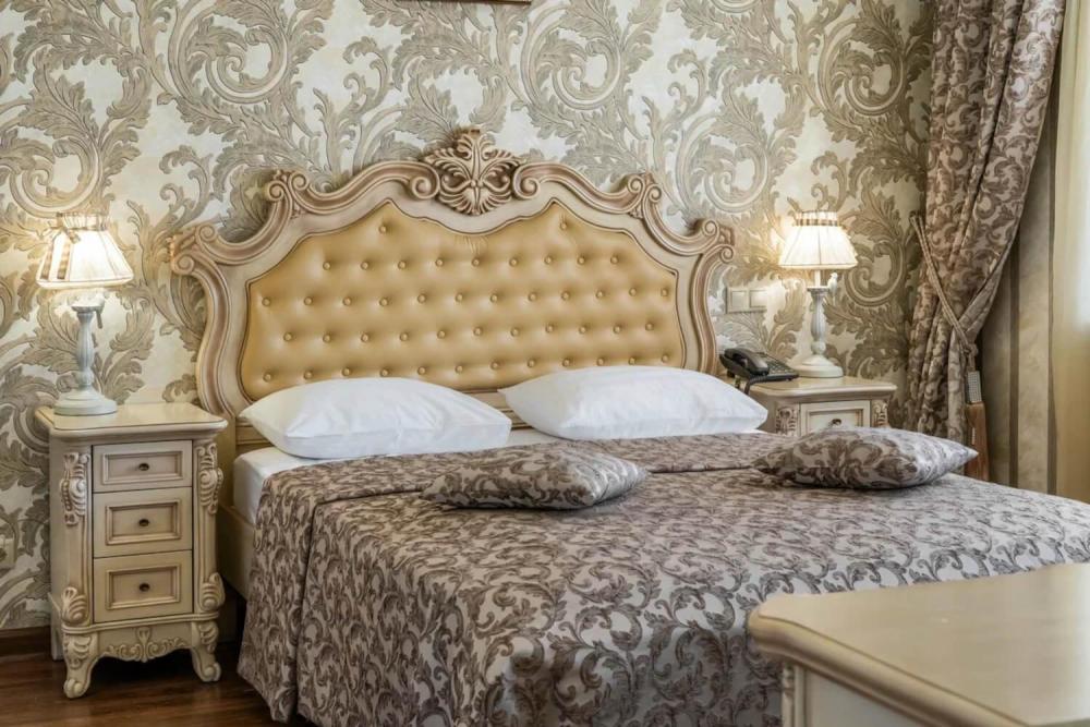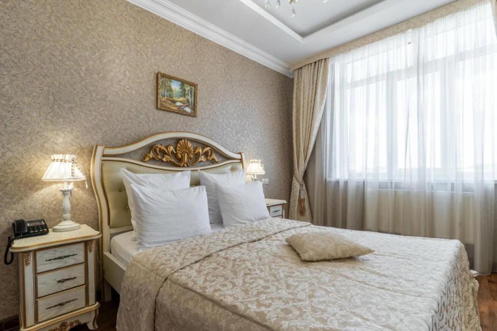 Номер выдержан в атмосфере аристократической роскоши. Предусмотрены отдельные зоны для сна и общения. В номере есть все необходимое для комфорта гостей — двуспальная кровать, шкаф-купе, мягкая мебель, телевизор, рабочий стол со стульями, сейф. Санузел оснащен большой ванной и биде. Для гостей предоставляются полотенца, халаты, тапочки, фен, набор туалетно-косметических принадлежностей.