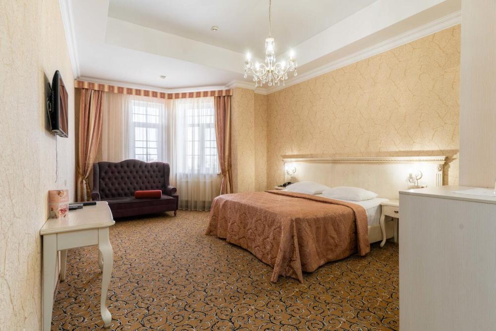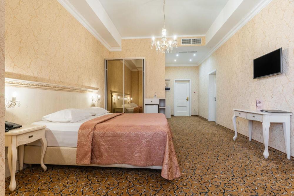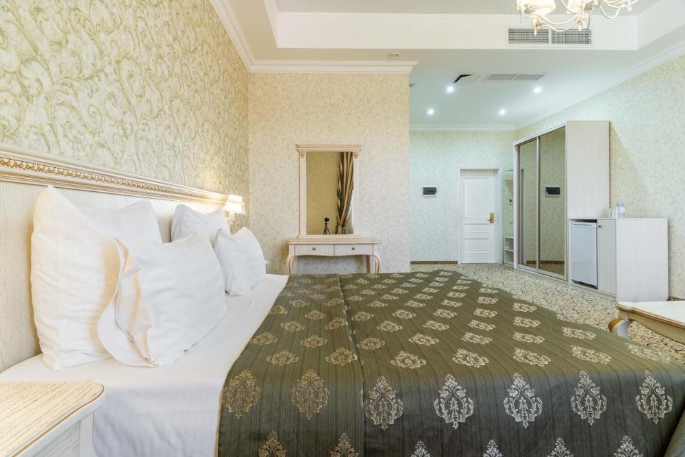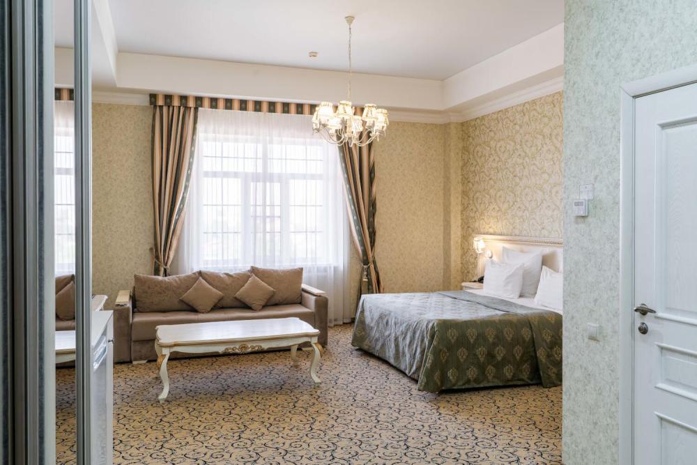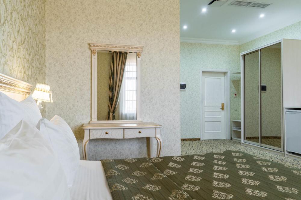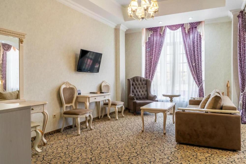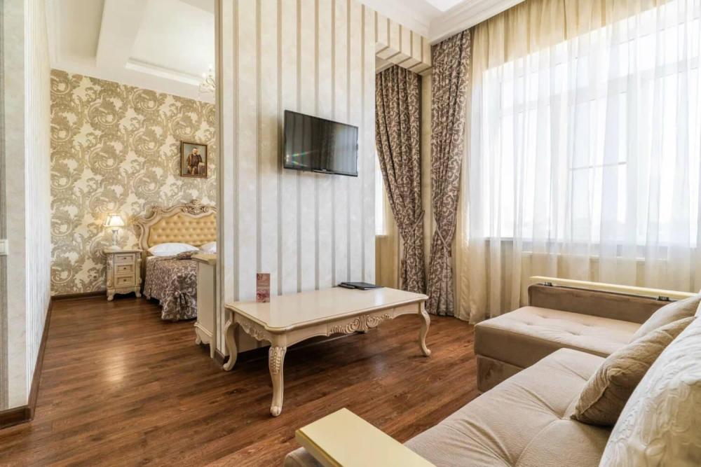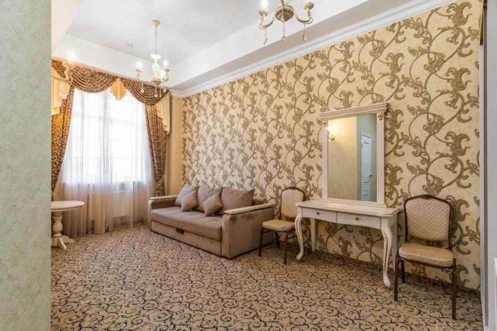 Номер выдержан в атмосфере аристократической роскоши. Предусмотрены отдельные зоны для сна и общения. В номере есть все необходимое для комфорта гостей — двуспальная кровать, шкаф-купе, мягкая мебель, телевизор, рабочий стол со стульями, сейф. Санузел оснащен большой ванной и биде. Для гостей предоставляются полотенца, халаты, тапочки, фен, набор туалетно-косметических принадлежностей.