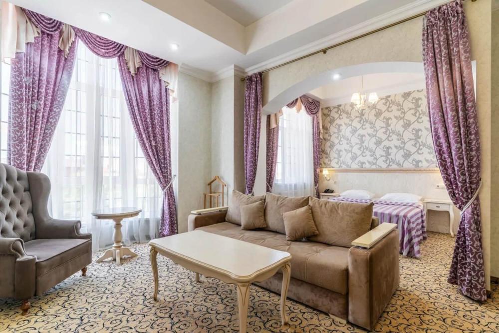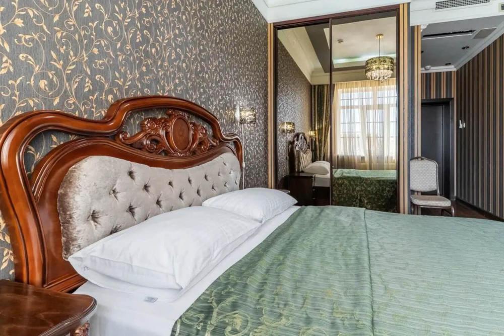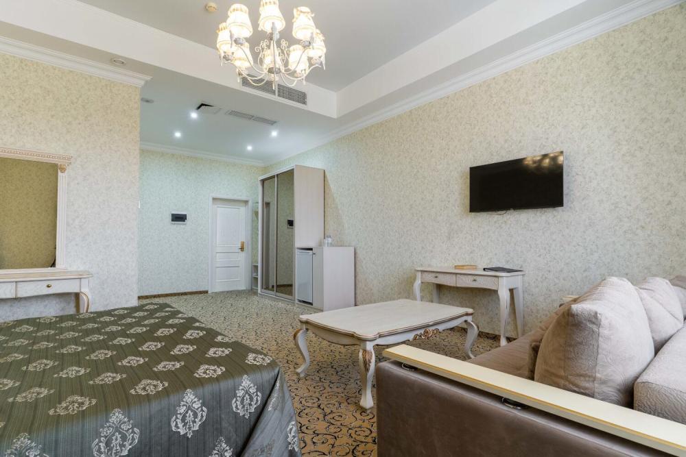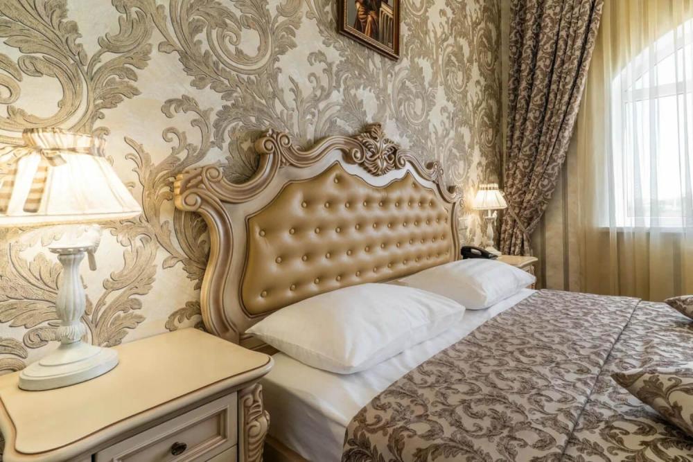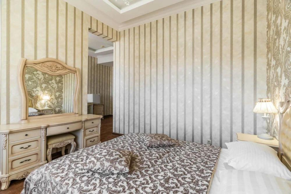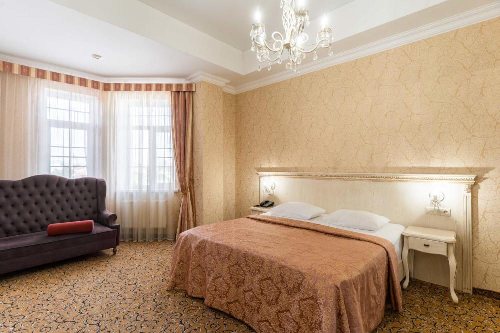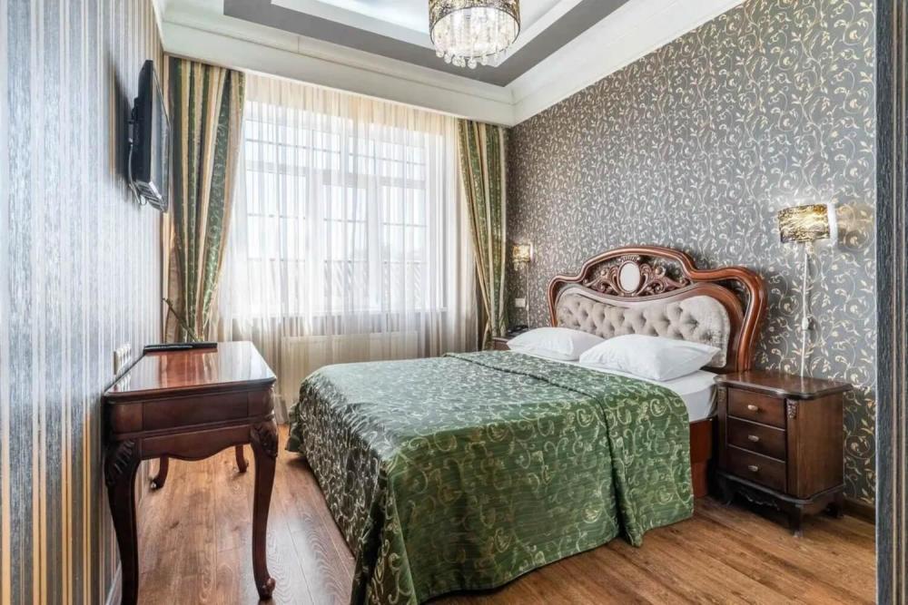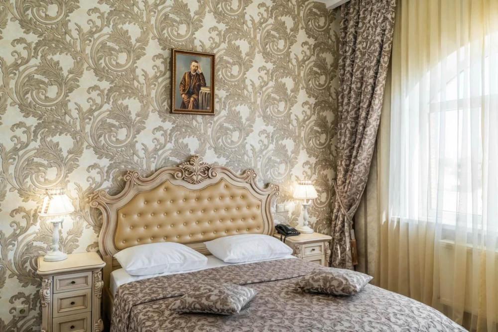 Номер выдержан в атмосфере аристократической роскоши. Предусмотрены отдельные зоны для сна и общения. В номере есть все необходимое для комфорта гостей — двуспальная кровать, шкаф-купе, мягкая мебель, телевизор, рабочий стол со стульями, сейф. Санузел оснащен большой ванной и биде. Для гостей предоставляются полотенца, халаты, тапочки, фен, набор туалетно-косметических принадлежностей.