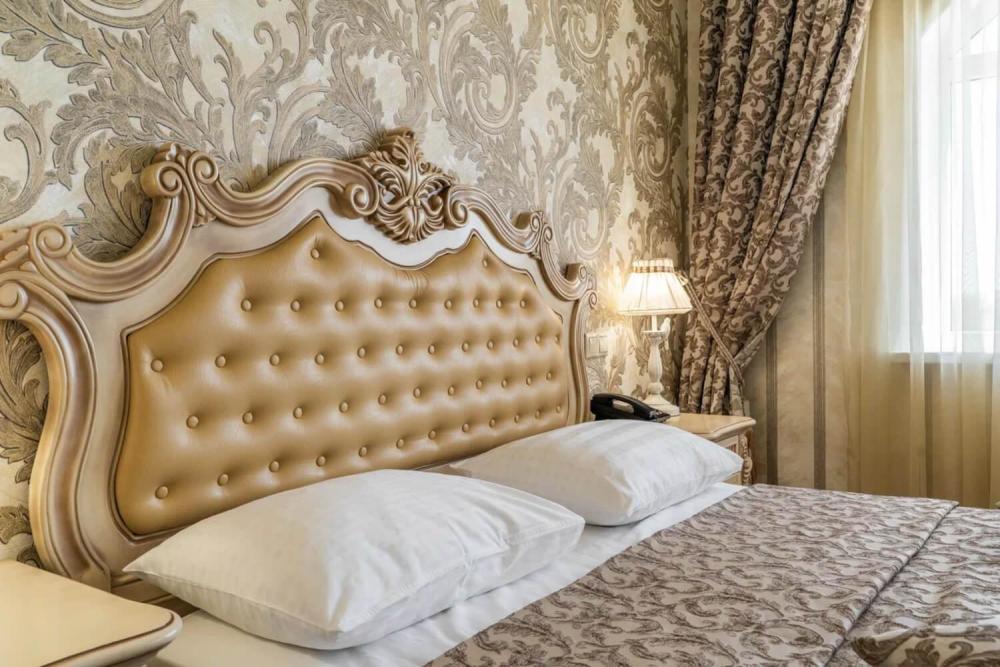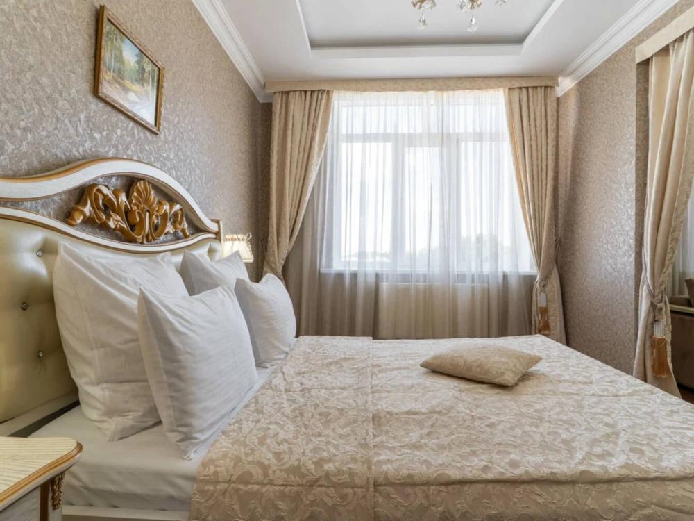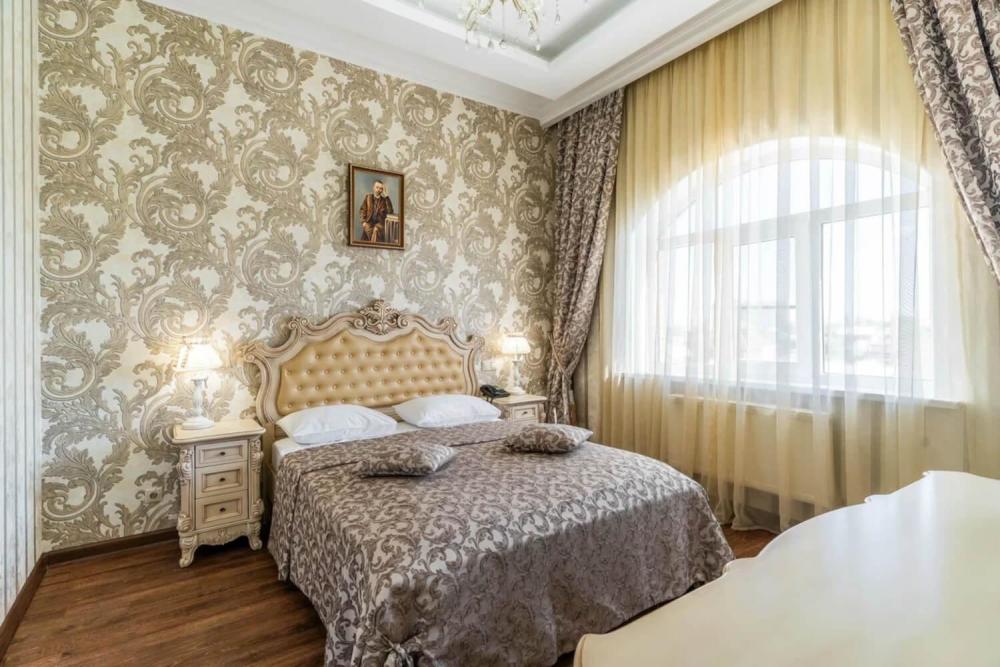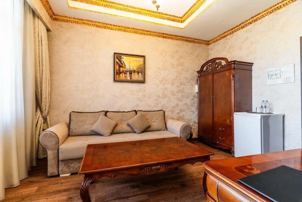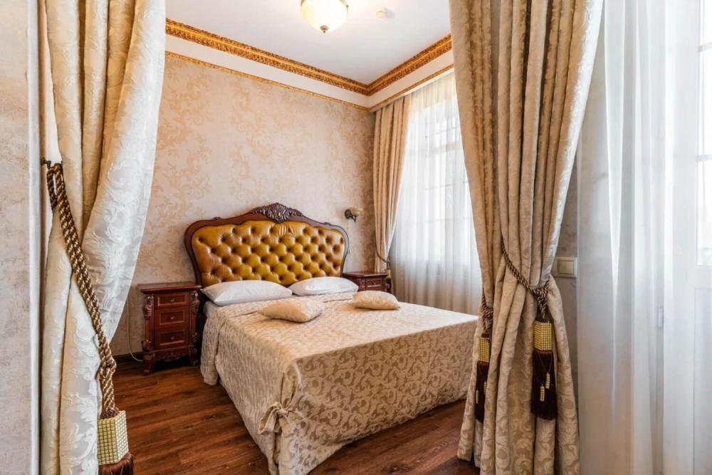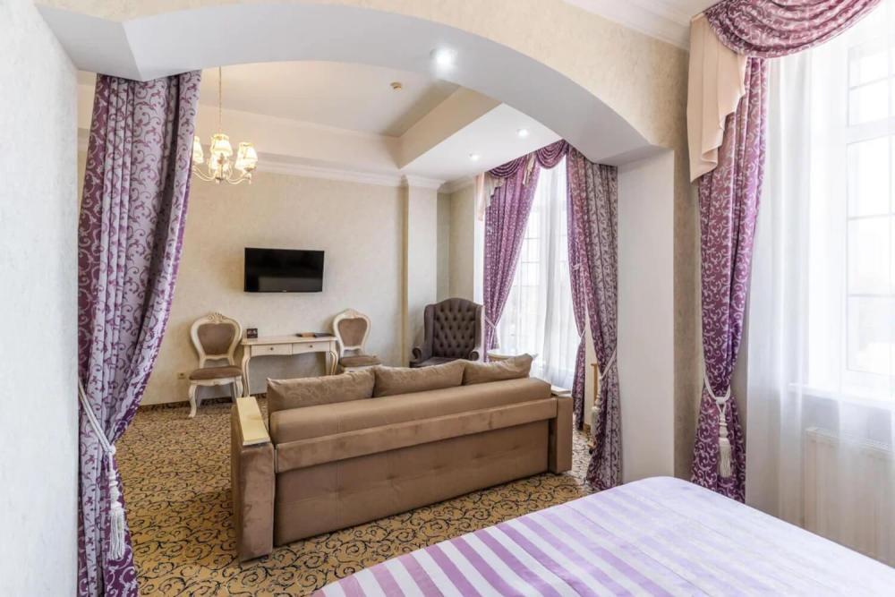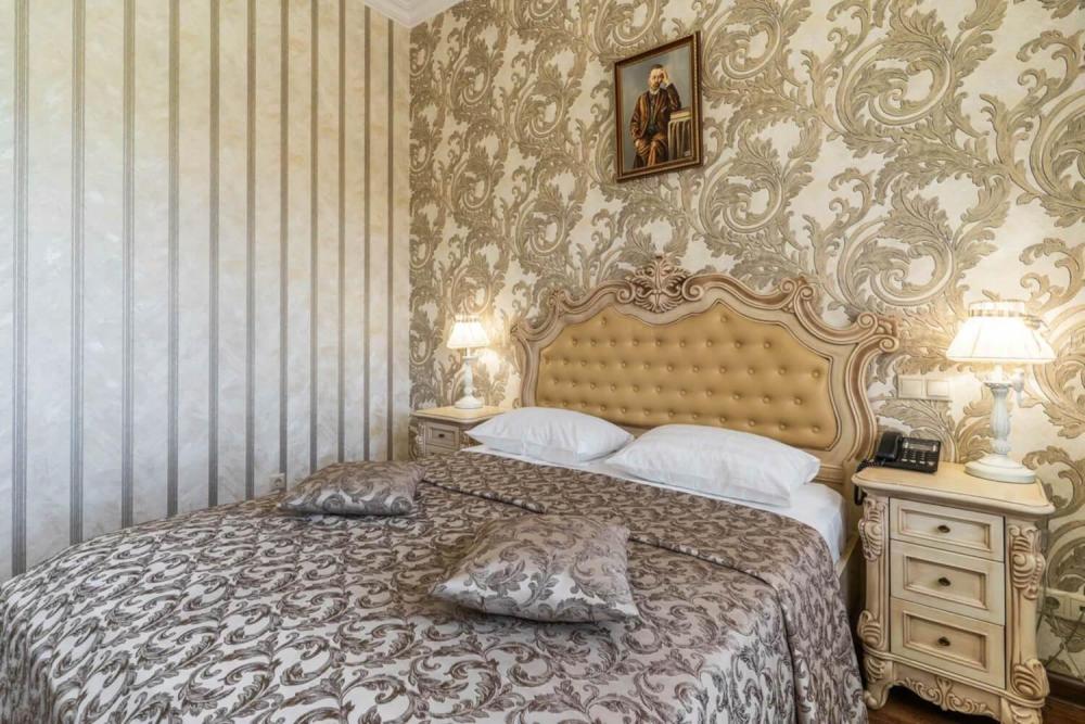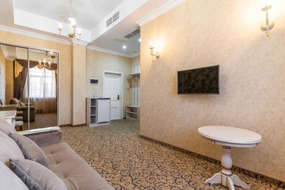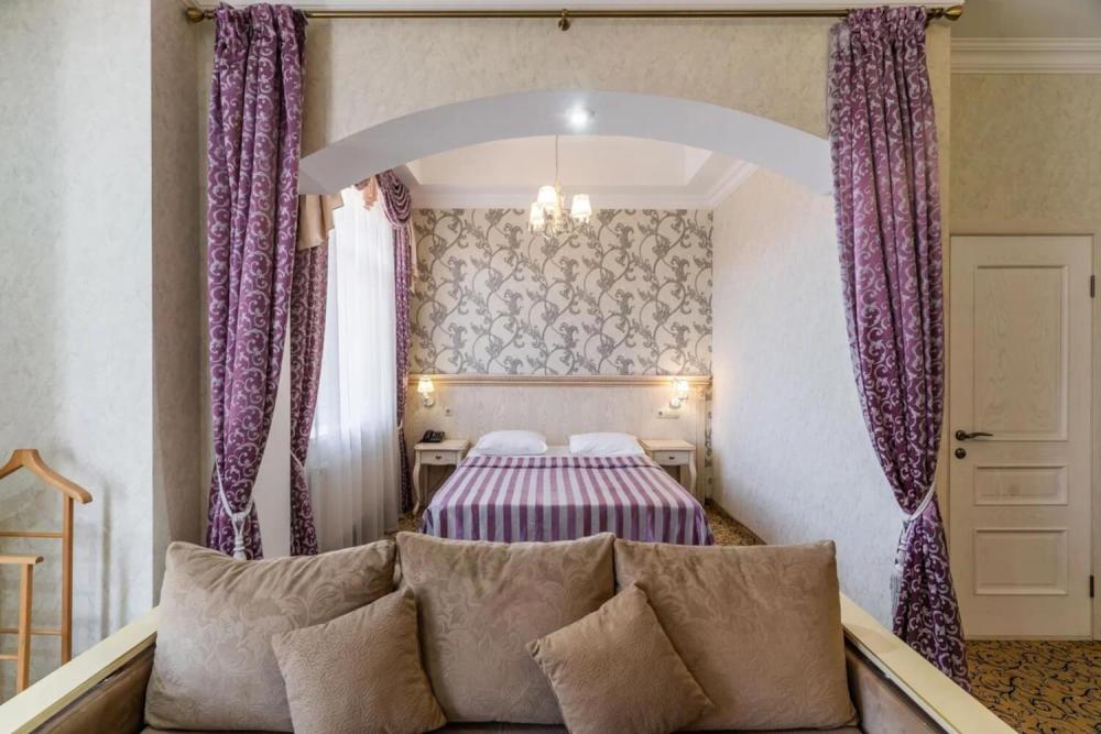 Номер выдержан в атмосфере аристократической роскоши. Предусмотрены отдельные зоны для сна и общения. В номере есть все необходимое для комфорта гостей — двуспальная кровать, шкаф-купе, мягкая мебель, телевизор, рабочий стол со стульями, сейф. Санузел оснащен большой ванной и биде. Для гостей предоставляются полотенца, халаты, тапочки, фен, набор туалетно-косметических принадлежностей.