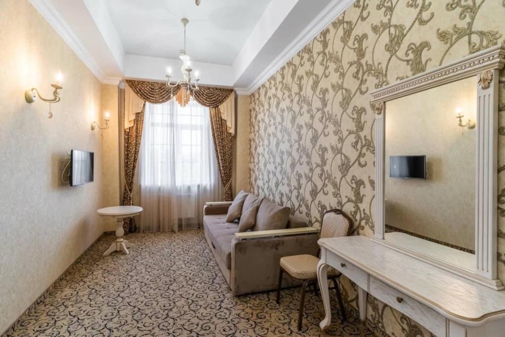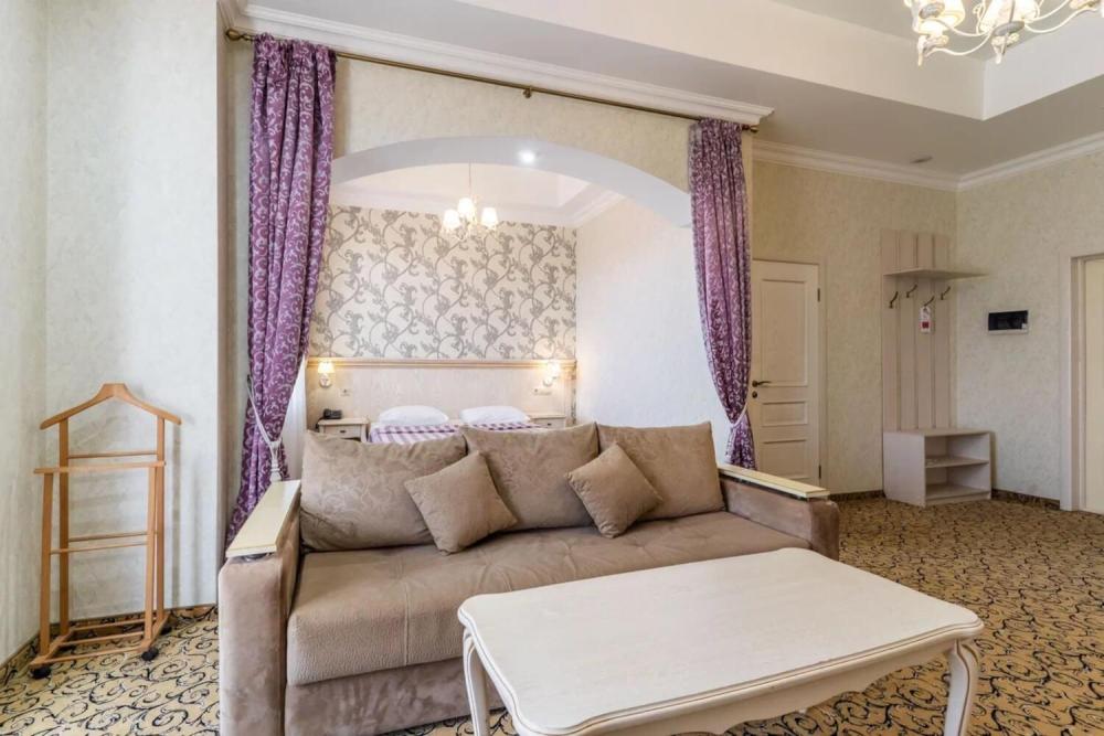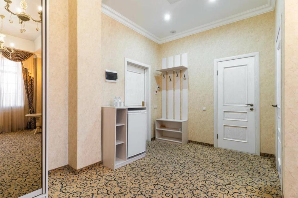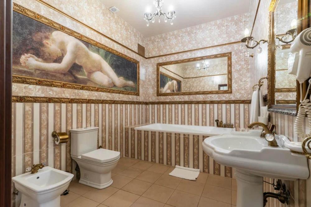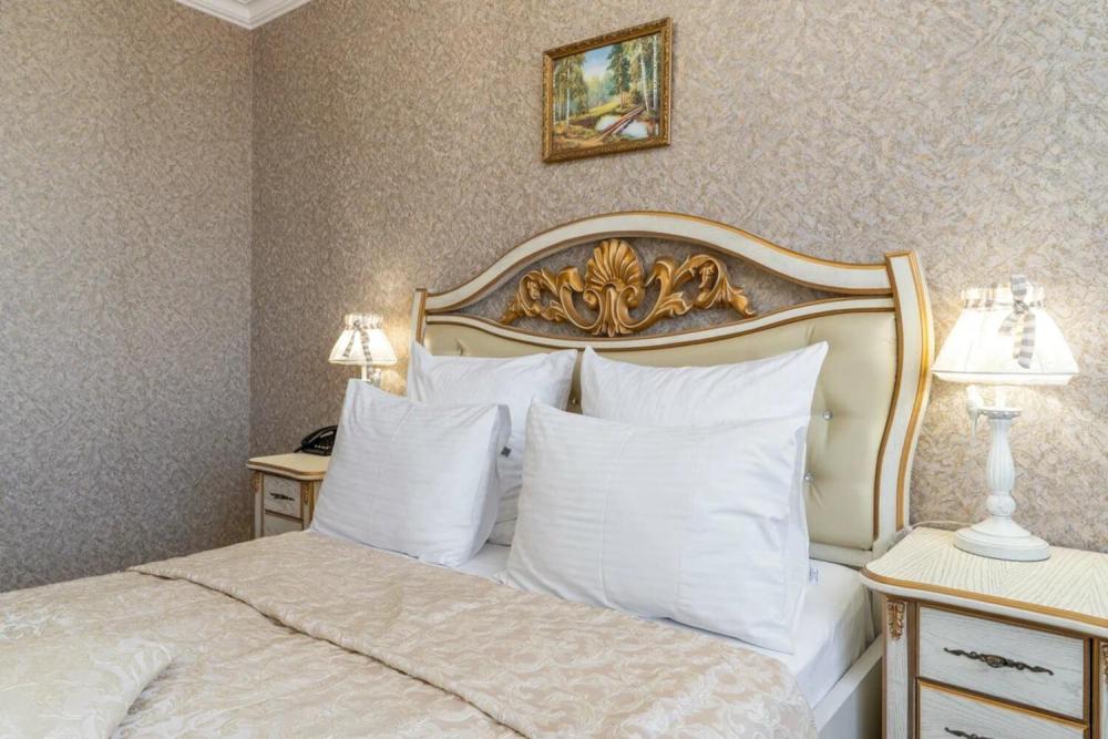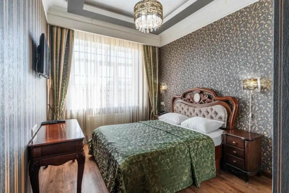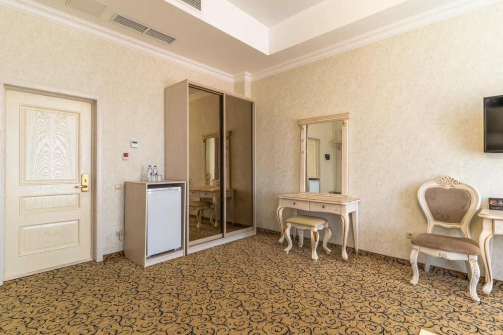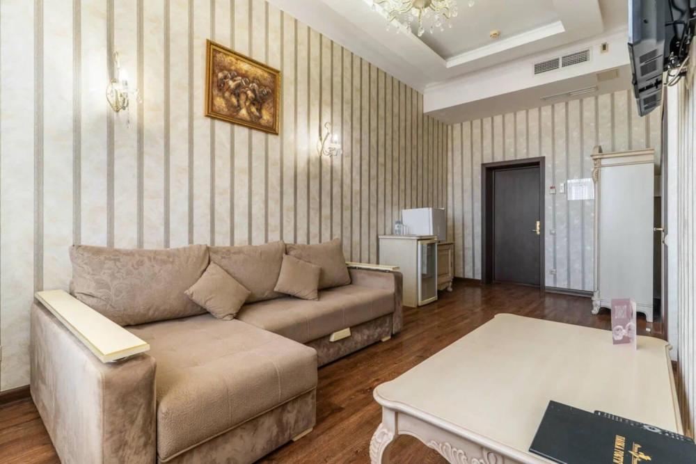 Номер выдержан в атмосфере аристократической роскоши. Предусмотрены отдельные зоны для сна и общения. В номере есть все необходимое для комфорта гостей — двуспальная кровать, шкаф-купе, мягкая мебель, телевизор, рабочий стол со стульями, сейф. Санузел оснащен большой ванной и биде. Для гостей предоставляются полотенца, халаты, тапочки, фен, набор туалетно-косметических принадлежностей.