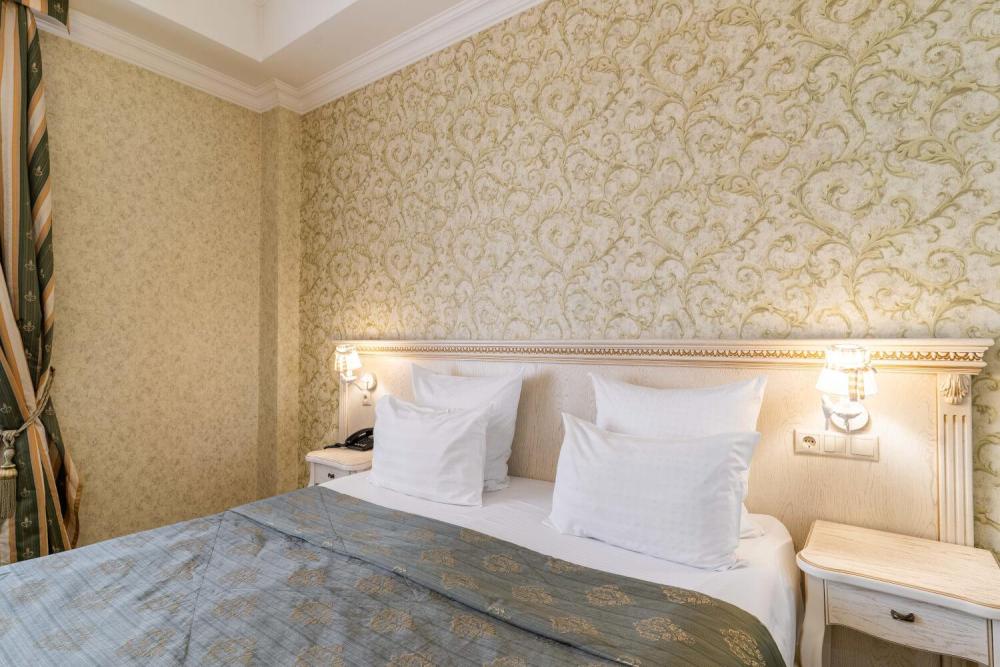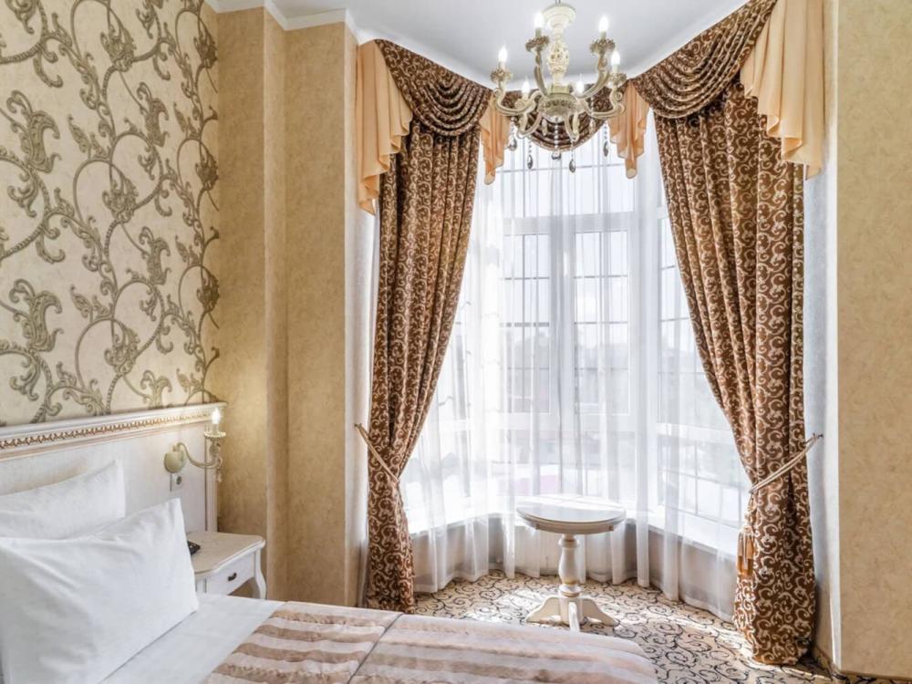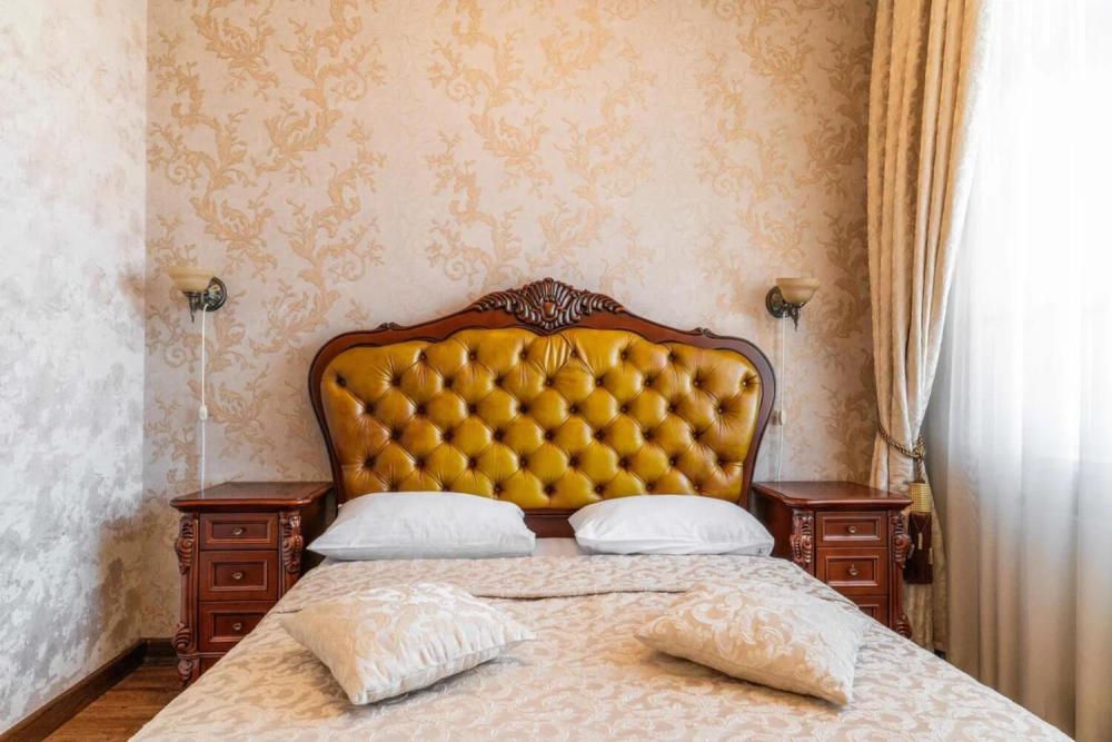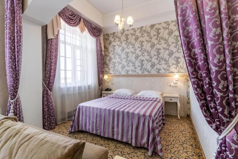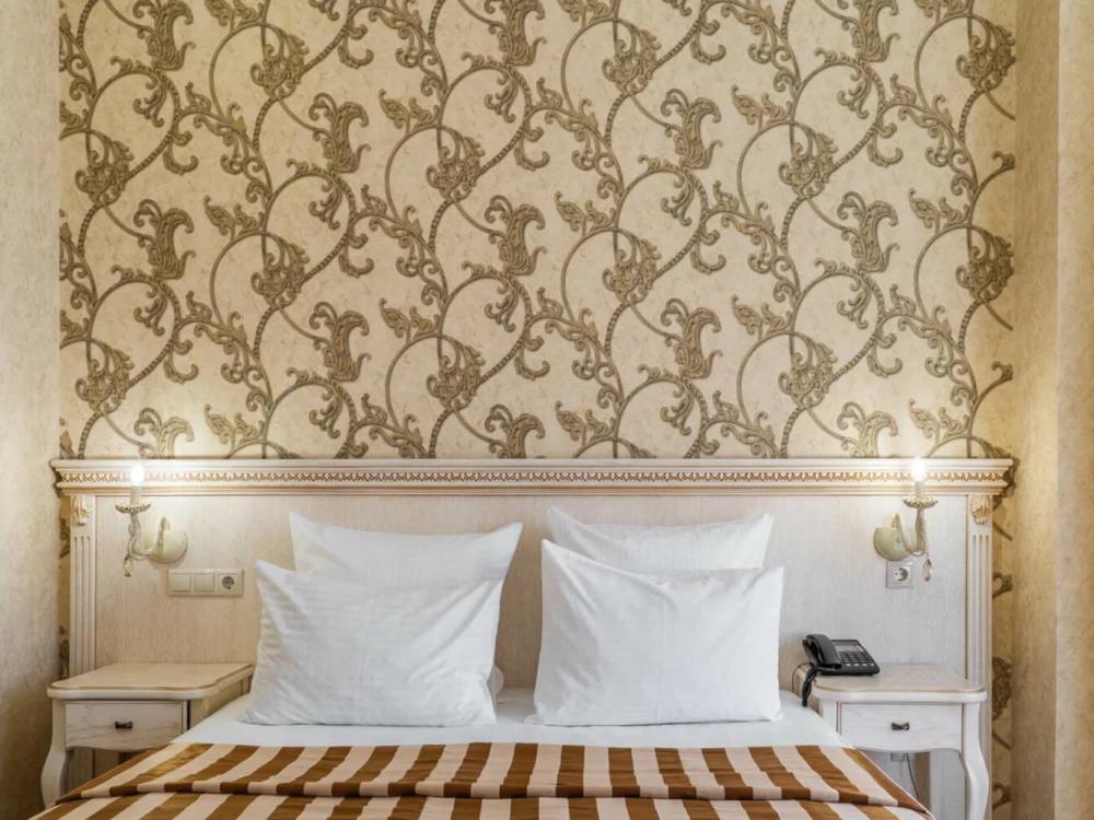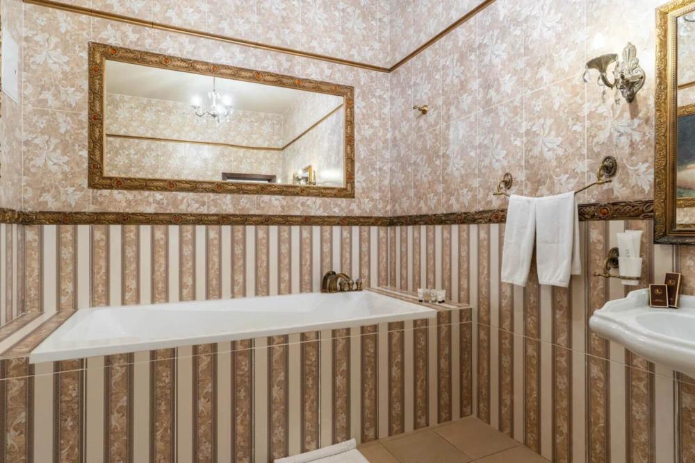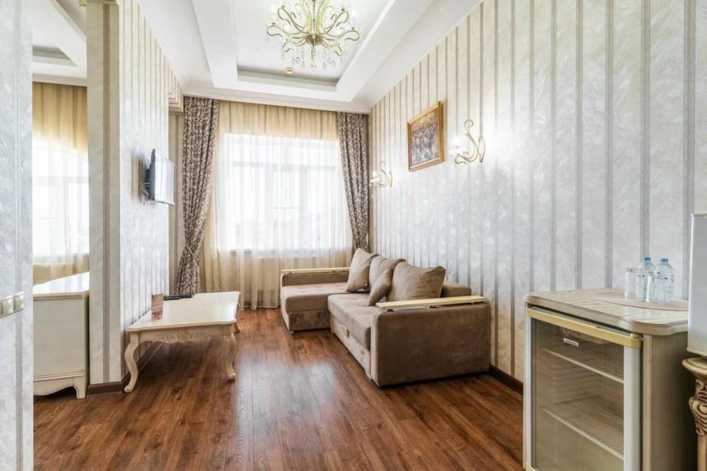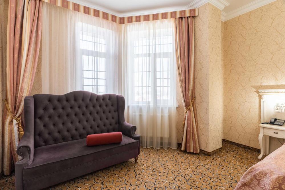 Номер выдержан в атмосфере аристократической роскоши. Предусмотрены отдельные зоны для сна и общения. В номере есть все необходимое для комфорта гостей — двуспальная кровать, шкаф-купе, мягкая мебель, телевизор, рабочий стол со стульями, сейф. Санузел оснащен большой ванной и биде. Для гостей предоставляются полотенца, халаты, тапочки, фен, набор туалетно-косметических принадлежностей.