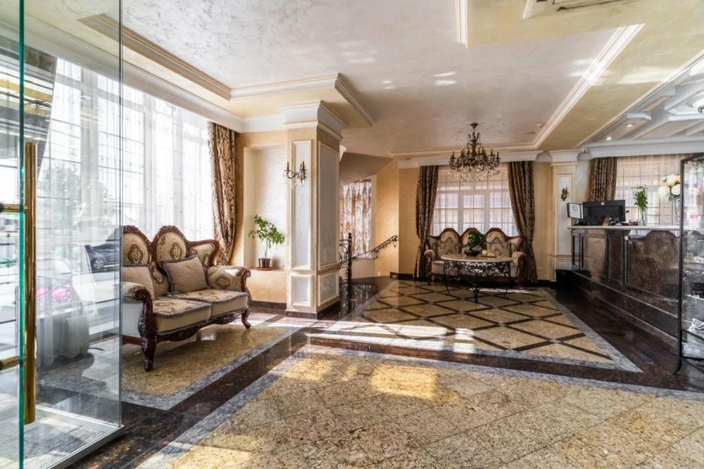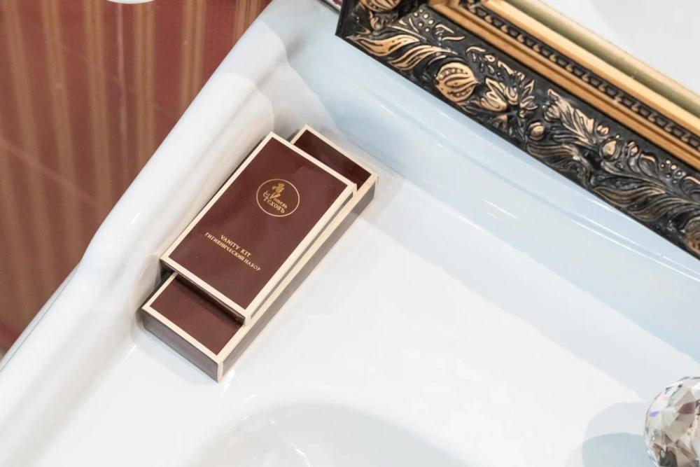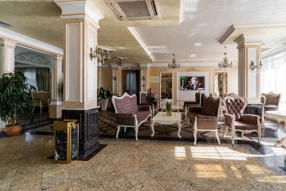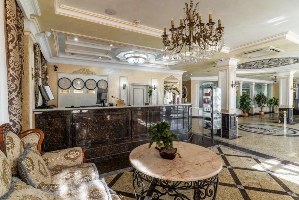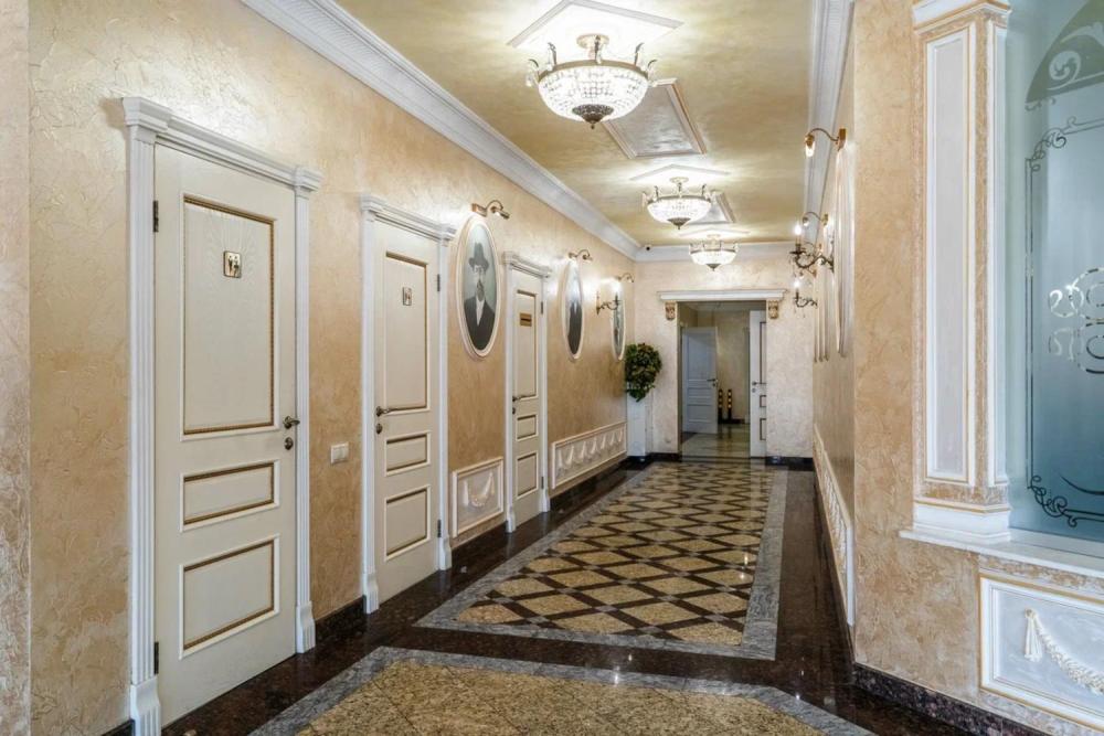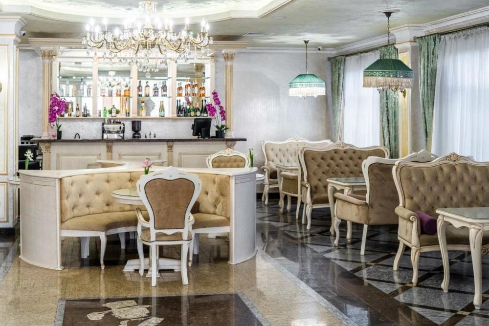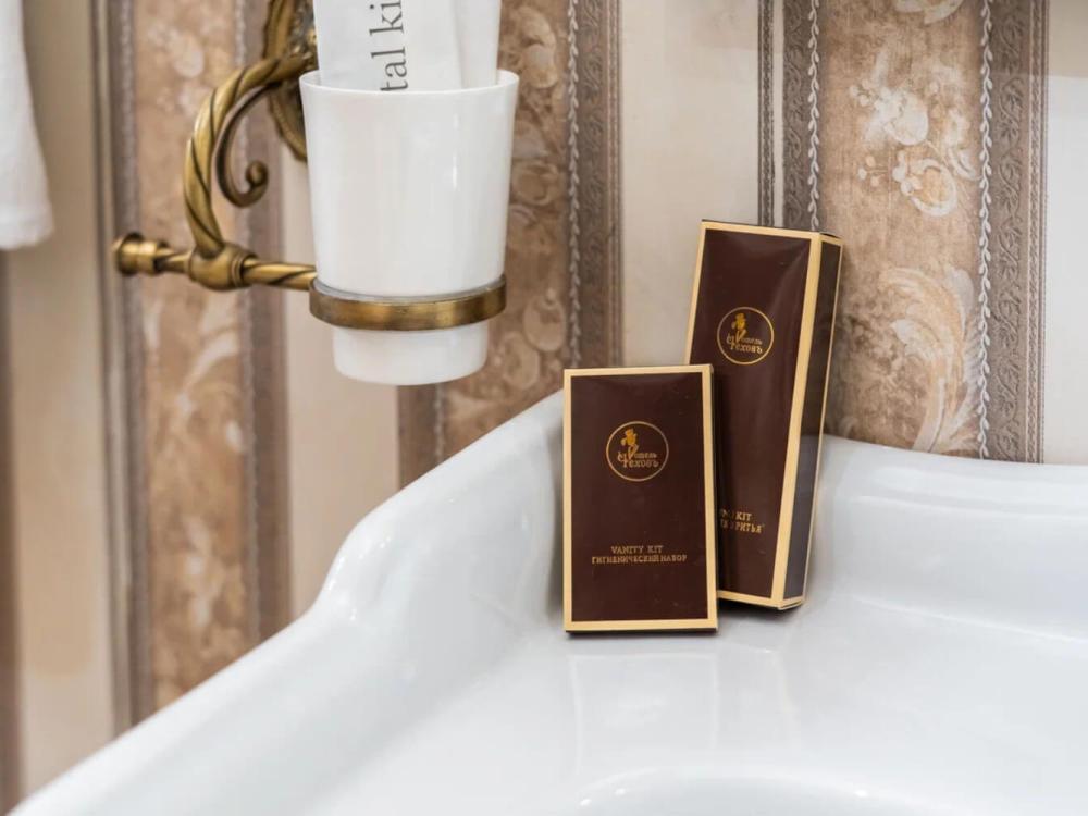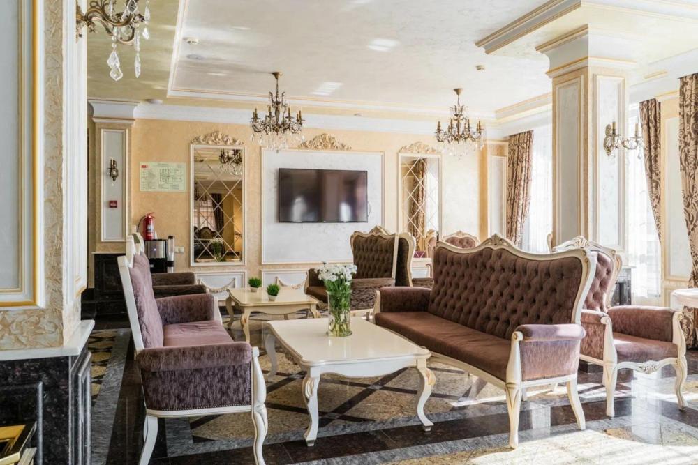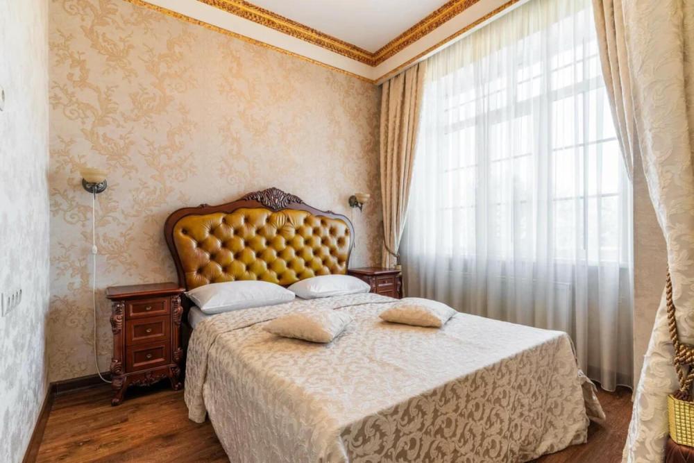 Номер выдержан в атмосфере аристократической роскоши. Предусмотрены отдельные зоны для сна и общения. В номере есть все необходимое для комфорта гостей — двуспальная кровать, шкаф-купе, мягкая мебель, телевизор, рабочий стол со стульями, сейф. Санузел оснащен большой ванной и биде. Для гостей предоставляются полотенца, халаты, тапочки, фен, набор туалетно-косметических принадлежностей.