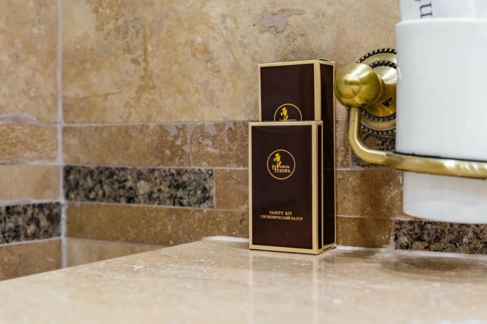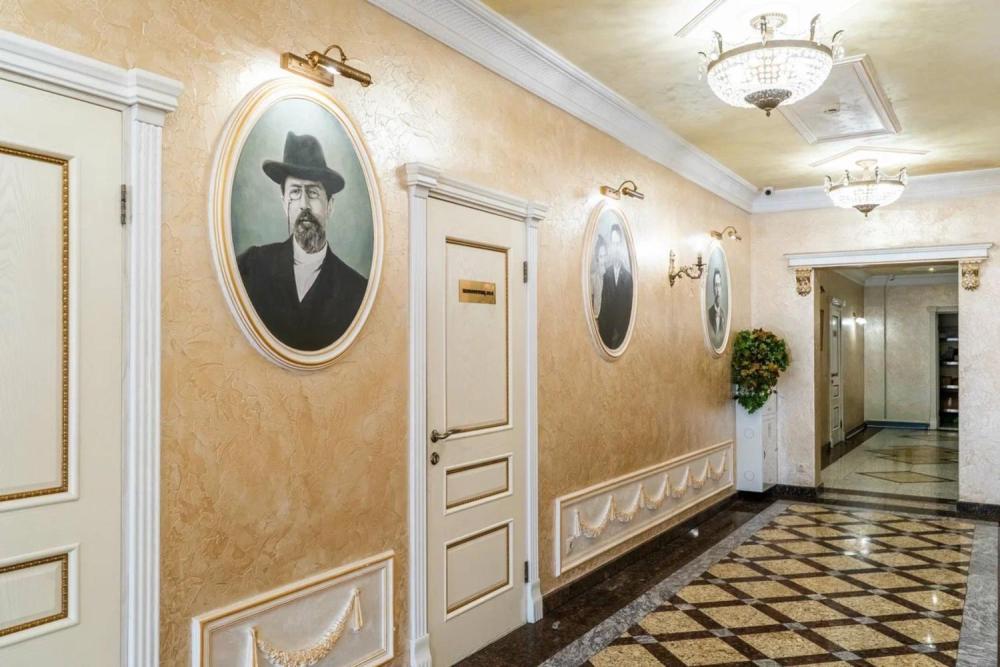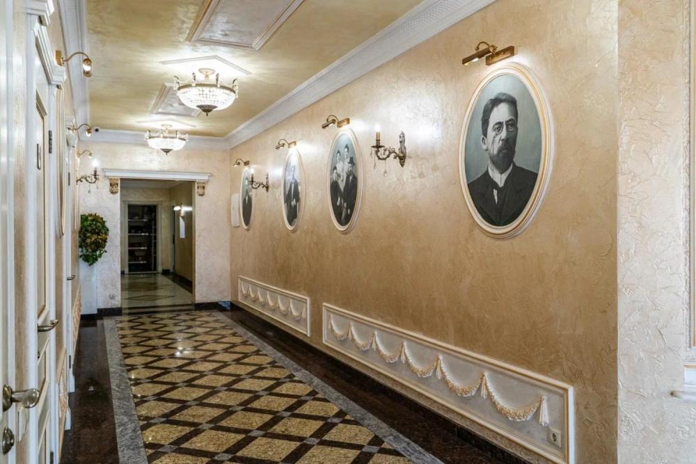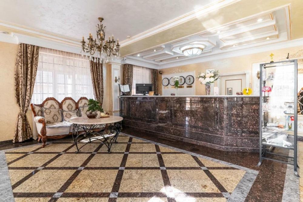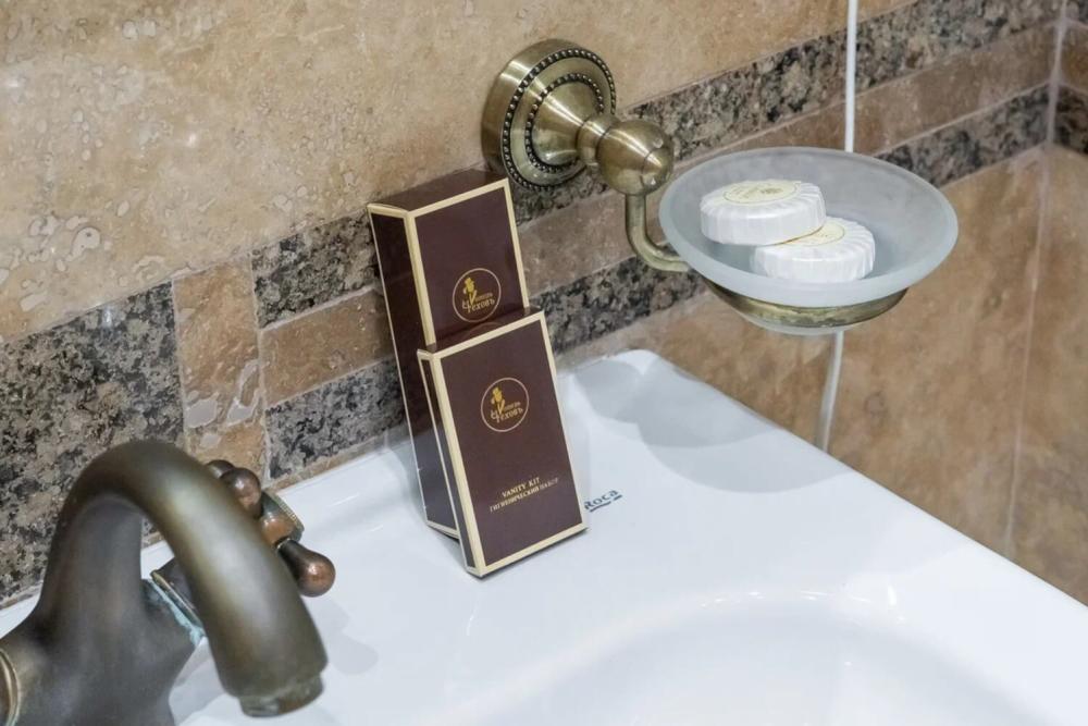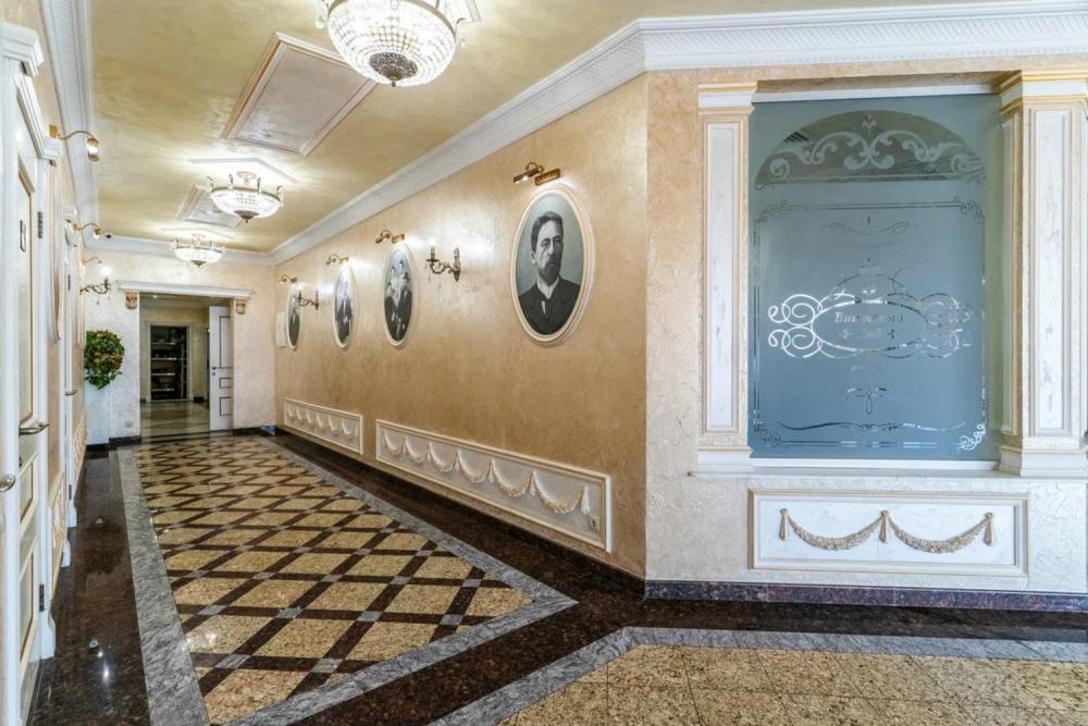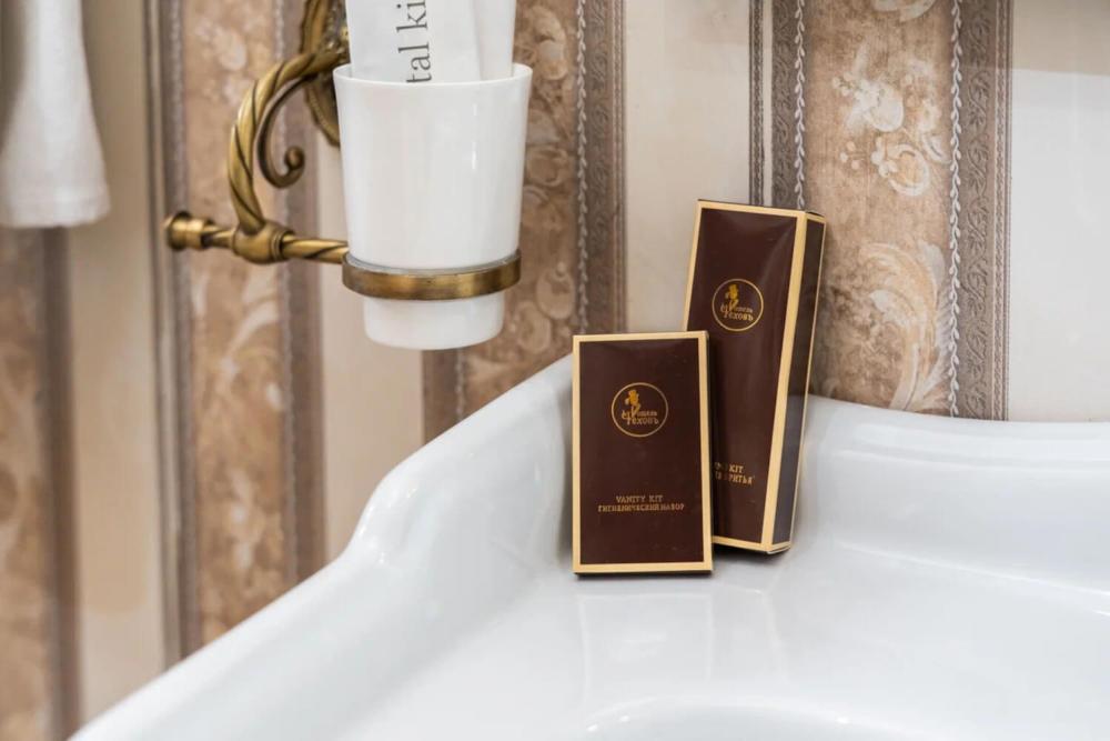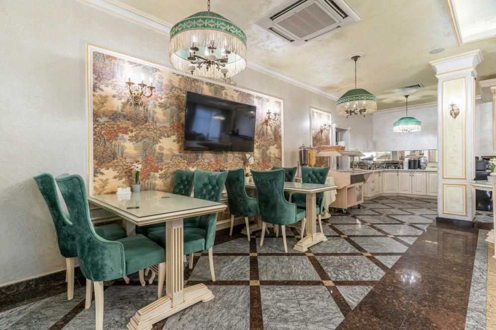 Номер выдержан в атмосфере аристократической роскоши. Предусмотрены отдельные зоны для сна и общения. В номере есть все необходимое для комфорта гостей — двуспальная кровать, шкаф-купе, мягкая мебель, телевизор, рабочий стол со стульями, сейф. Санузел оснащен большой ванной и биде. Для гостей предоставляются полотенца, халаты, тапочки, фен, набор туалетно-косметических принадлежностей.