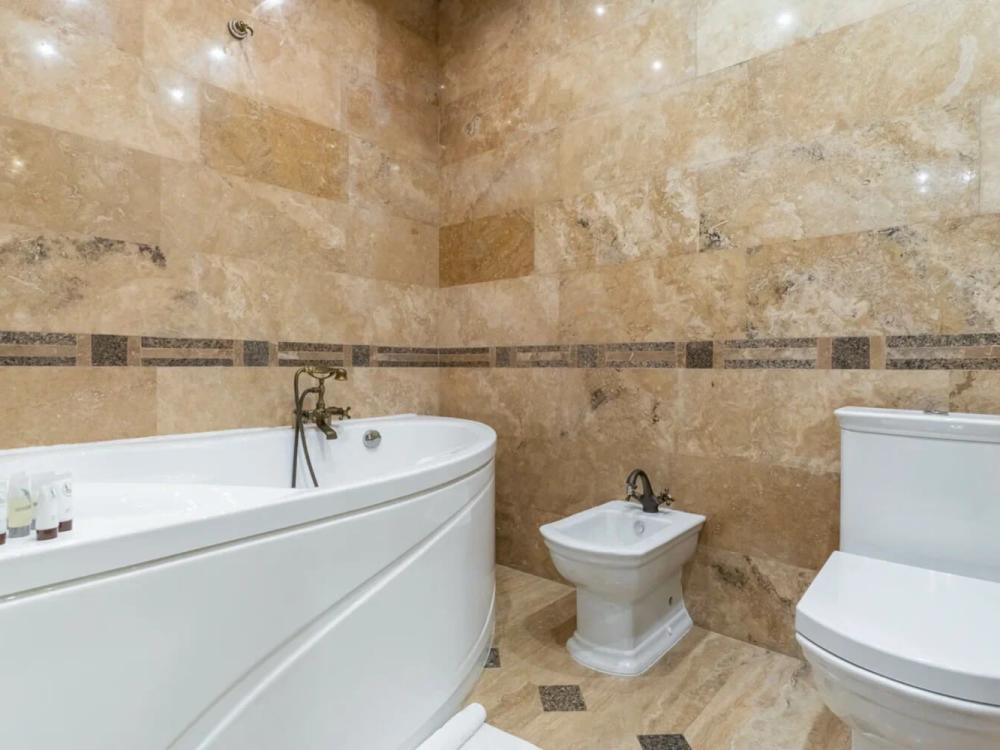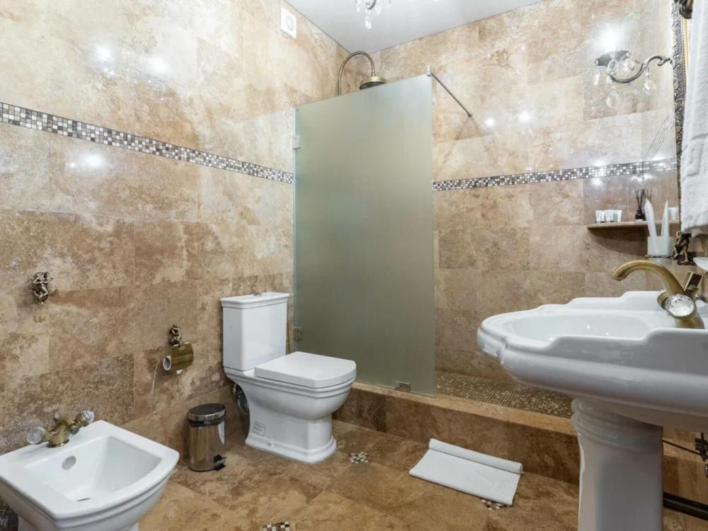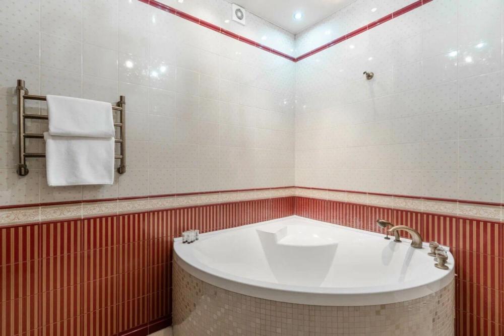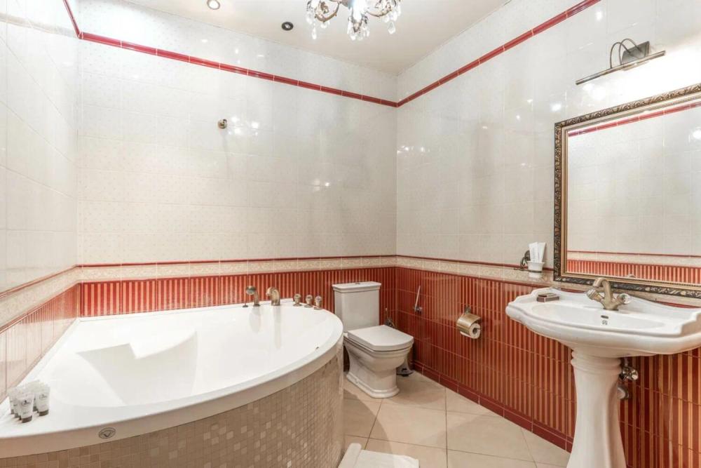 Трех комнатные апартаменты площадью 115 квадратов, гостиная и две спальни. Большой бассейн с гейзером и водопадом, своя парная. Гостиная с мягкой зоной и телевизором 55” дюймов а также домашним кинотеатром. Две спальни, каждая из которой выполнена в индивидуальном стиле. В этом номере ванная комната с душем разделены от санузла. В комплектации есть все необходимое:полотенца, халаты, туалетно-косметические принадлежности и тапочки. Вечером горничная любезно подготовит номер ко сну, чтобы Вы не утруждали себя проветриванием номера, подготовкой постельных принадлежностей, или каких либо необходимых мелочей.