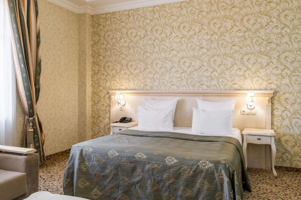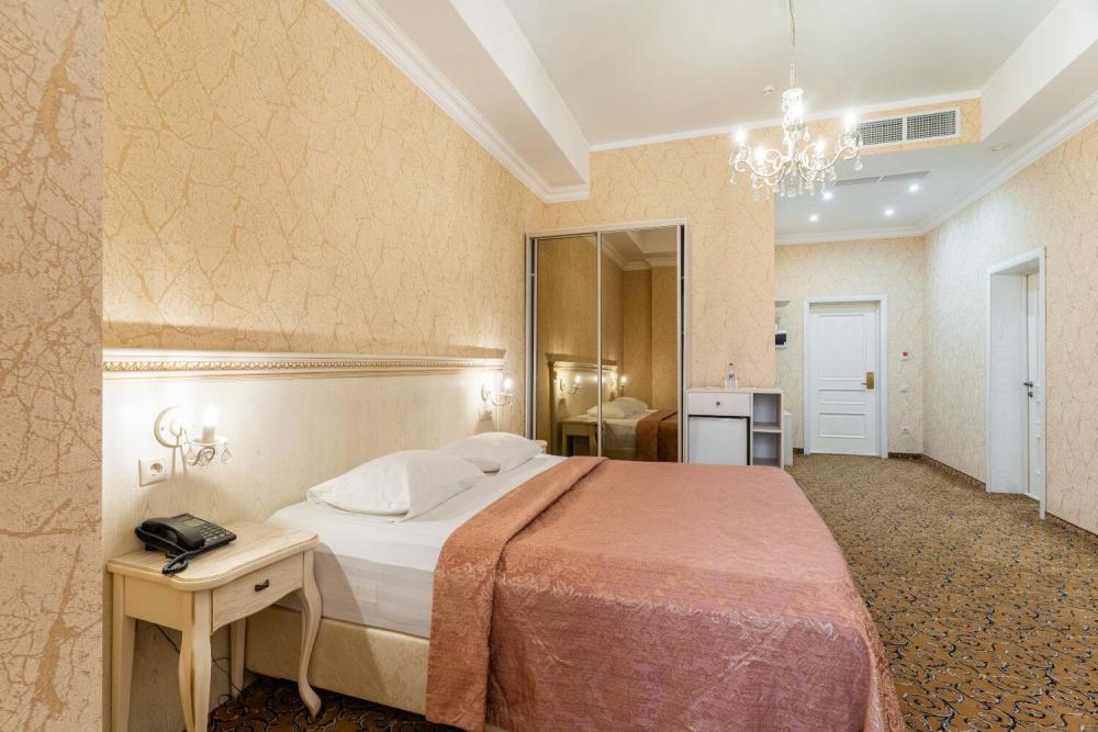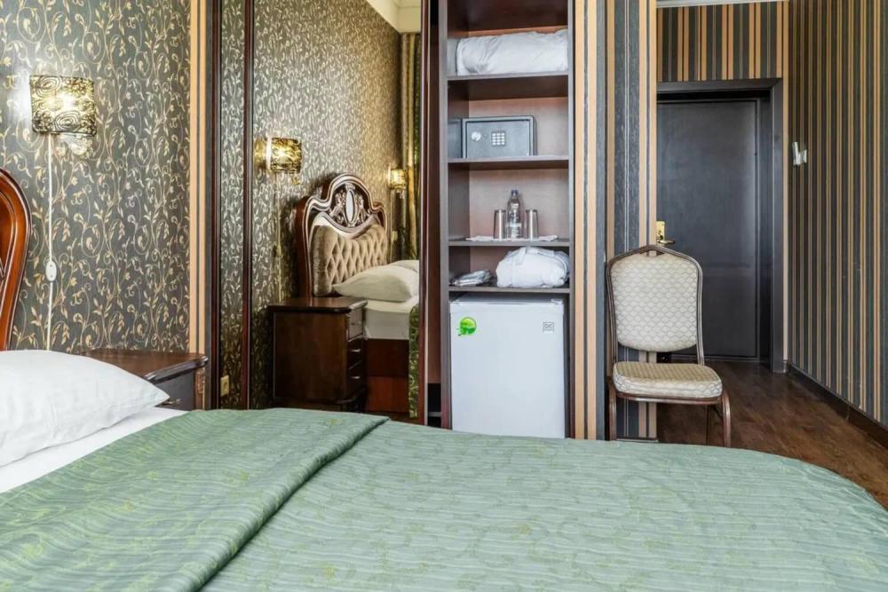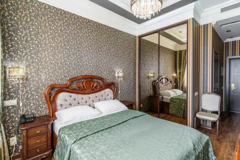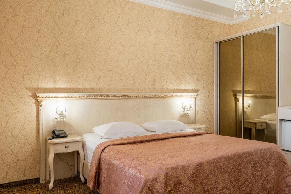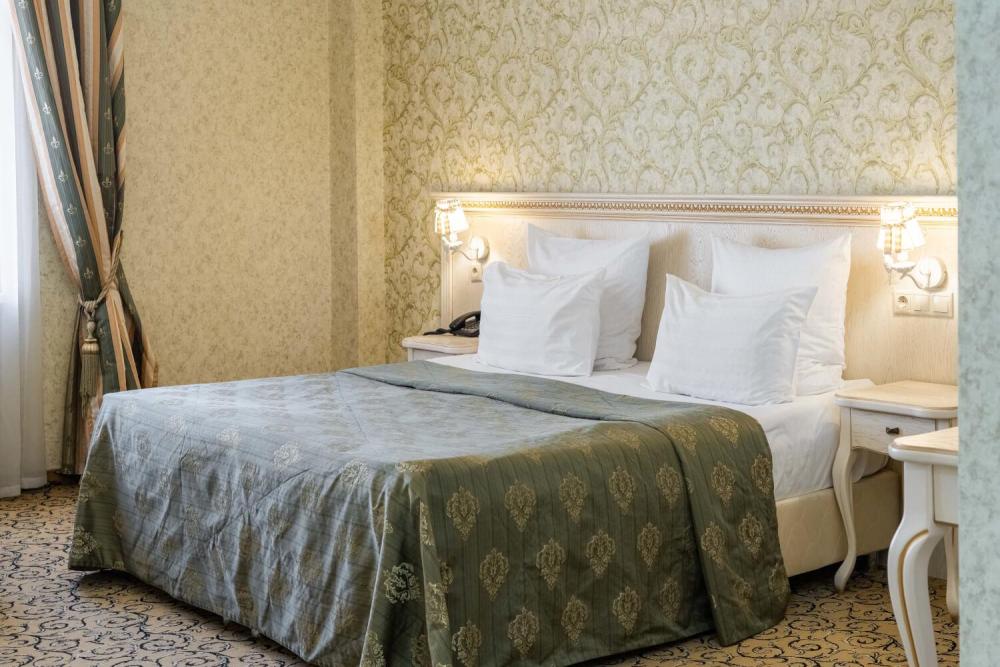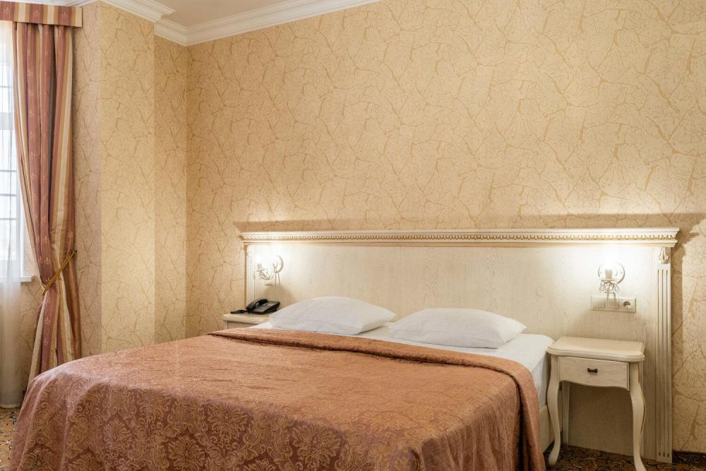 Классический номер с сдержанным интерьером, оборудованный двуспальной кроватью, прикроватными тумбами с прикроватными бра а также рабочим столом и ТВ с доступом в интернет. Шкаф-купе с вешалками и полками, сейф и мини-бар. Также в номере имеется свой санузел с душевой кабиной укомплектованный полотенцами, халатами, тапочками и феном, а также туалетно-косметическими принадлежностями.