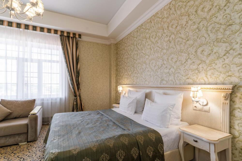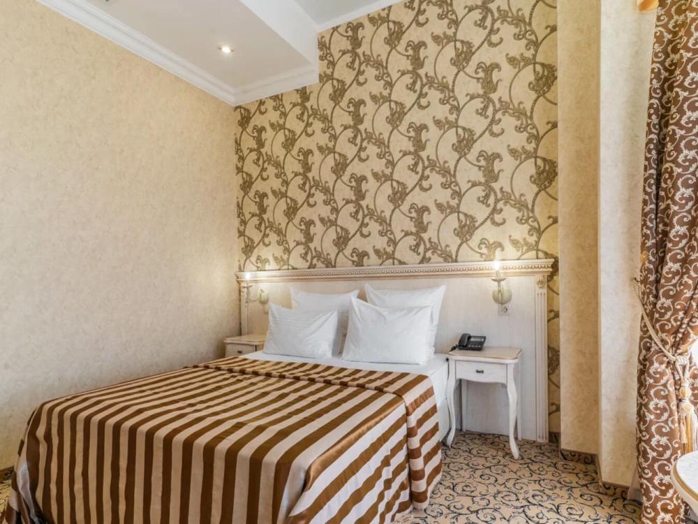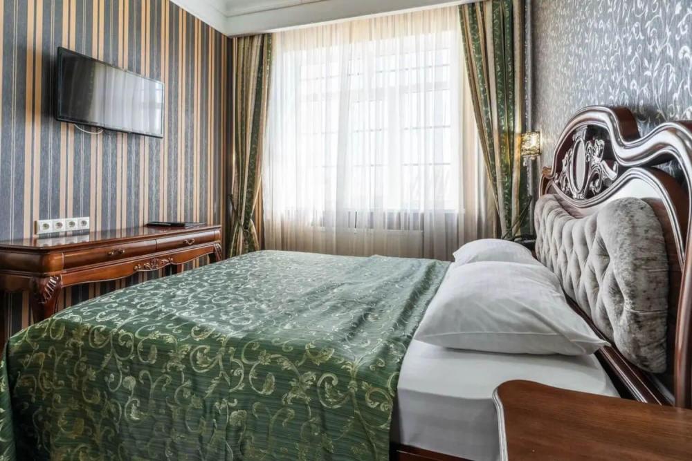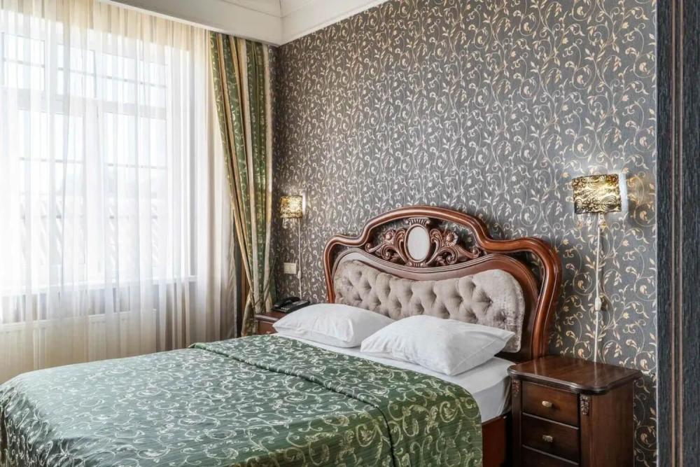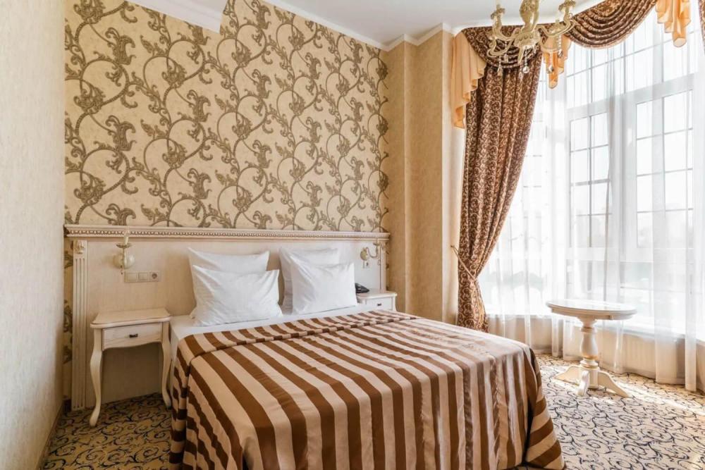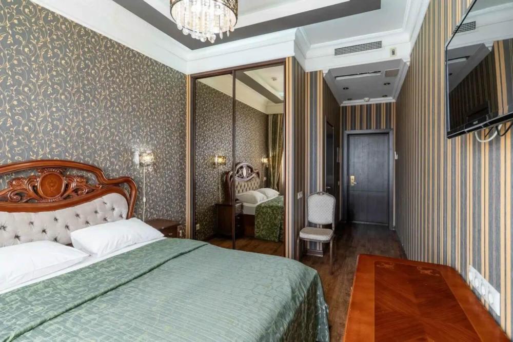 Классический номер с сдержанным интерьером, оборудованный двуспальной кроватью, прикроватными тумбами с прикроватными бра а также рабочим столом и ТВ с доступом в интернет. Шкаф-купе с вешалками и полками, сейф и мини-бар. Также в номере имеется свой санузел с душевой кабиной укомплектованный полотенцами, халатами, тапочками и феном, а также туалетно-косметическими принадлежностями.