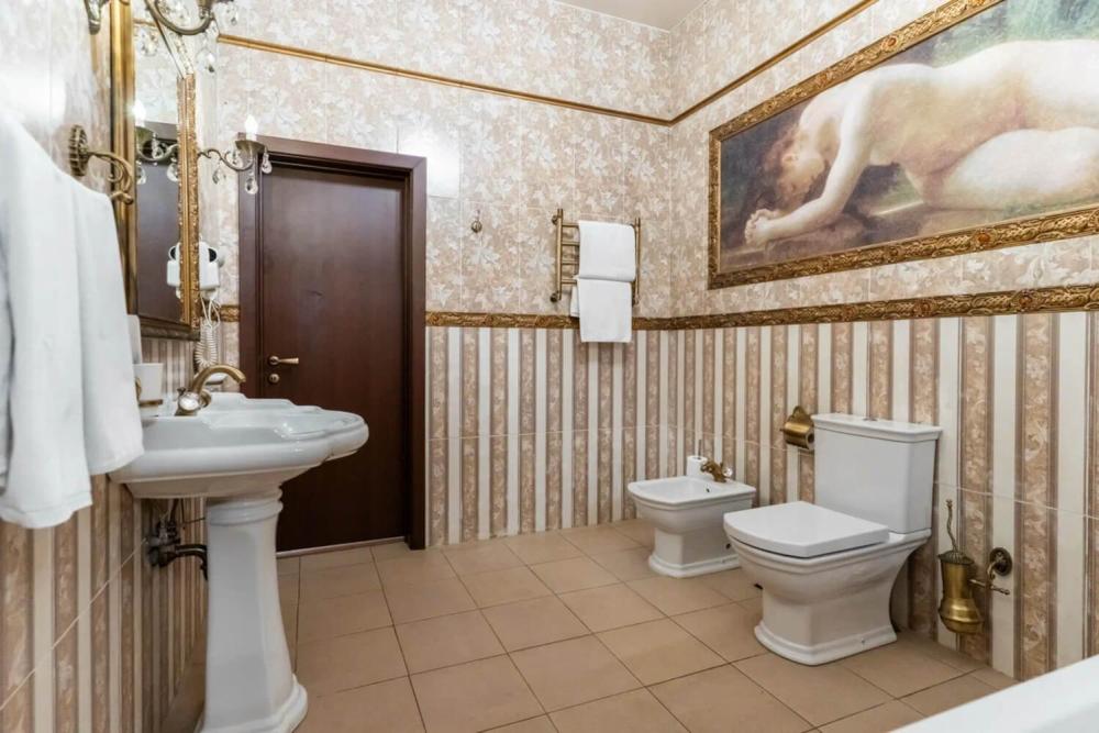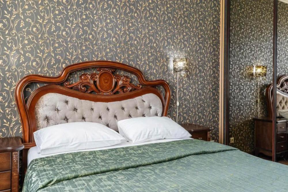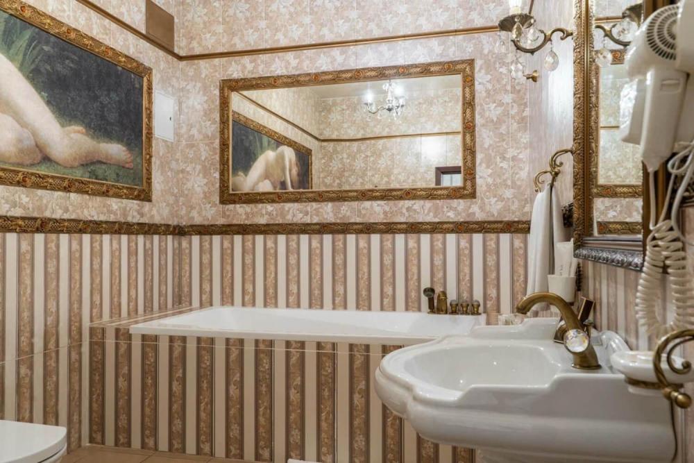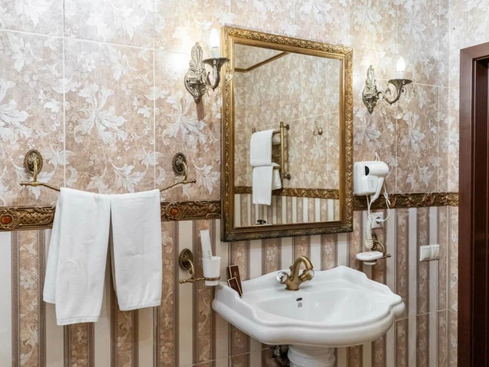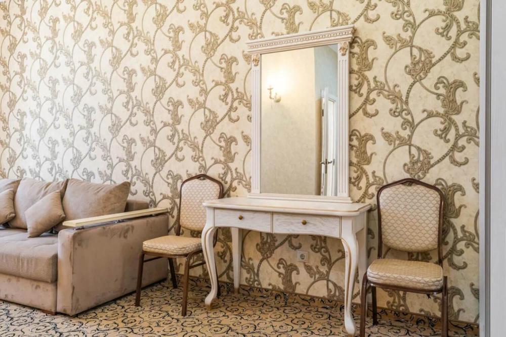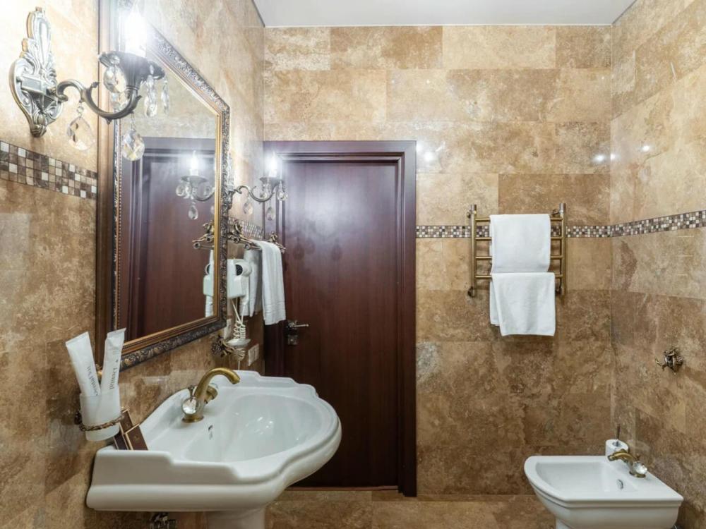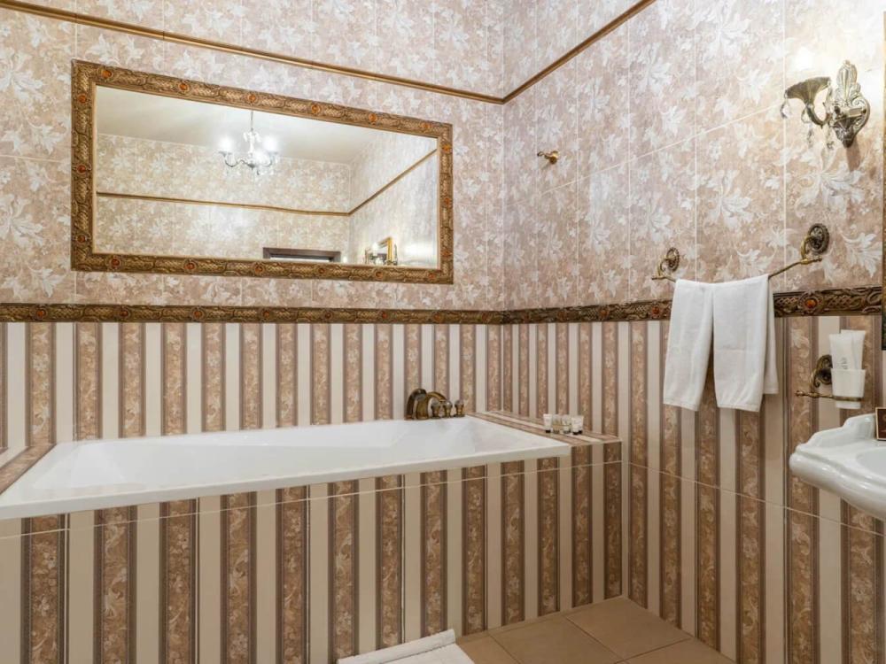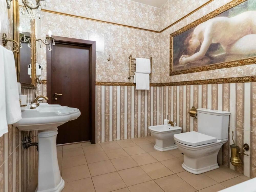Изысканный номер в классическом стиле состоит из гостиной и спальни. В номере есть все необходимое для комфортного проживания двух гостей — большая двуспальная кровать, распашной шкаф, мягкая мебель, трюмо с зеркалом, телевизор, сейф. Дизайнерская ванная оснащена большой ванной и биде. Для гостей предоставляются полотенца, халаты, тапочки, фен, набор туалетно-косметических принадлежностей.