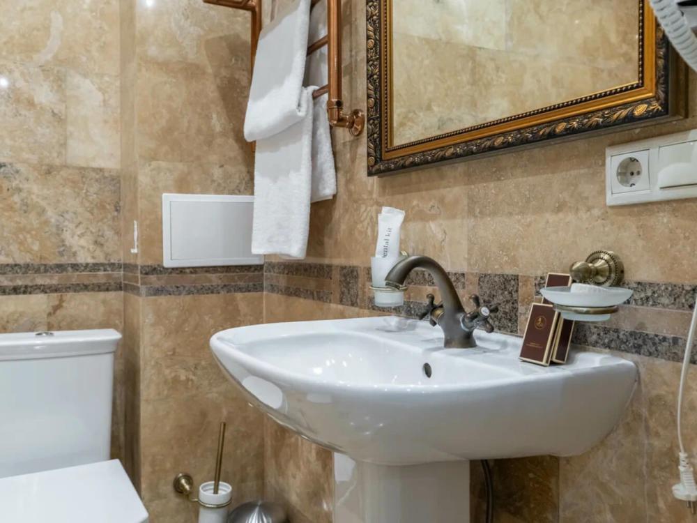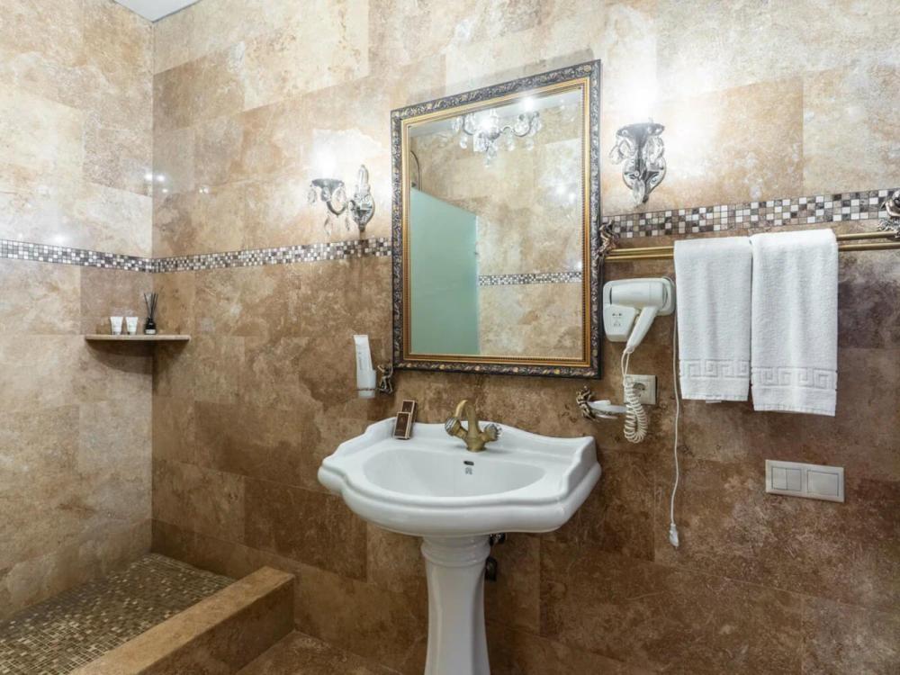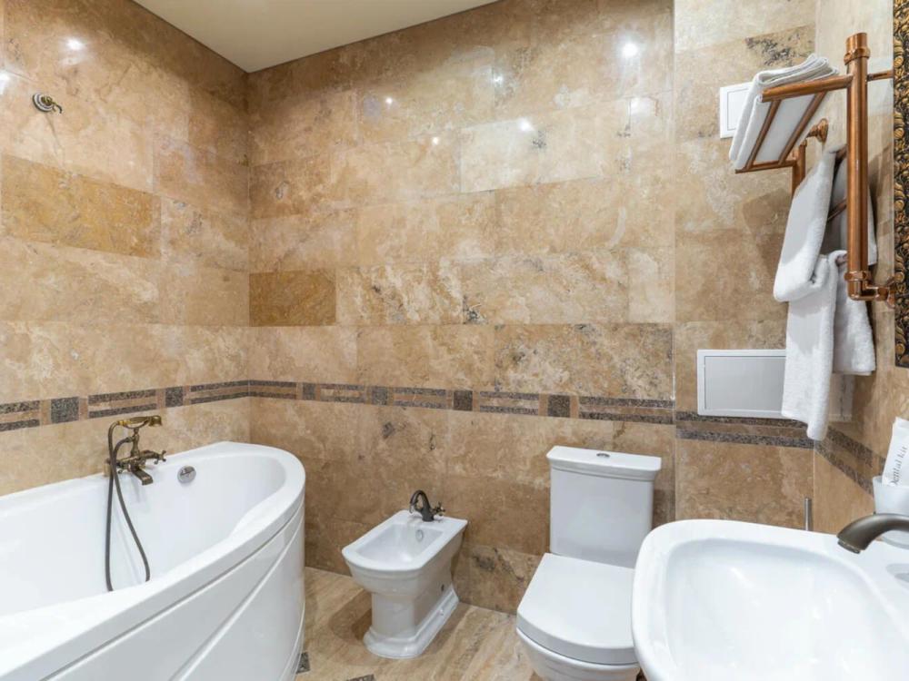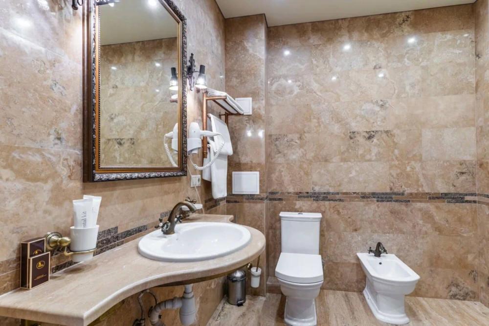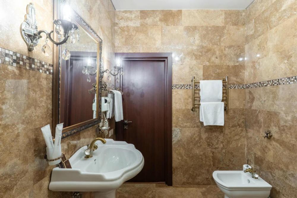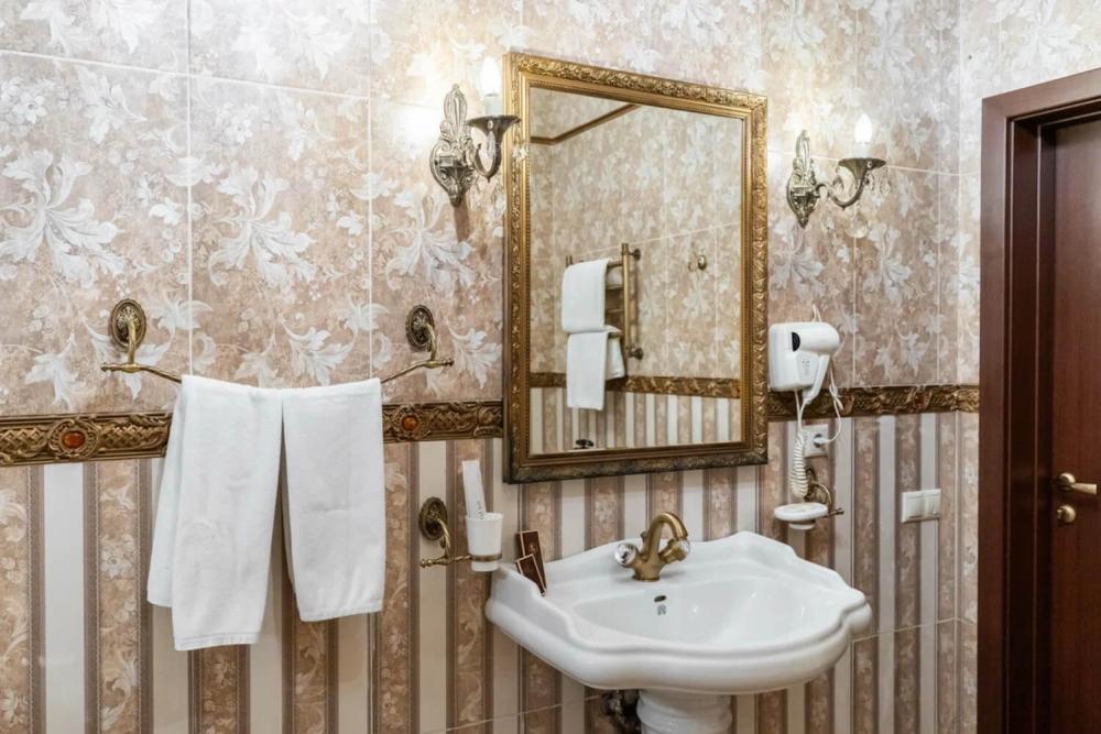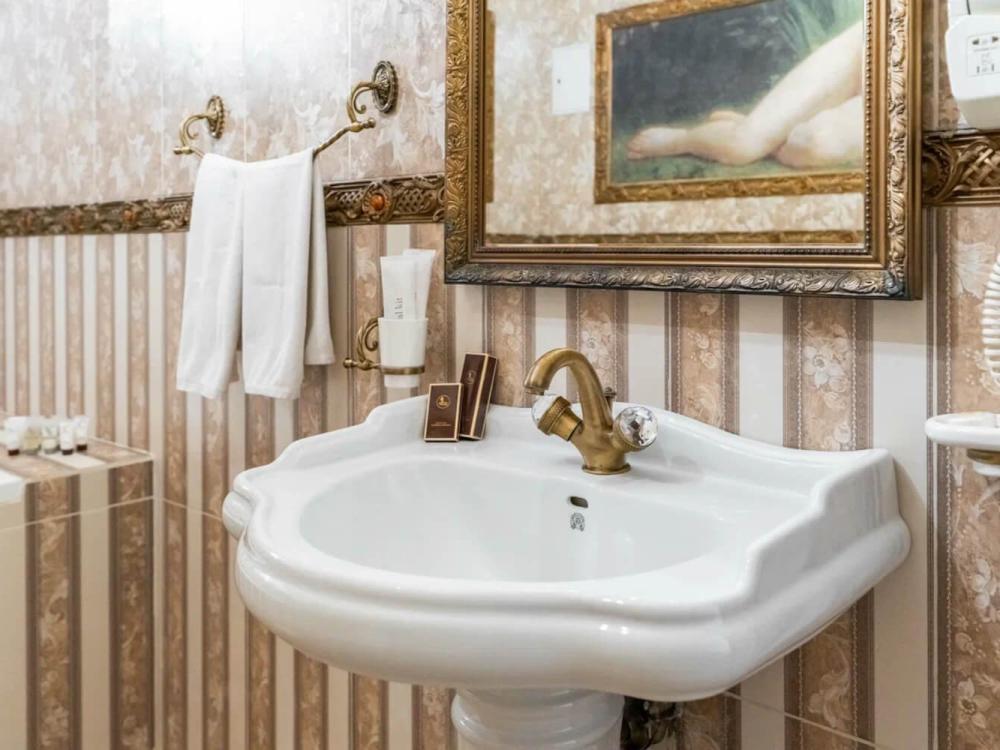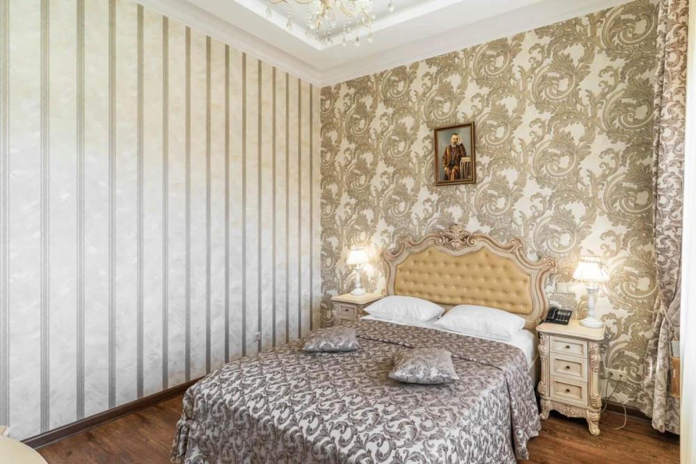 Изысканный номер в классическом стиле состоит из гостиной и спальни. В номере есть все необходимое для комфортного проживания двух гостей — большая двуспальная кровать, распашной шкаф, мягкая мебель, трюмо с зеркалом, телевизор, сейф. Дизайнерская ванная оснащена большой ванной и биде. Для гостей предоставляются полотенца, халаты, тапочки, фен, набор туалетно-косметических принадлежностей.