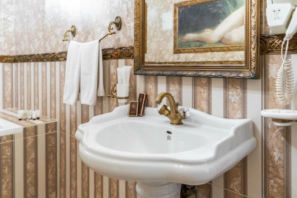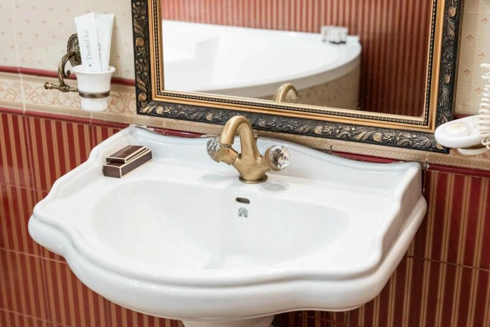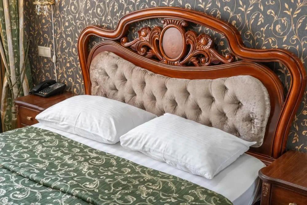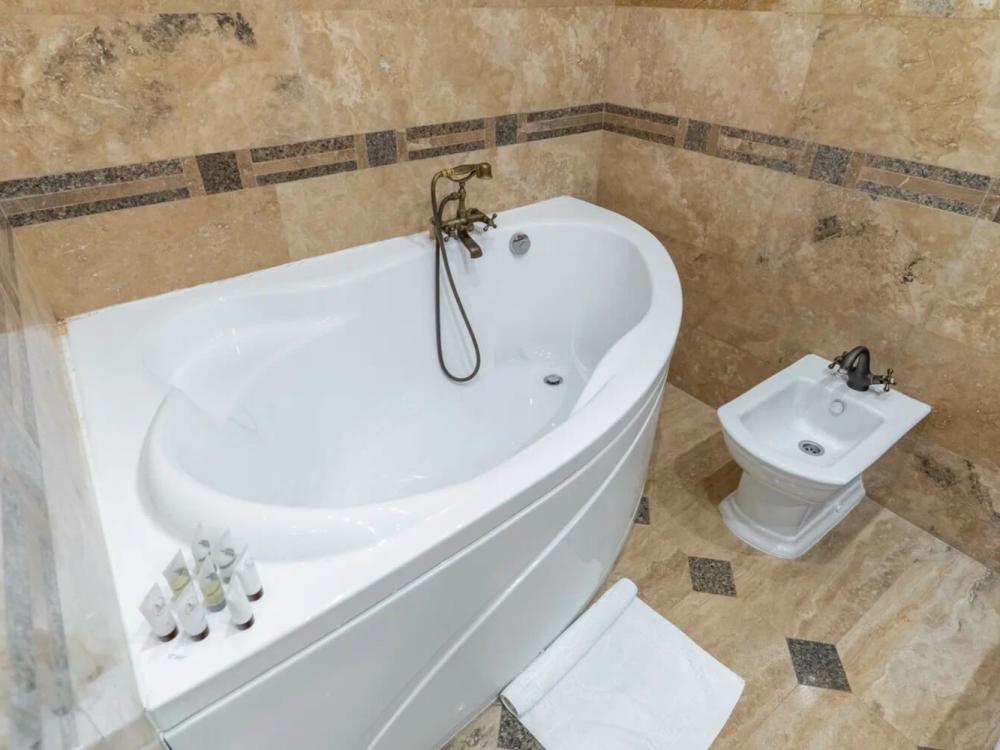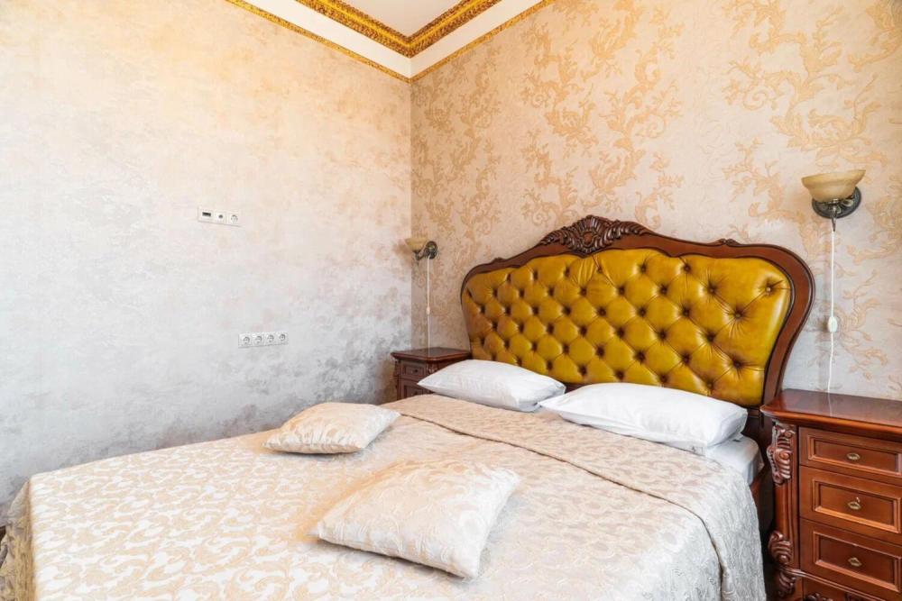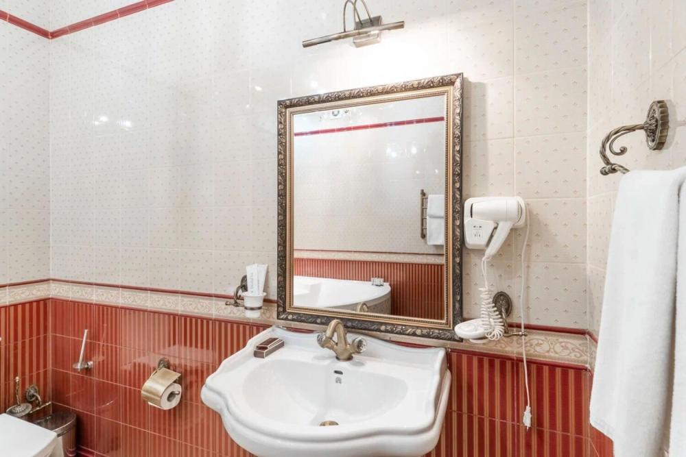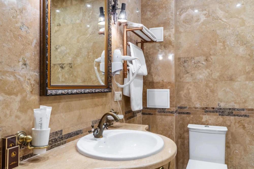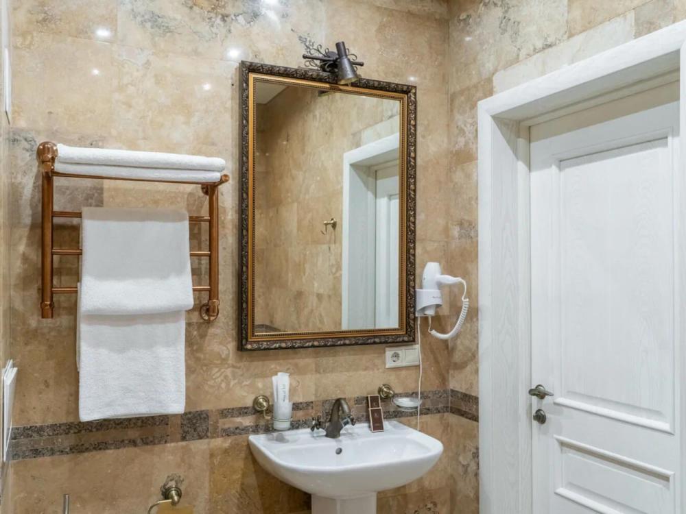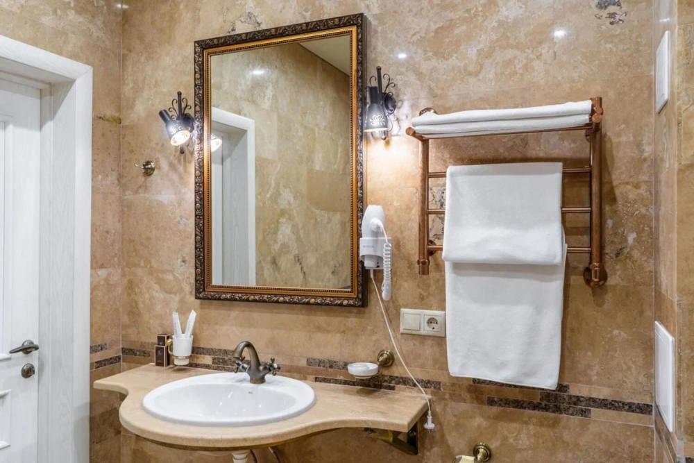 Изысканный номер в классическом стиле состоит из гостиной и спальни. В номере есть все необходимое для комфортного проживания двух гостей — большая двуспальная кровать, распашной шкаф, мягкая мебель, трюмо с зеркалом, телевизор, сейф. Дизайнерская ванная оснащена большой ванной и биде. Для гостей предоставляются полотенца, халаты, тапочки, фен, набор туалетно-косметических принадлежностей.