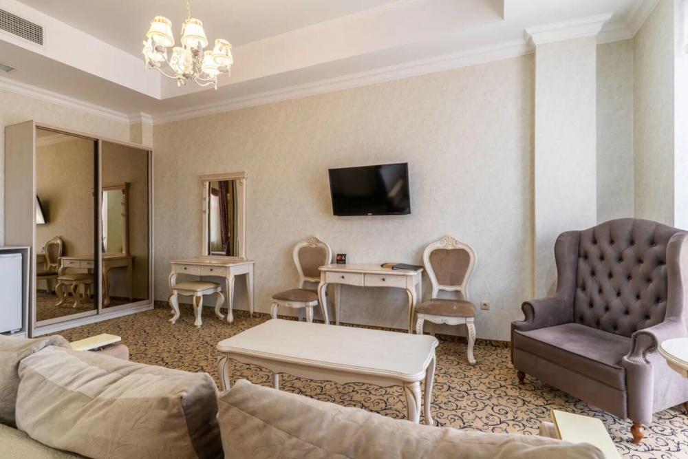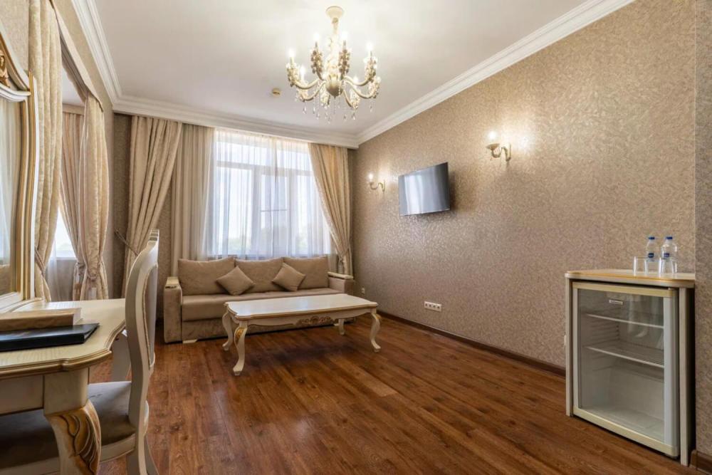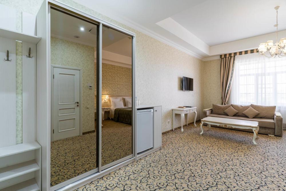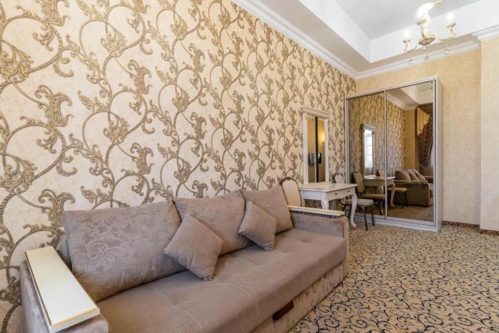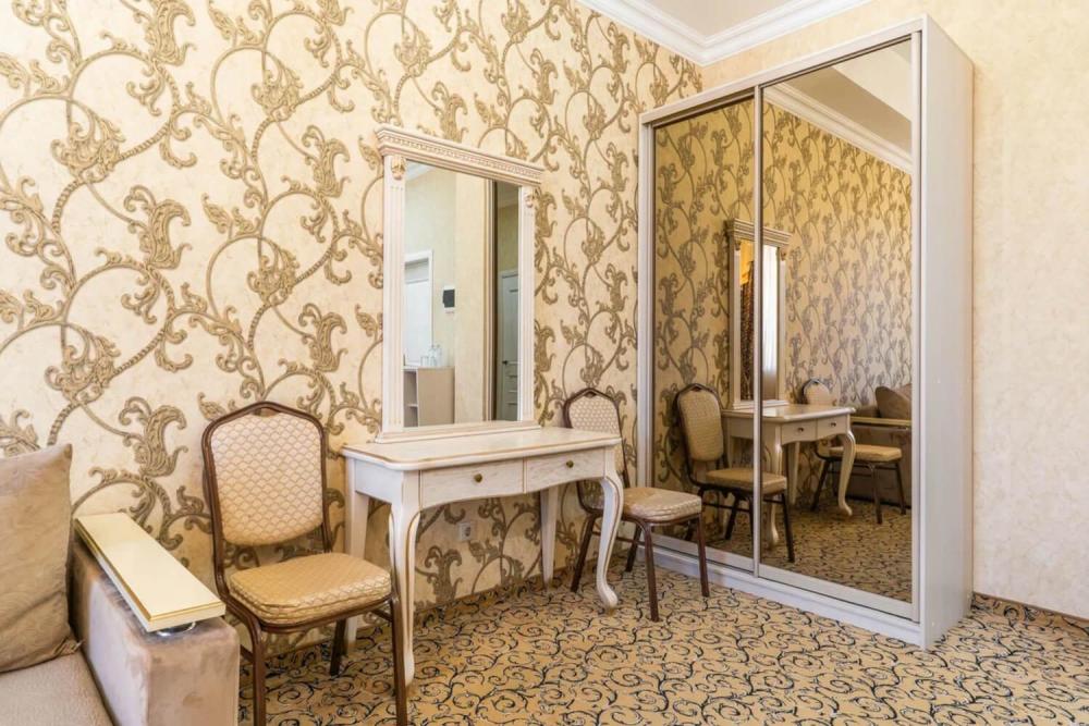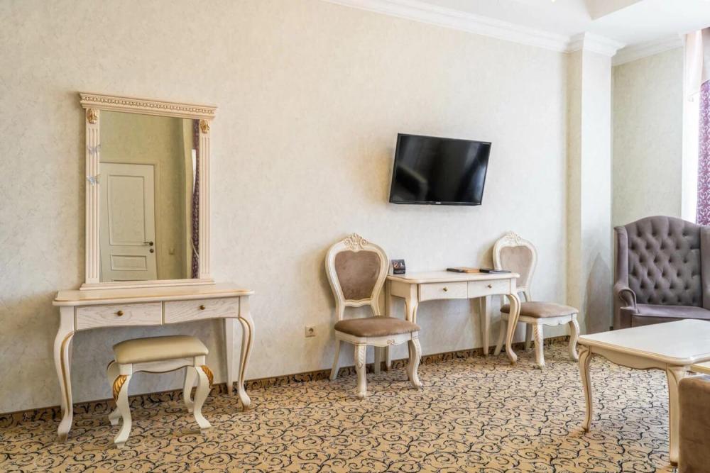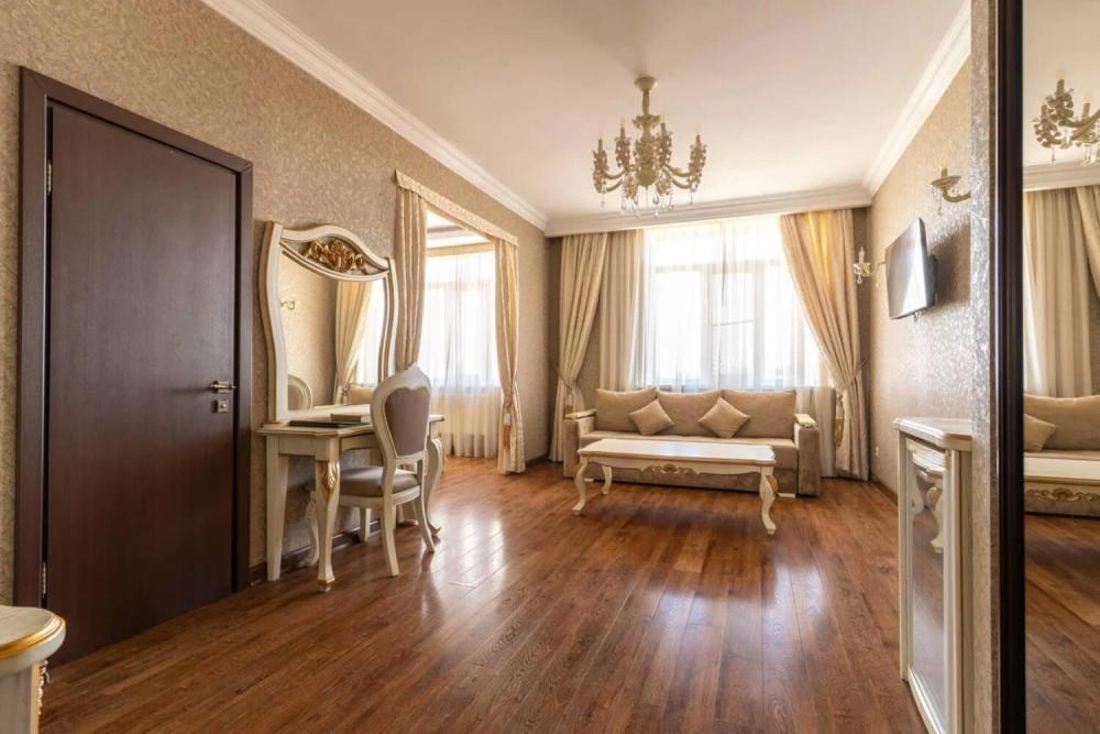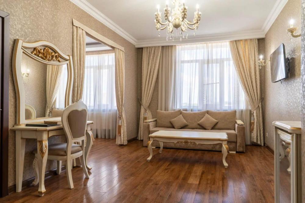Просторный номер с зонированием на спальню и гостиную и выходом на просторный балкон. Интерьер в классическом стиле тщательно подобран и создает ощущение роскоши. Для комфортного проживания в номере имеются: двуспальная кровать, шкаф, мягкая мебель, телевизор, рабочий стол, трюмо, сейф. Санузел оснащен большой ванной. Для гостей предоставляются полотенца, халаты, тапочки, фен, набор туалетно-косметических принадлежностей.