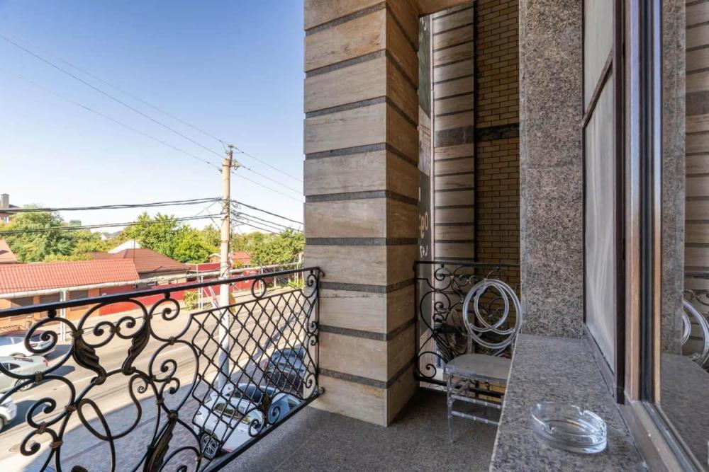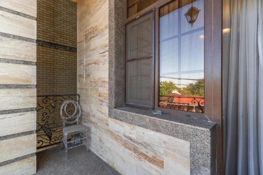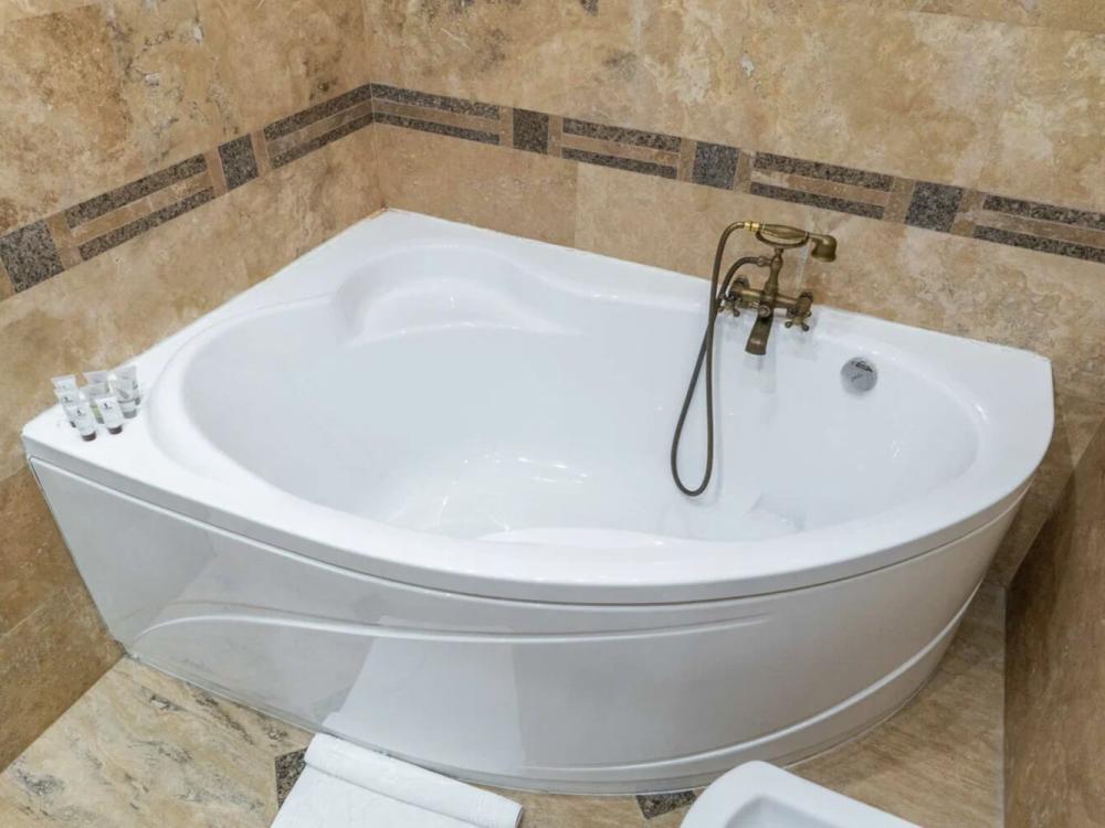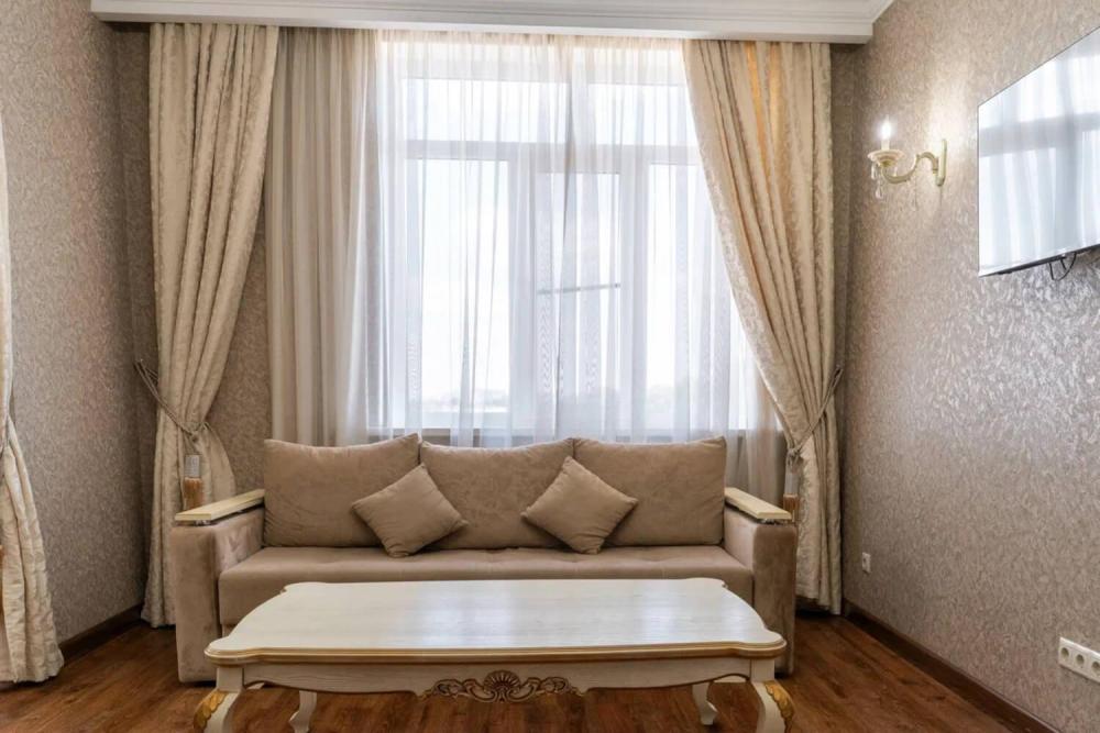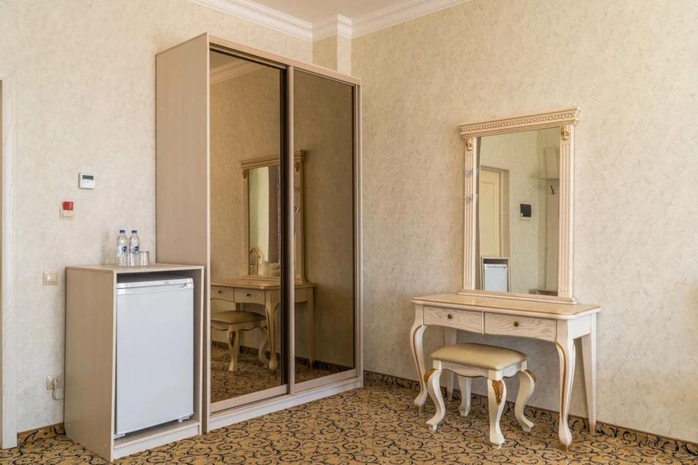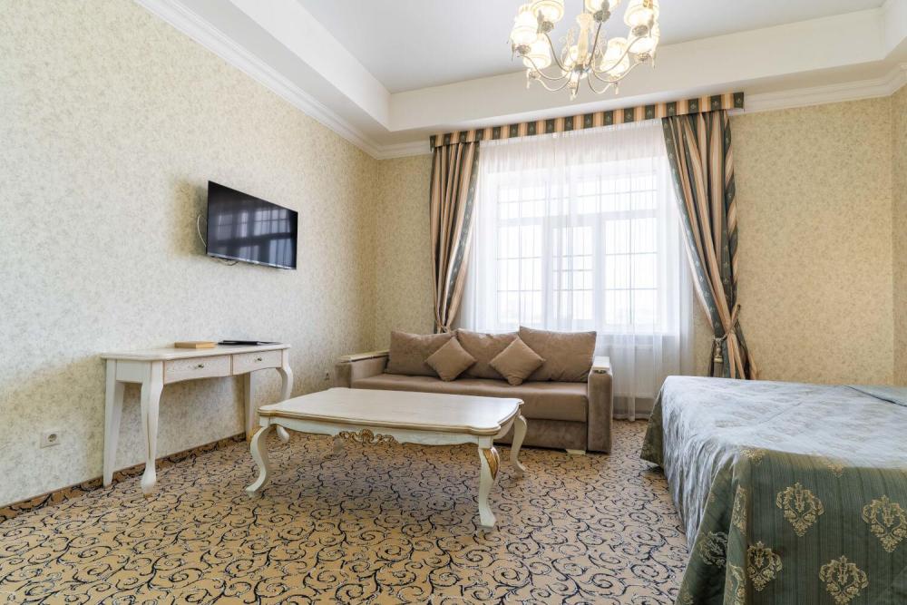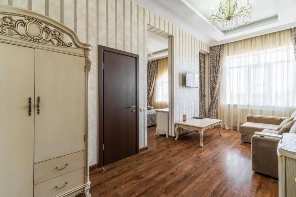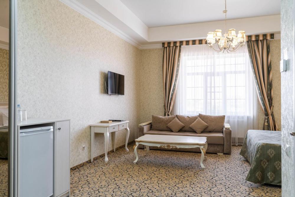 Просторный номер с зонированием на спальню и гостиную и выходом на просторный балкон. Интерьер в классическом стиле тщательно подобран и создает ощущение роскоши. Для комфортного проживания в номере имеются: двуспальная кровать, шкаф, мягкая мебель, телевизор, рабочий стол, трюмо, сейф. Санузел оснащен большой ванной. Для гостей предоставляются полотенца, халаты, тапочки, фен, набор туалетно-косметических принадлежностей.