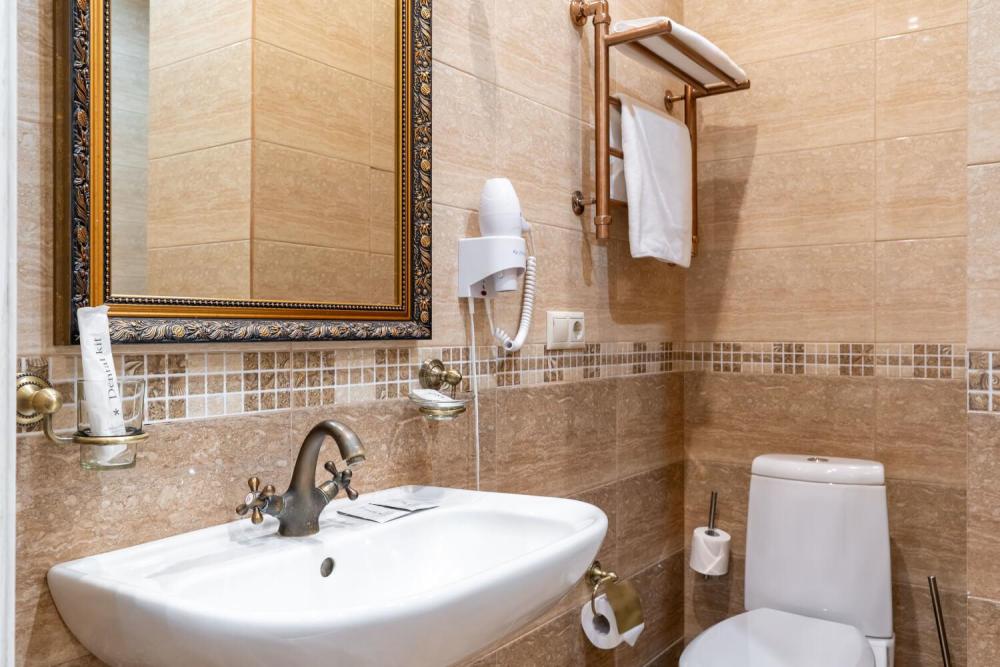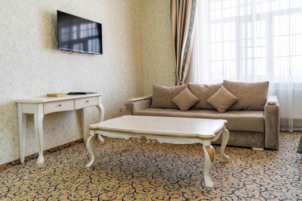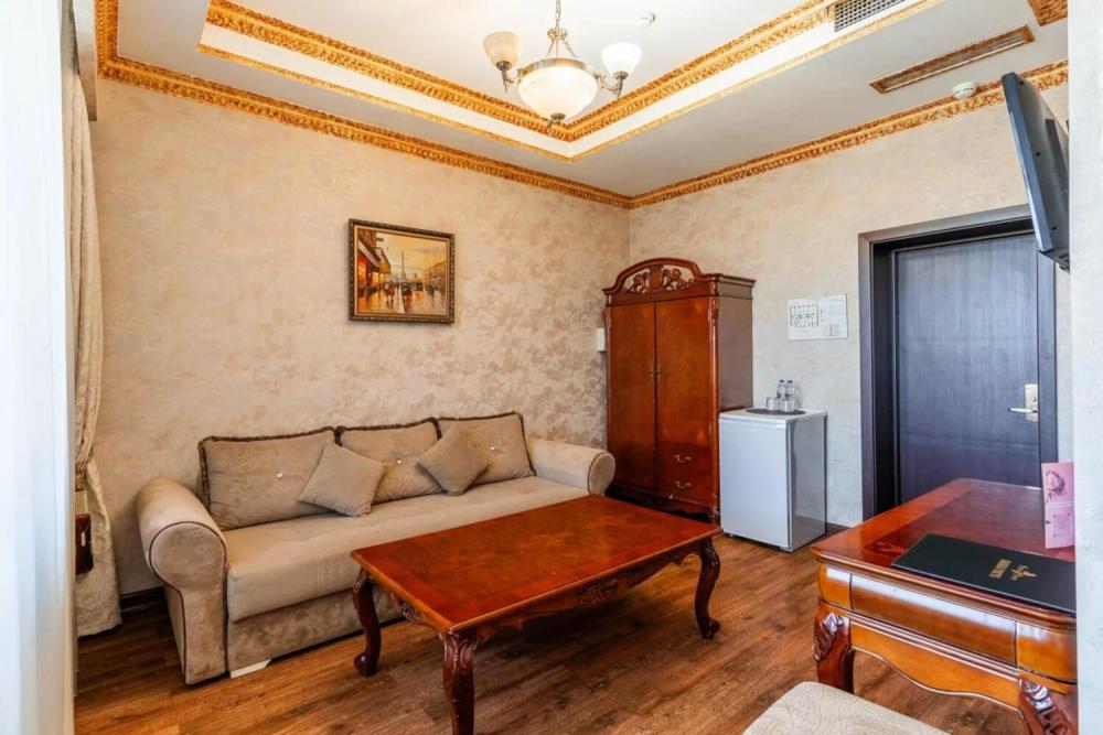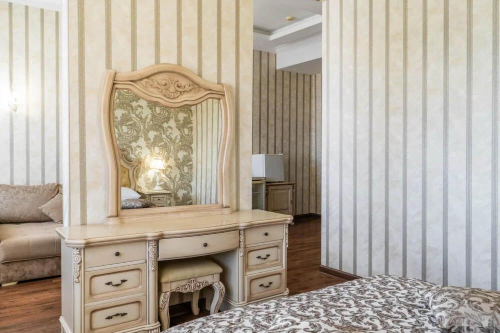Номер с классическим интерьером состоит из двух комнат — спальни и гостиной. Обстановка тщательно продумана и содержит все необходимое для комфортного проживания — двуспальную кровать, шкаф-купе, мягкий диван, телевизоры, трюмо с зеркалом, стулья. Санузел оснащен большой ванной и биде. Для гостей предоставляются полотенца, халаты, тапочки, фен, набор туалетно-косметических принадлежностей.
