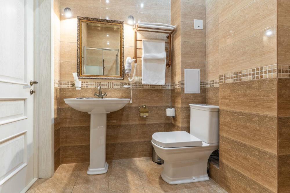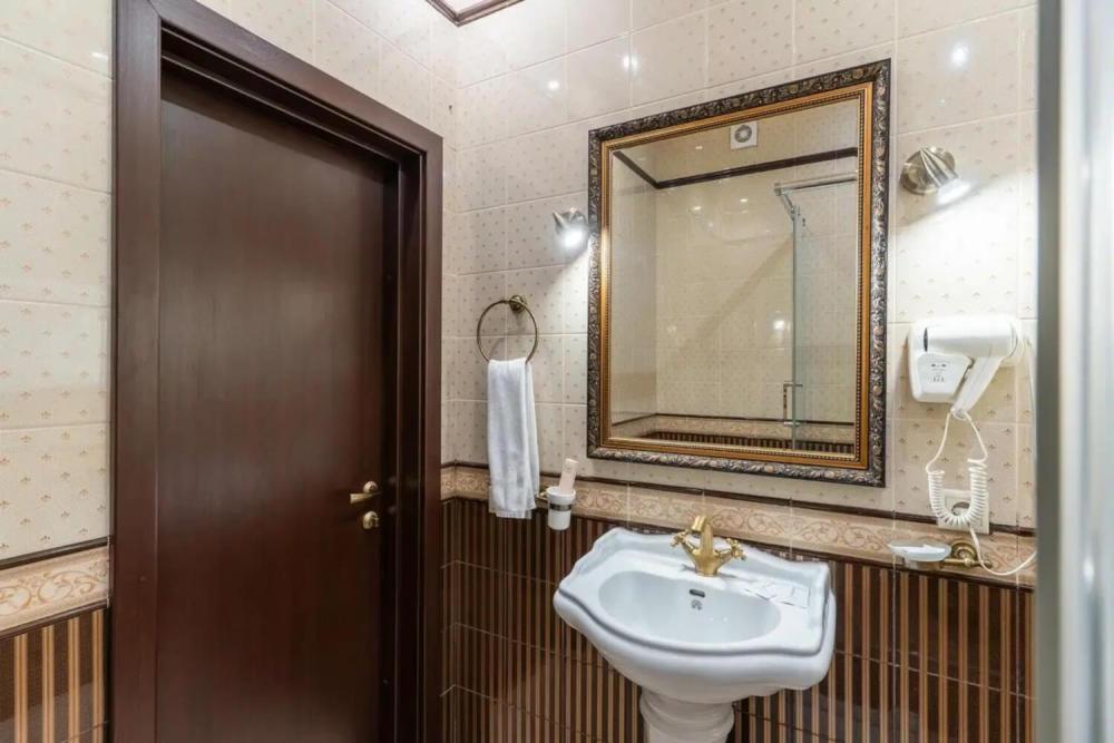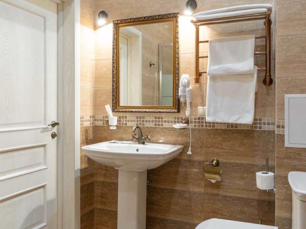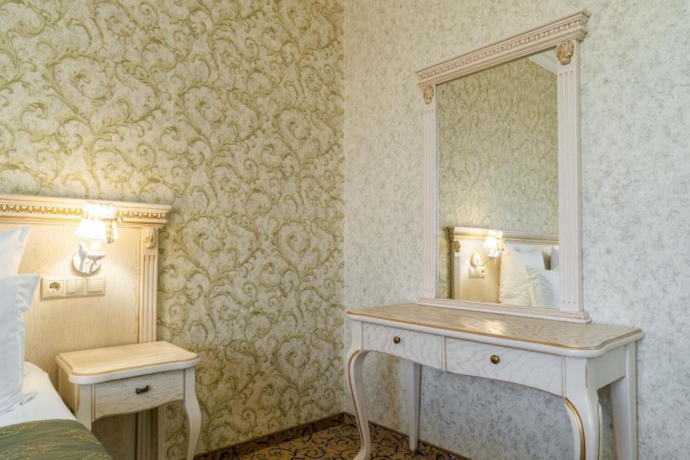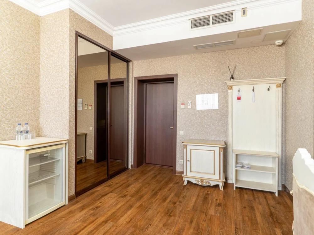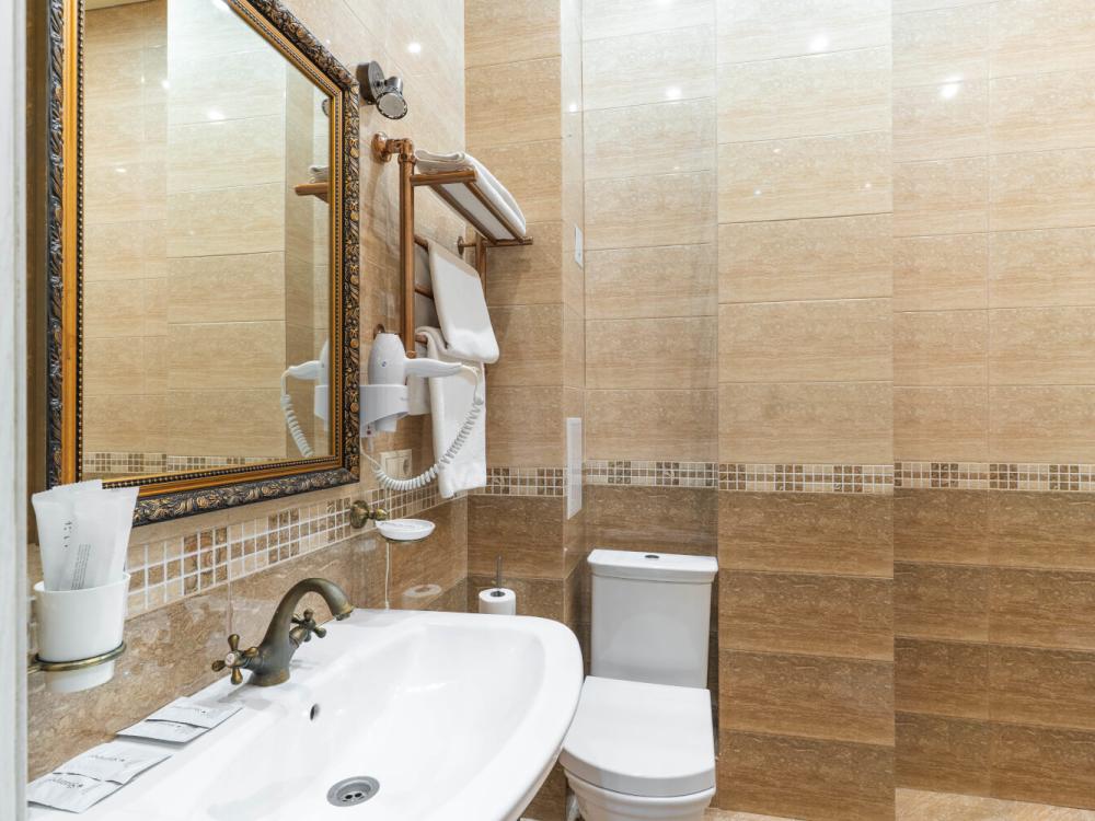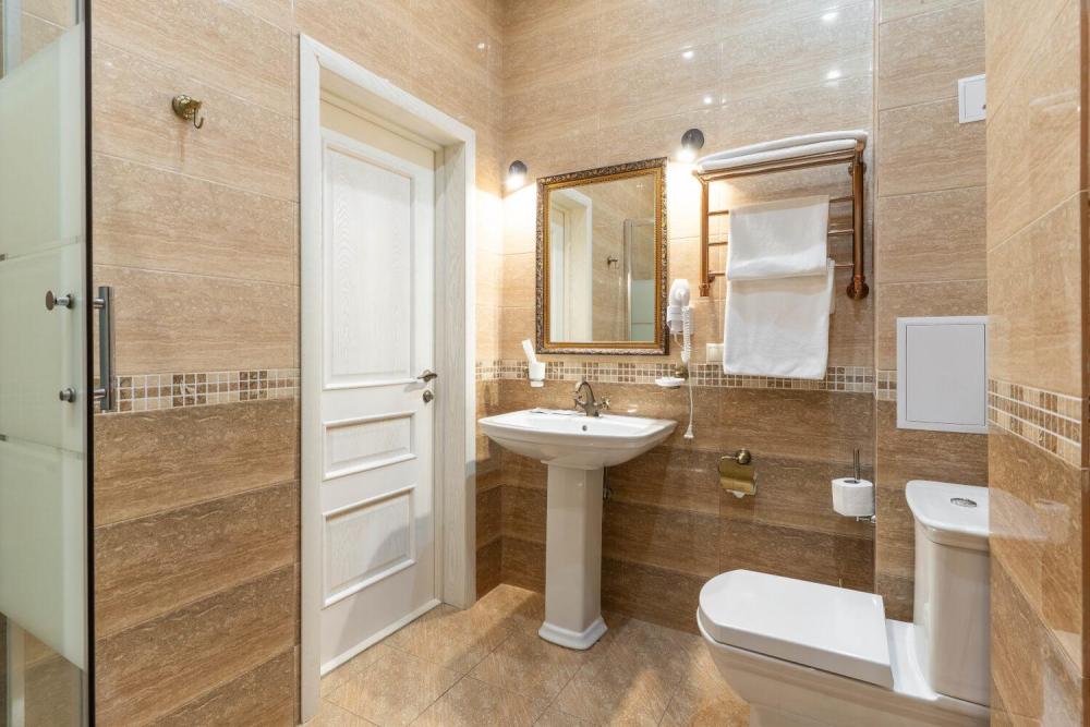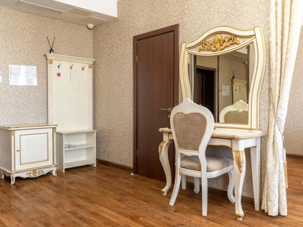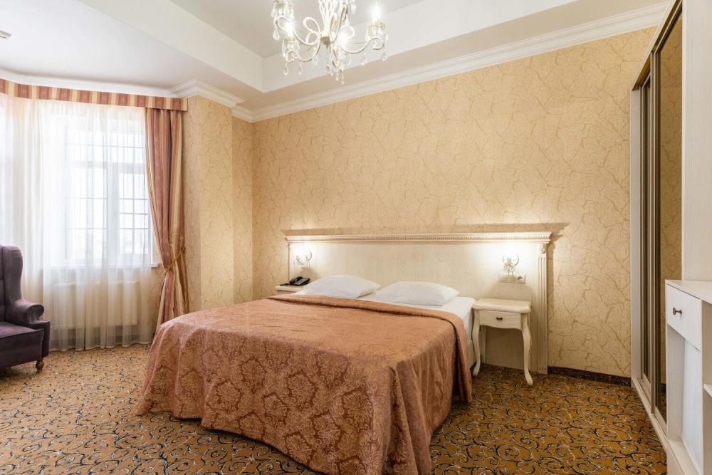 Комфортабельный номер с классическим интерьером. Зонирование на спальню и гостевую зону с мягкой мебелью, телевизором и журнальным столом, способствует полноценному отдыху. В номере есть все необходимое для комфорта — двуспальная кровать, шкаф-купе, трюмо, рабочий стол, стулья. Санузел оснащен душевой кабиной и биде. Для гостей предоставляются полотенца, халаты, тапочки, фен, набор туалетно-косметических принадлежностей.