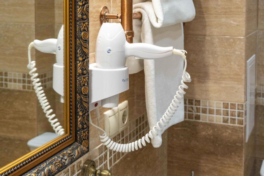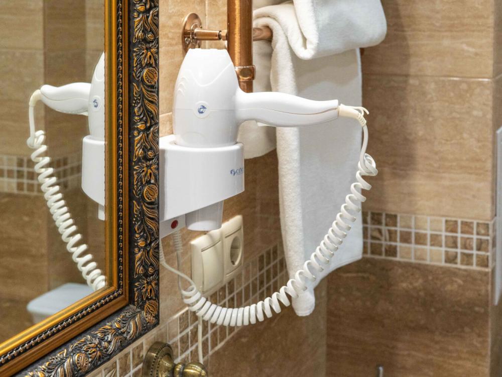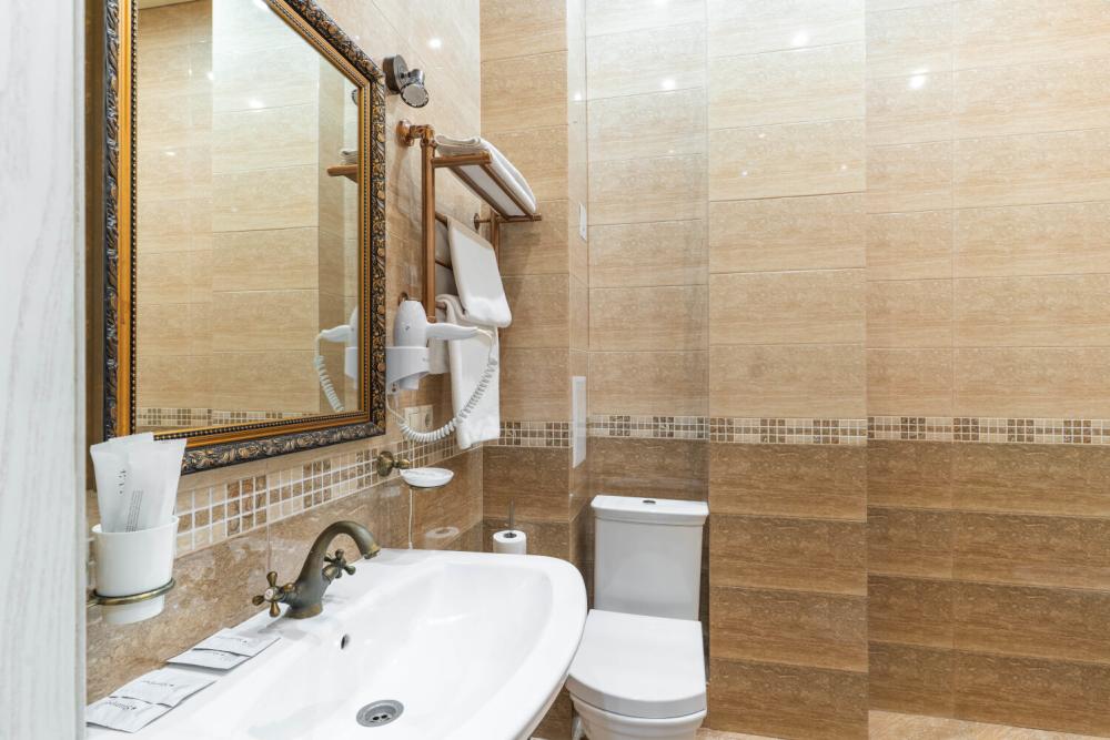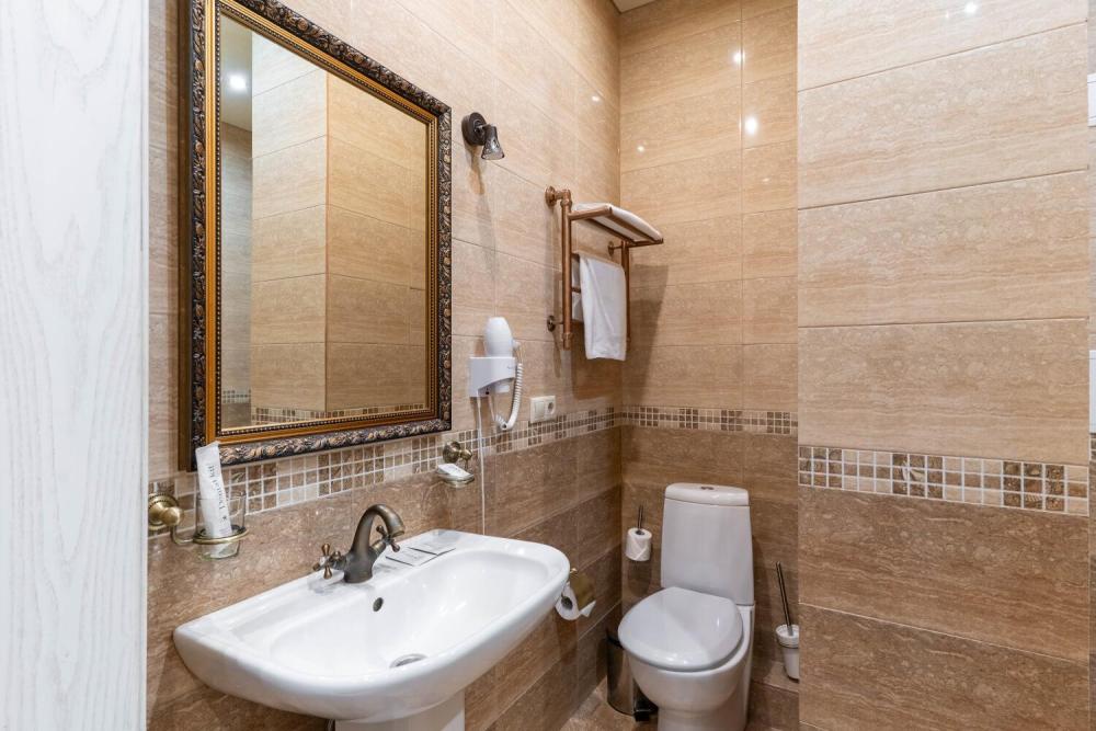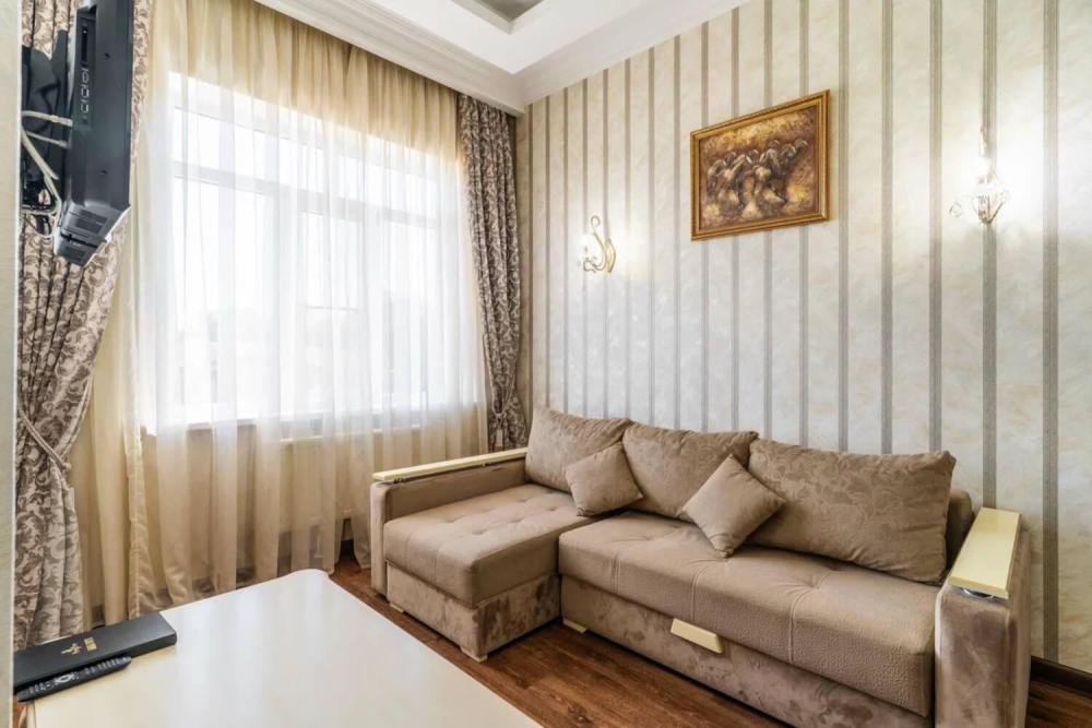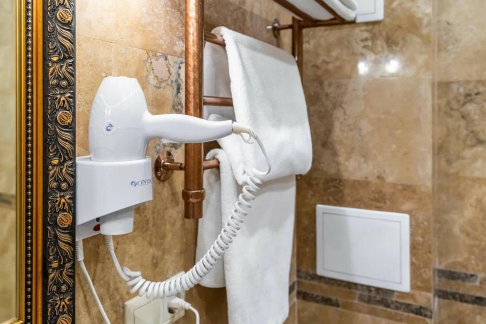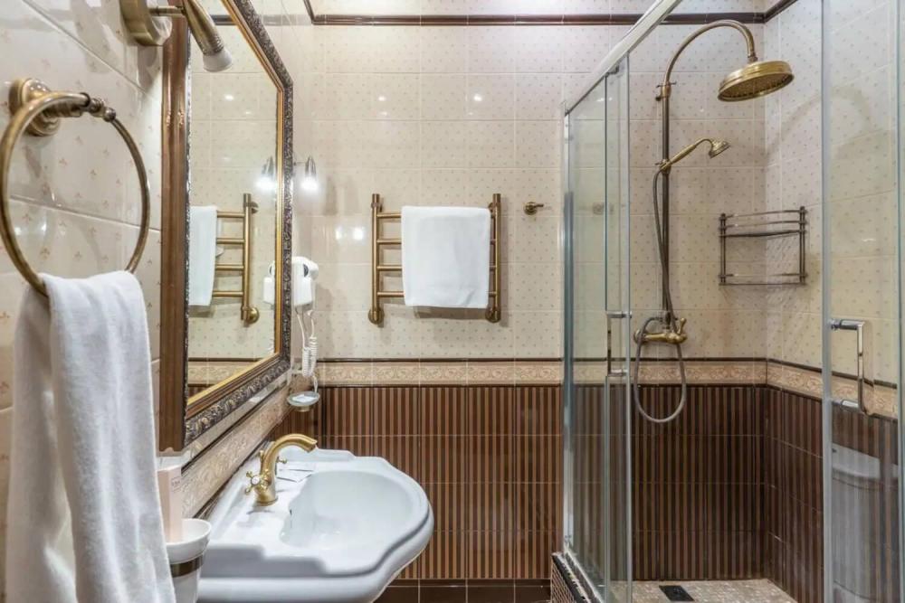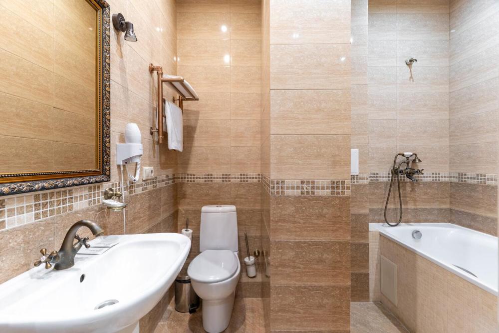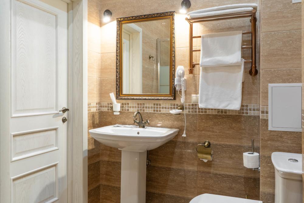 Комфортабельный номер с классическим интерьером. Зонирование на спальню и гостевую зону с мягкой мебелью, телевизором и журнальным столом, способствует полноценному отдыху. В номере есть все необходимое для комфорта — двуспальная кровать, шкаф-купе, трюмо, рабочий стол, стулья. Санузел оснащен душевой кабиной и биде. Для гостей предоставляются полотенца, халаты, тапочки, фен, набор туалетно-косметических принадлежностей.