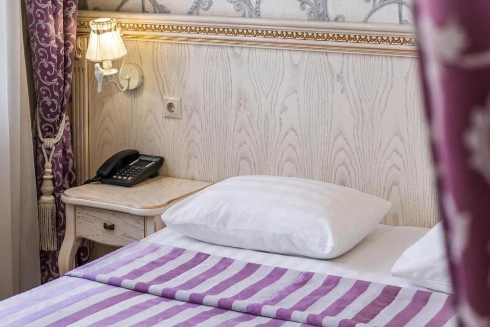 Представим Вам классический номер «Улучшенный стандарт» со сдержанным интерьером, оборудованный двуспальной кроватью, прикроватными тумбами с прикроватными бра, а также рабочим столом и ТВ с доступом в Интернет. Шкаф-купе с вешалками и полками, сейф и мини-бар. Также в номере имеется свой санузел с душевой кабиной, укомплектованный полотенцами, халатами, тапочками и феном, а также туалетно-косметическими принадлежностями.