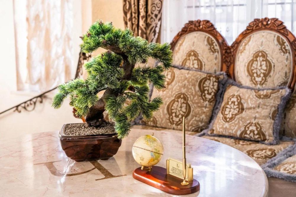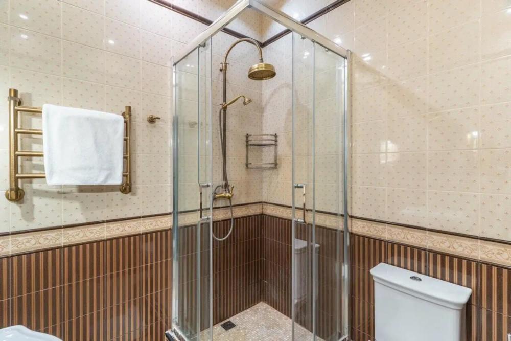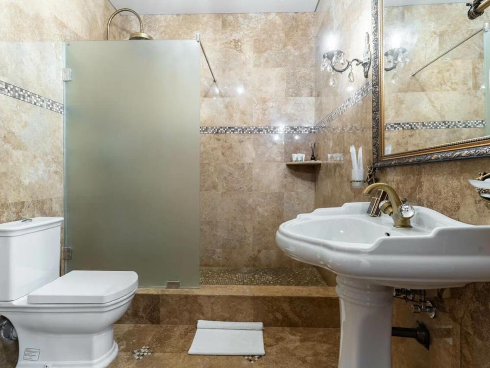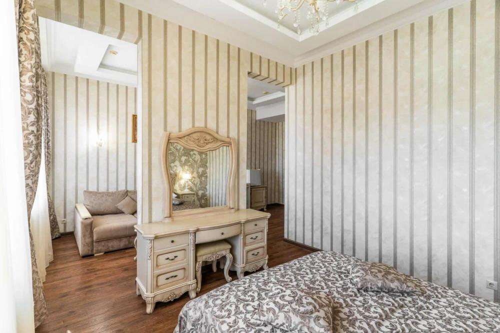 Дорогая мебель из натурального дерева, постельное белье из дорогих тканей, парилка и бассейн. Две большие спальни. Все это делает номер неповторимым. В номере с легкостью поместиться целая компания или семья. Номер оснащен большим телевизором, мини-баром, и мягкой зоной, а так же большим столом. Ванна с душевой и санузел разделены. В комплект входят все туалетно-косметические принадлежности, полотенца, халаты и тапочки. Вечером горничная любезно подготовит номер ко сну, чтобы Вы не утруждали себя проветриванием номера, подготовкой постельных принадлежностей, включая дополнительное одеяло при необходимости.