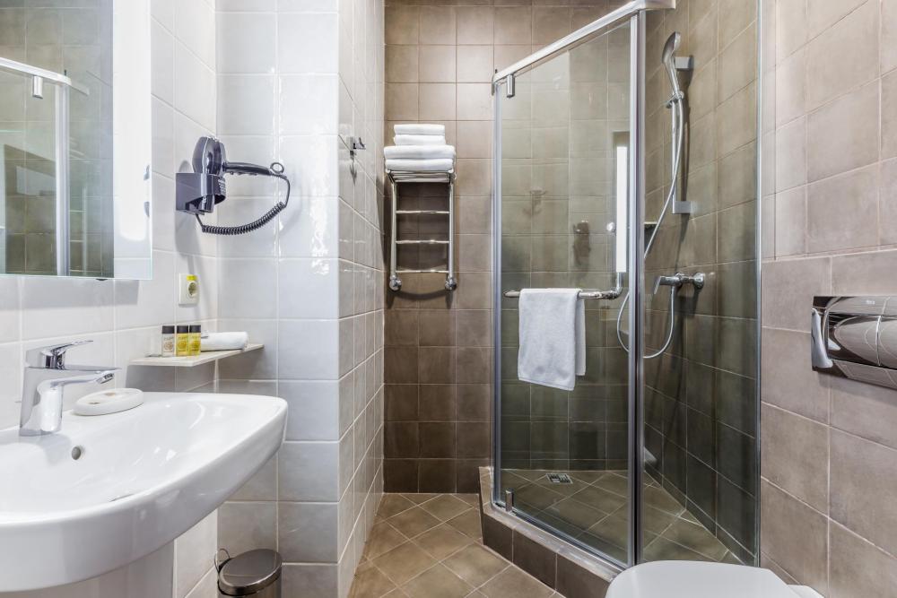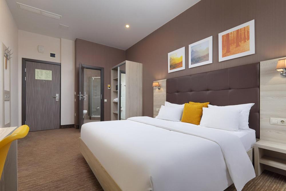 Современные номера, оформленные в стильных теплых тонах, оснащены одной большой кроватью (180*200) и раскладным креслом (80*190). В номерах представлены: удобный, ортопедический матрас бренда Askona, высококачественный текстиль бренда Togas, шторы Blackout, комфортная рабочая зона, сейфовая ячейка, набор для приготовления чая и кофе, мягкие халаты и тапочки. Ванная комната оснащена душем, зеркалом с подсветкой, феном для сушки волос, банными принадлежностями, натуральной косметикой.
