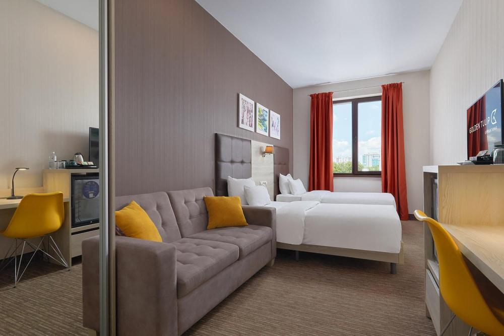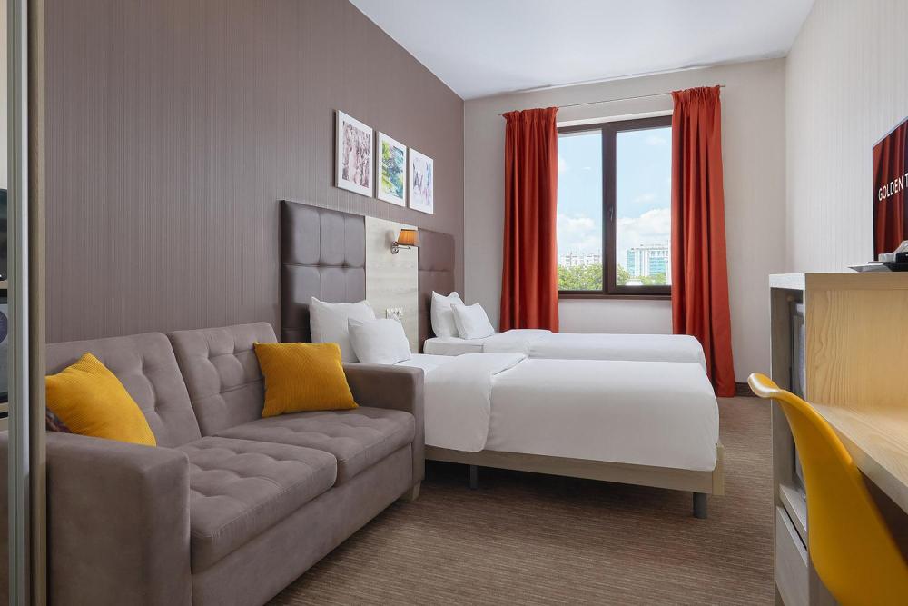 Окунитесь в атмосферу домашнего уюта в номерах категории Cтандарт c двумя раздельными кроватями (90*200). В номерах представлены: две кровати с удобными матрасами, высококачественный текстиль от бренда Togas, диван, рабочая зона, 40-дюймовый телевизор, индивидуальная система климат-контроля, мини-бар, набор для приготовления чая и кофе, телефон, Wi-Fi, сейф. Ванная комната оснащена душем, зеркалом с подсветкой и банными принадлежностями
