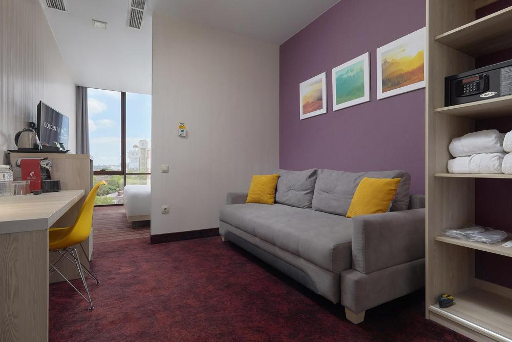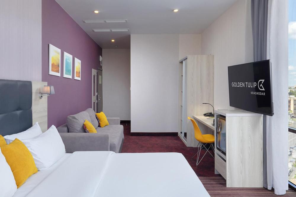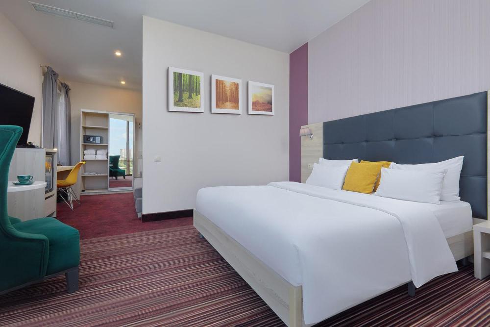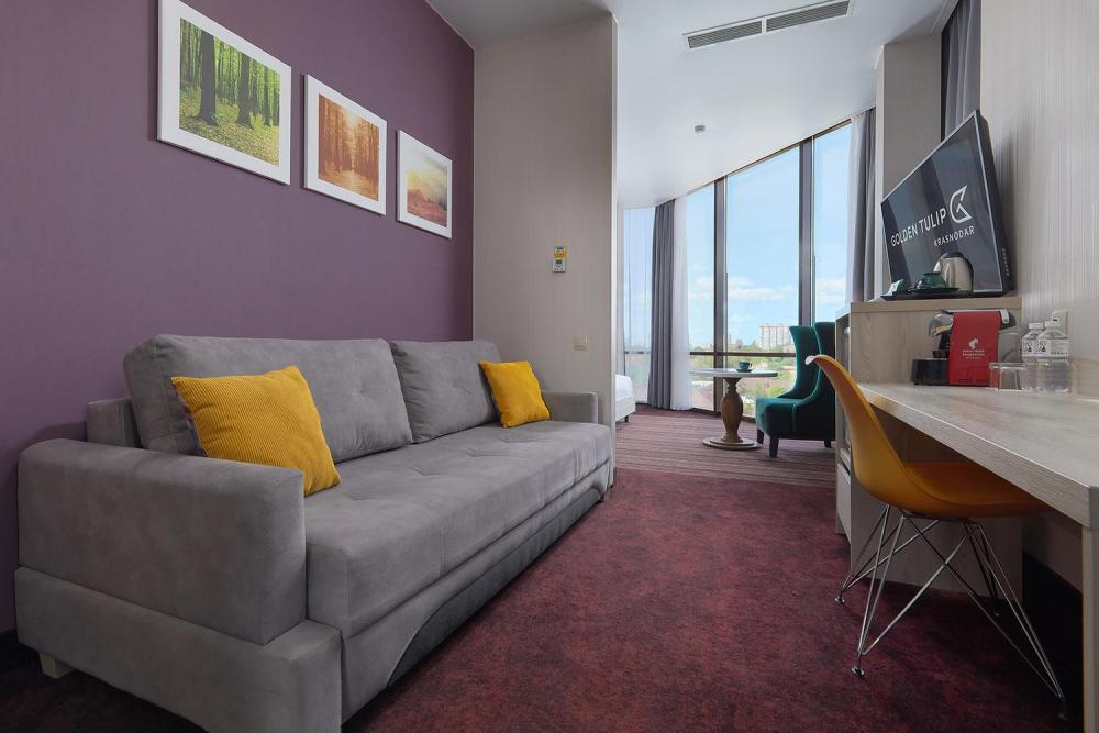 Комфортабельный яркий, панорамный номер, идеально подходящий для бизнес и семейных поездок, со спальной зоной с кроватью «King-size»(180*200) и раскладным диваном (160*195). В номерах представлены: удобный, ортопедический матрас бренда Askona на двуспальной кровати, комфортный раскладной диван для отдыха, высококачественный текстиль бренда Togas, шторы Blackout, комфортная рабочая зона, сейфовая ячейка, набор для приготовления чая и кофе, бутилированная вода, кофемашина и кофейные капсулы, мягкие халаты и тапочки, ТВ 55 диагональ с кабельным телевидением. Ванная комната оснащена тропическим душем, зеркалом с подсветкой, широкой раковиной, окном, феном для сушки волос, банными принадлежностями, а представленная натуральная косметика, поможет расслабиться после продуктивного дня.