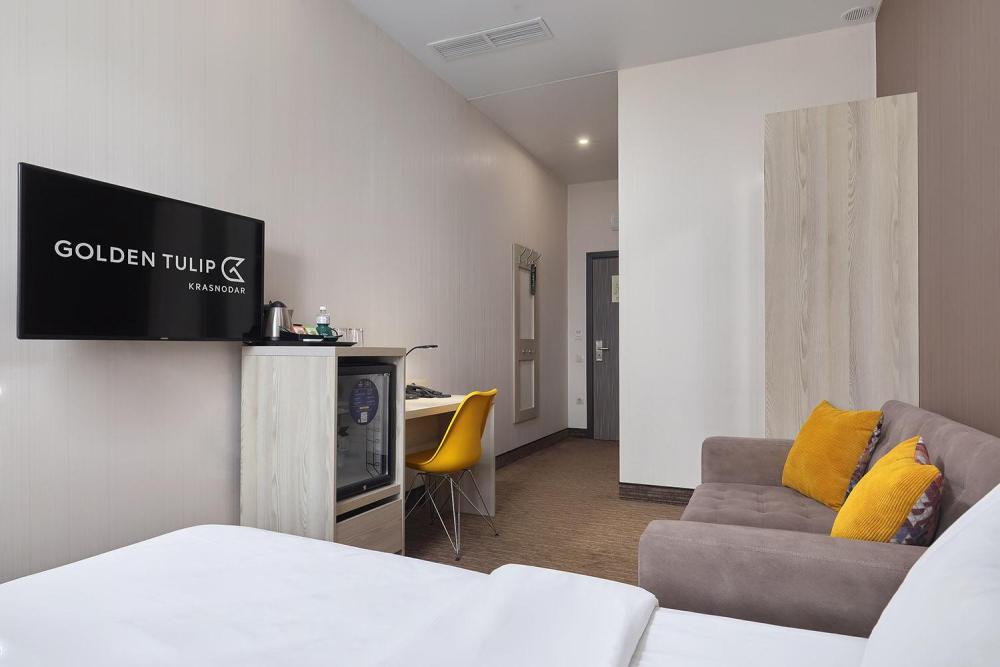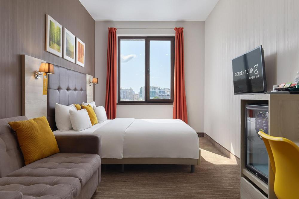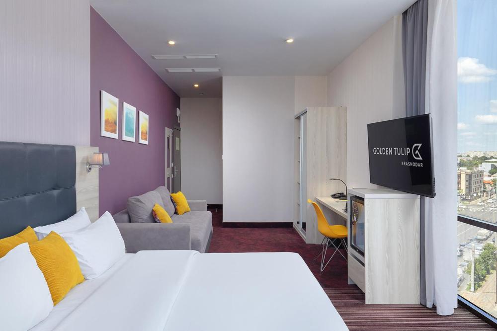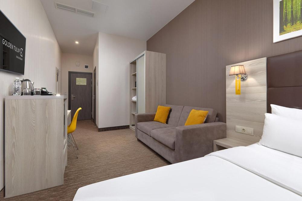 Комфортабельный яркий, панорамный номер, идеально подходящий для бизнес и семейных поездок, со спальной зоной с кроватью «King-size»(180*200) и раскладным диваном (160*195). В номерах представлены: удобный, ортопедический матрас бренда Askona на двуспальной кровати, комфортный раскладной диван для отдыха, высококачественный текстиль бренда Togas, шторы Blackout, комфортная рабочая зона, сейфовая ячейка, набор для приготовления чая и кофе, бутилированная вода, кофемашина и кофейные капсулы, мягкие халаты и тапочки, ТВ 55 диагональ с кабельным телевиденьем. Ванная комната оснащена тропическим душем, зеркалом с подсветкой, широкой раковиной, окном, феном для сушки волос, банными принадлежностями, а представленная натуральная косметика, поможет расслабиться после продуктивного дня.