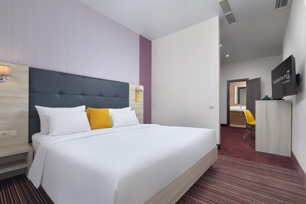 Современные номера, оформленные в стильных теплых тонах, оснащены одной большой кроватью (180*200). В номерах представлены: удобный, ортопедический матрас бренда Askona, высококачественный текстиль бренда Togas, шторы Blackout, комфортная рабочая зона, сейфовая ячейка, набор для приготовления чая и кофе, мягкие халаты и тапочки. Ванная комната оснащена душем, зеркалом с подсветкой, феном для сушки волос, банными принадлежностями, а представленная натуральная разовая косметика, поможет расслабиться после продуктивного дня.