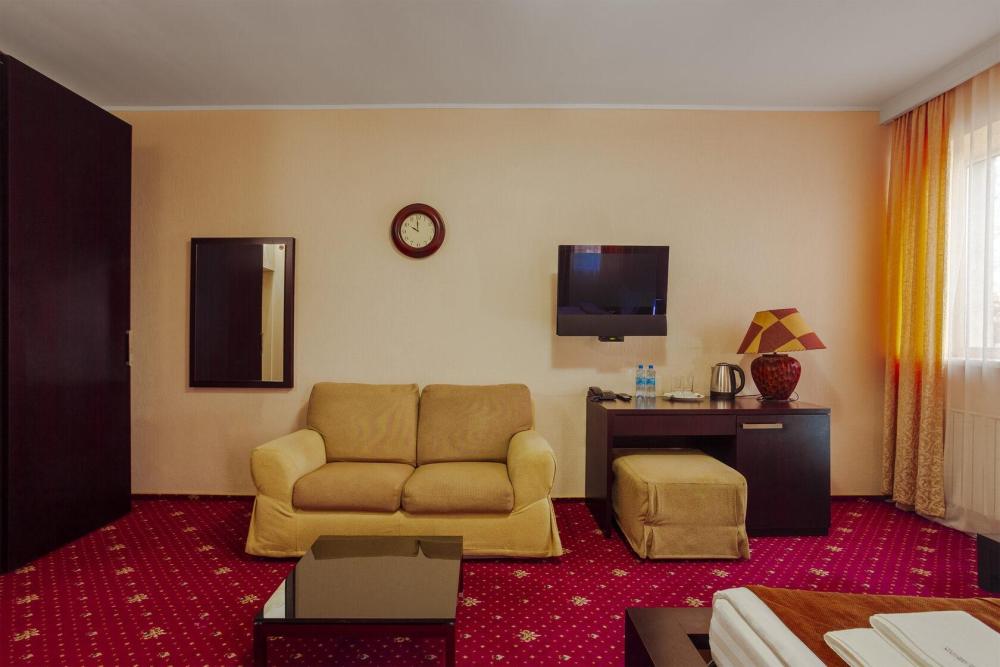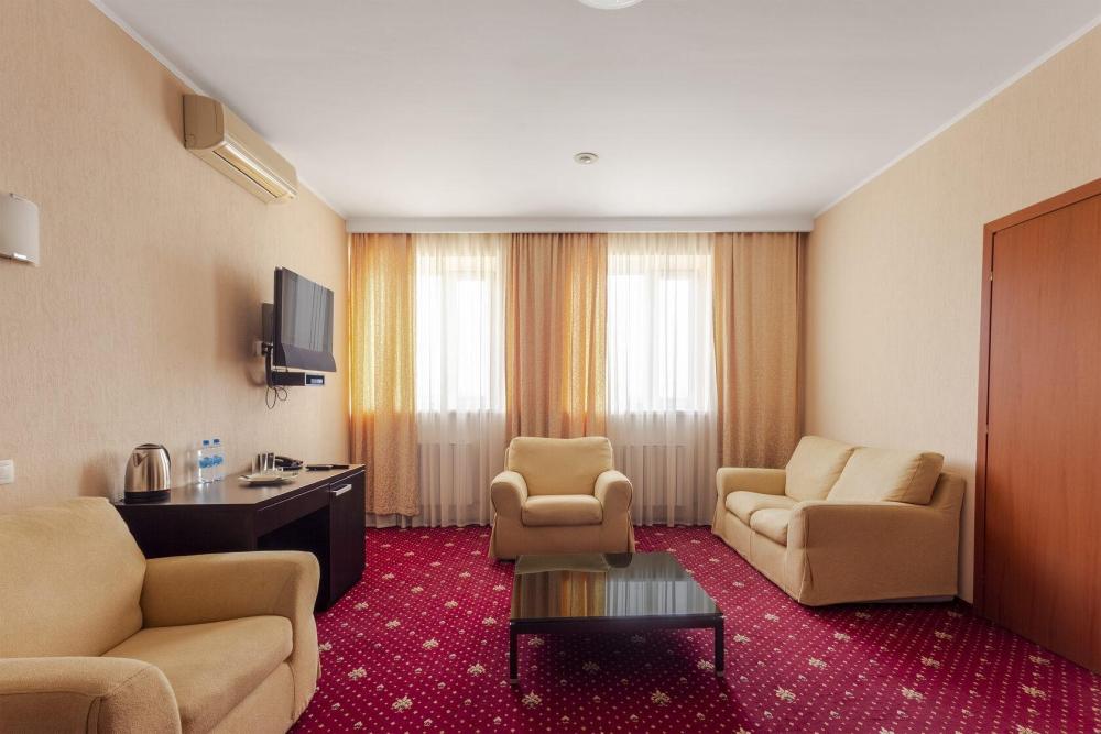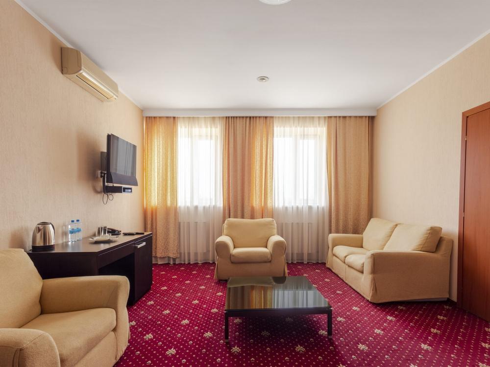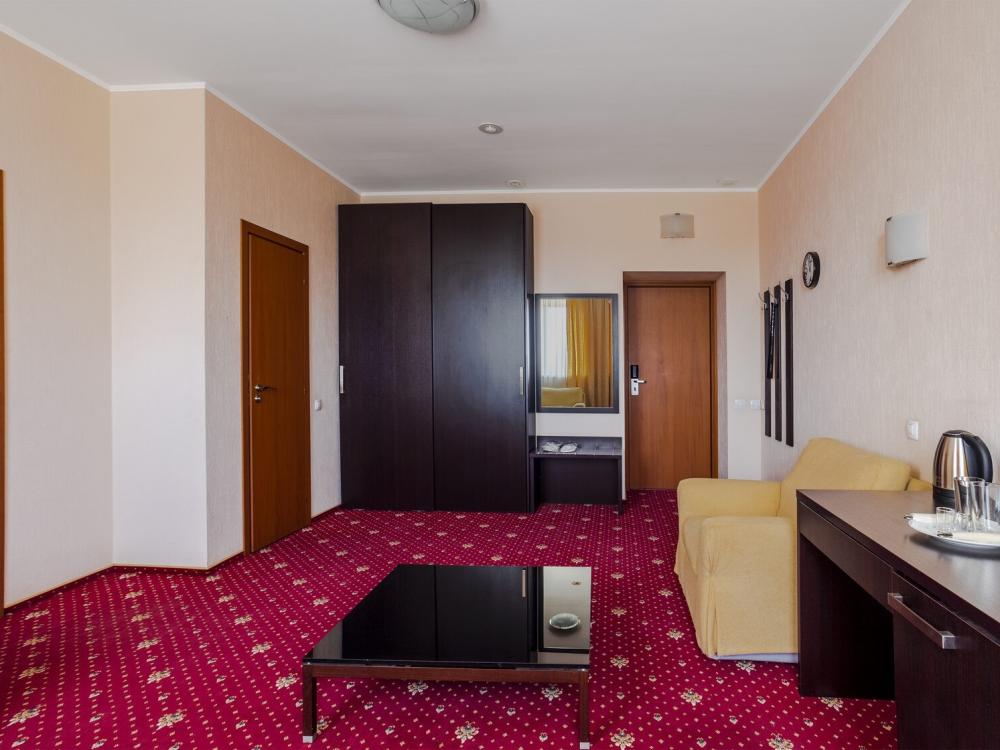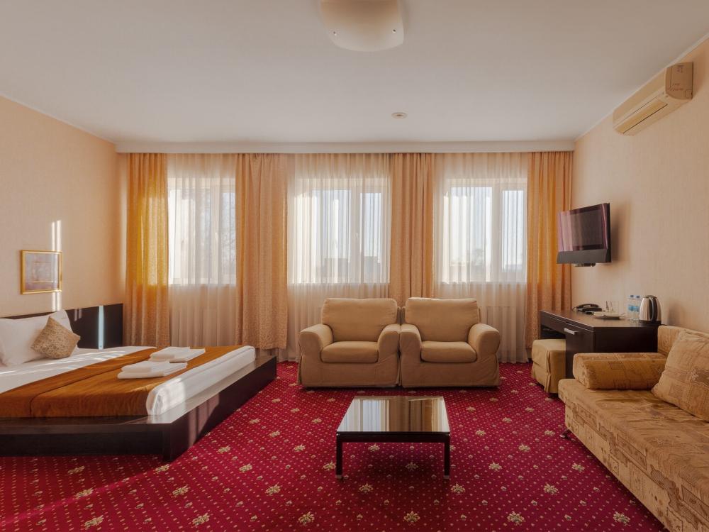 Двухкомнатный номер люкс общей площадью 60 м² для размещения до 4-х гостей (с учетом дополнительного места). Для комфортного проживания гостей номер оснащен всем необходимым: двуспальная кровать 200 x 160, кресла, диван, прикроватные тумбочки, постельные принадлежности, сплит, холодильник, зеркало, рабочий стол, шкаф, интернет, телевизор, ванна, санузел, фен, халат, одноразовые тапочки, косметические принадлежности.
