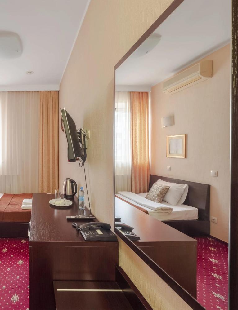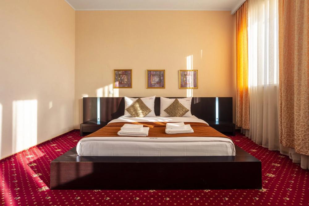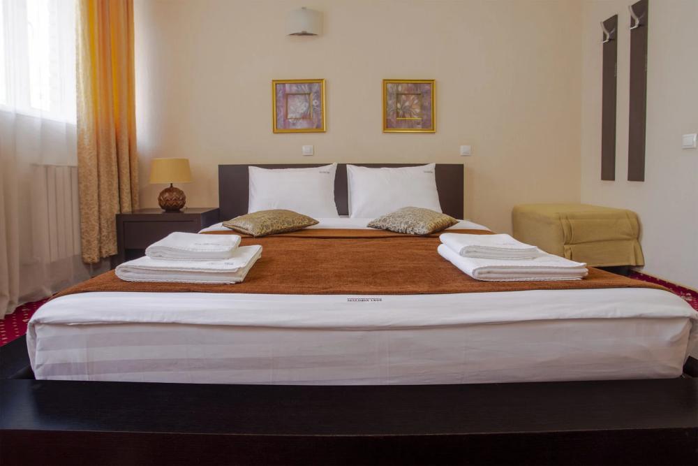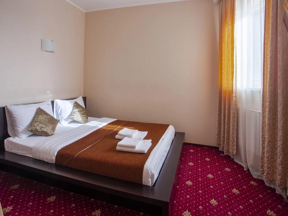 Однокомнатный номер делюкс общей площадью 40 м² для размещения до 3-х гостей (с учетом дополнительного места). Для комфортного проживания гостей номер оснащен всем необходимым: кровать 200 x 160, прикроватные тумбочки, постельные принадлежности, сплит, холодильник, зеркало, письменный стол, шкаф, интернет, телевизор, душевая кабина, санузел, фен, косметические принадлежности.