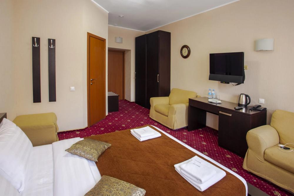 Однокомнатный номер стандарт плюс общей площадью 32 м² для размещения до 2-х гостей. Для комфортного проживания гостей номер оснащен всем необходимым: кровать 200 x 160, прикроватные тумбочки, кресла, постельные принадлежности, сплит, холодильник, зеркало, письменный стол, шкаф, интернет, телевизор, душевая кабина, санузел, фен, косметические принадлежности.