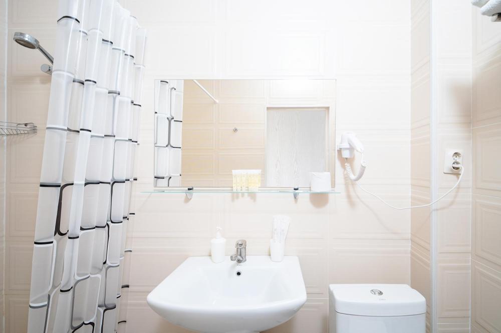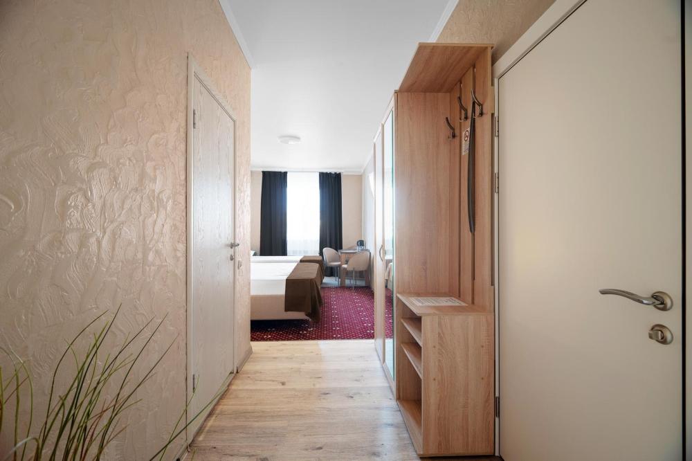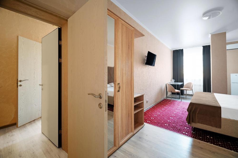 Люкс двухкомнатный с ванной. В номере есть все необходимое для проживания: Набор полотенец и косметики Тапочки (по запросу гостя) Фен Холодильник Телевизор Шкаф Чайник, чай, кофе, сахар Посуда и столовые приборы В стоимость входит бесплатная парковка и Wi-Fi Круглосуточная стойка регистрации