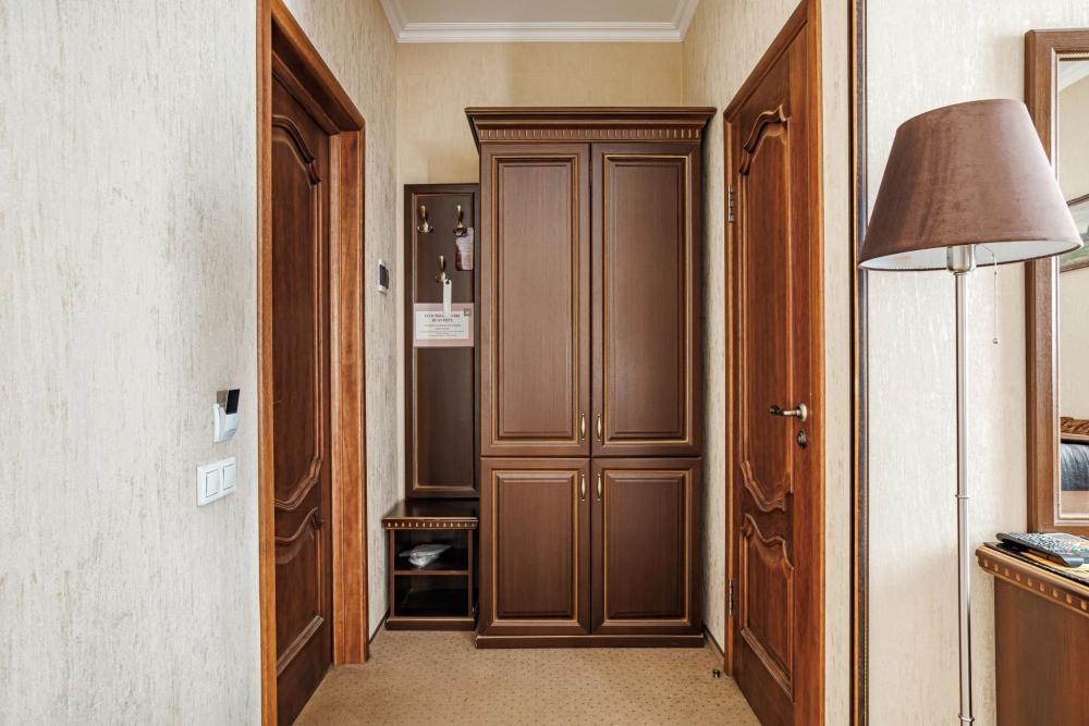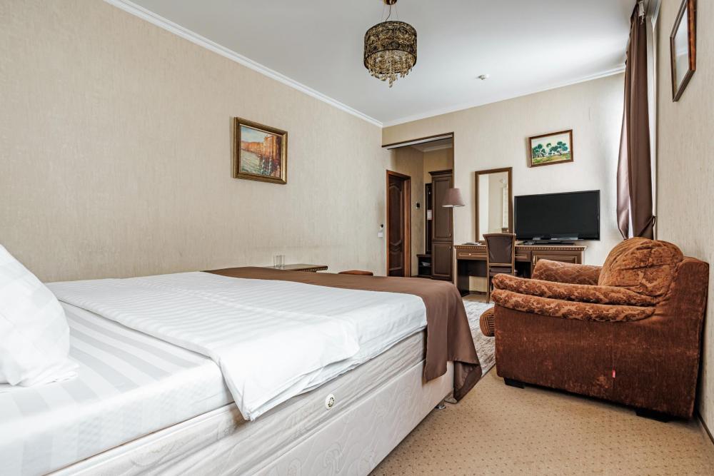 Двухкомнатный номер с большой двуспальной кроватью и дизайнерским ремонтом. В номере: пуховые одеяла и подушки, отдельная ванная комната, оснащенная всем необходимым, так же феном и весами, туалетная косметика, махровые халаты, белоснежные фирменные полотенца, тапочки, ЖК телевизоры, выбор спутниковых каналов, бесплатный Wi-Fi доступ в Интернет, индивидуально кодируемый сейф, система кондиционирования, мини-бар.