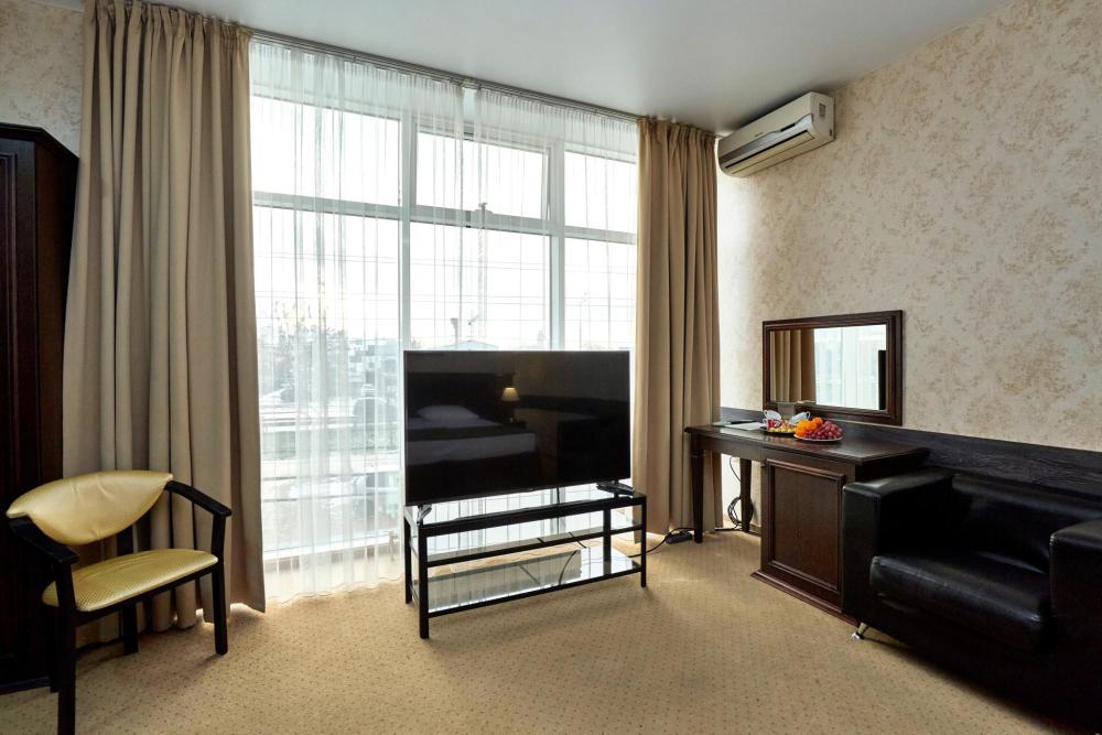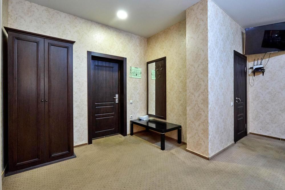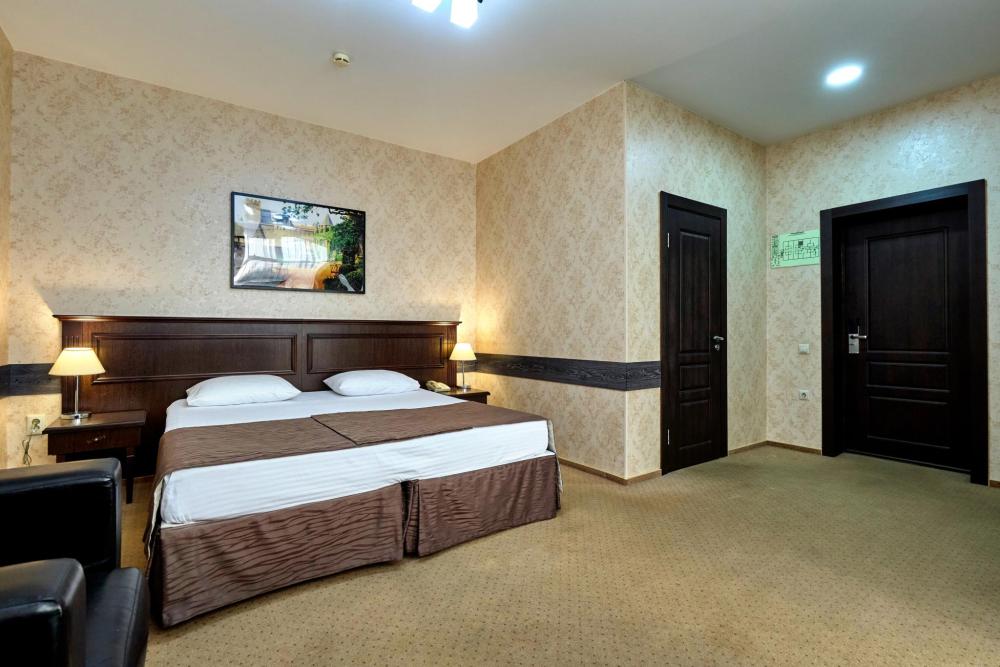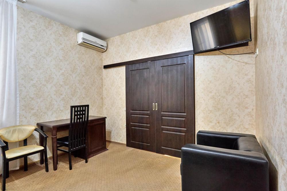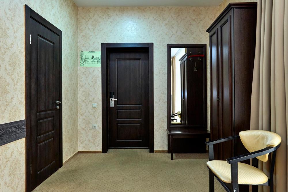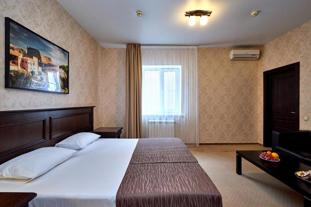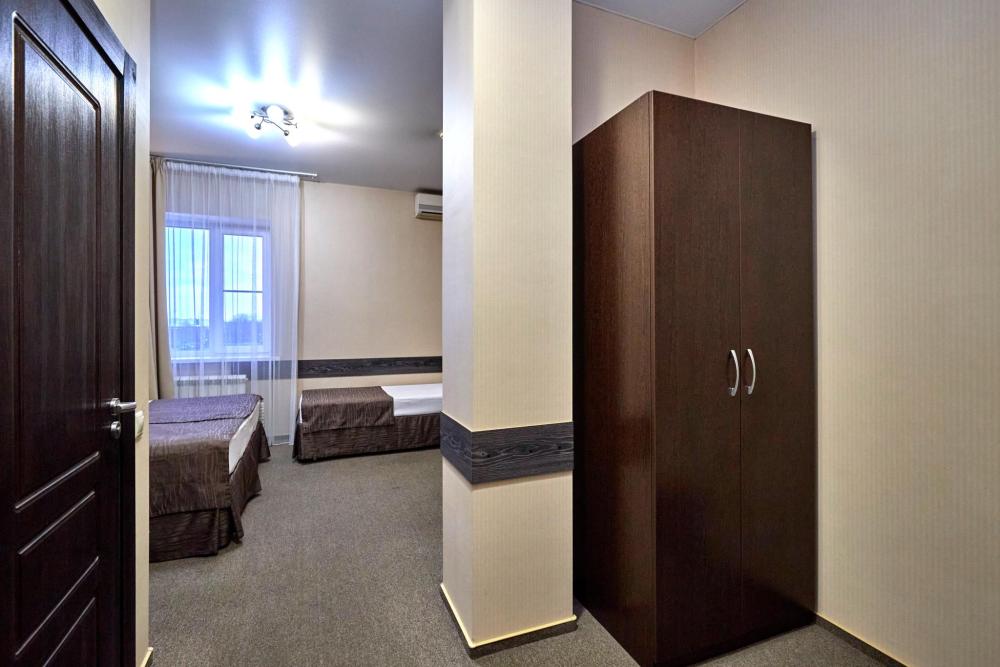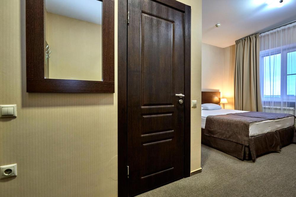 Двухкомнатный номер оборудованный всем необходимым для комфортного проживания. В номере: спальня и гостиная-переговорная, две двуспальные или двуспальная и 2 односпальные кровати, комплект мебели, кондиционер, телевизор, санузел с душем.