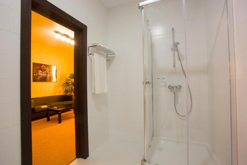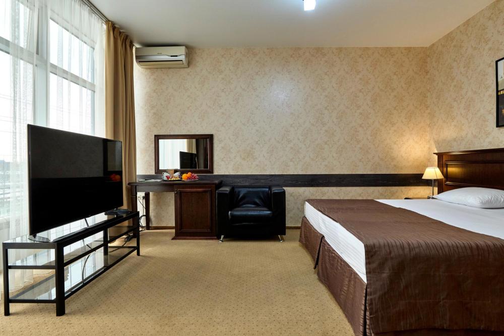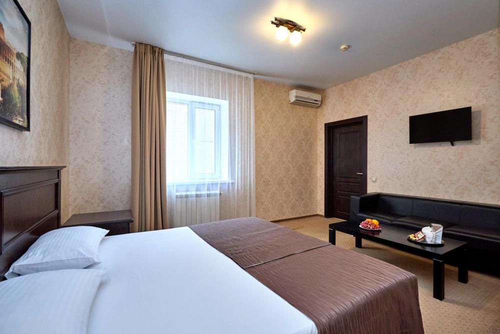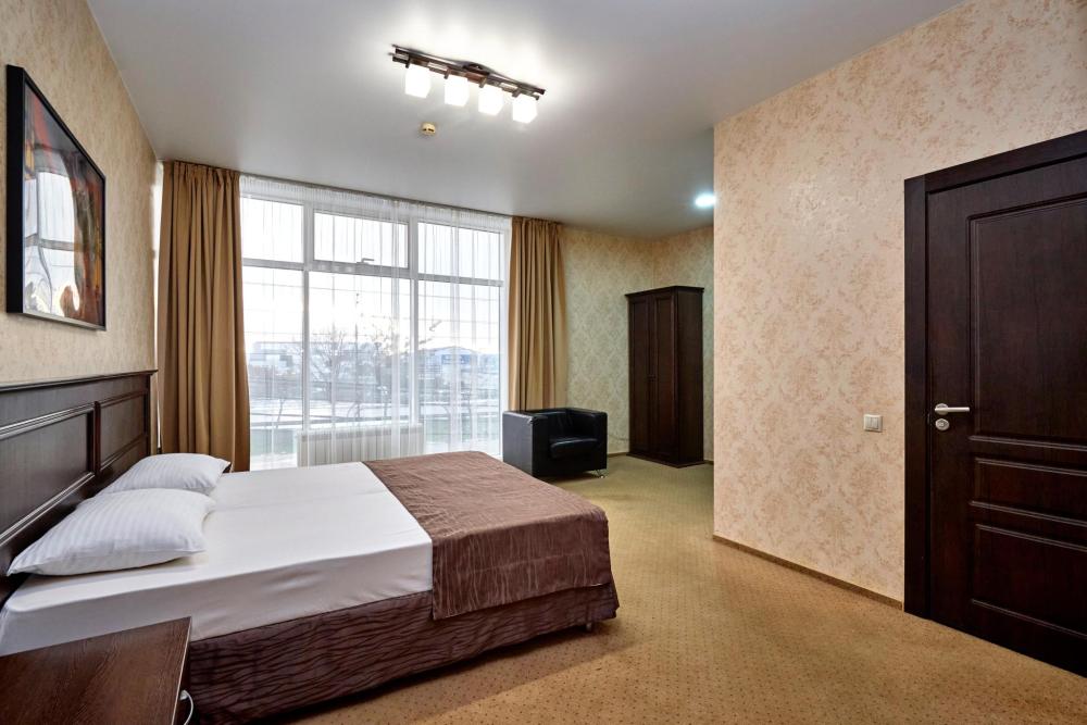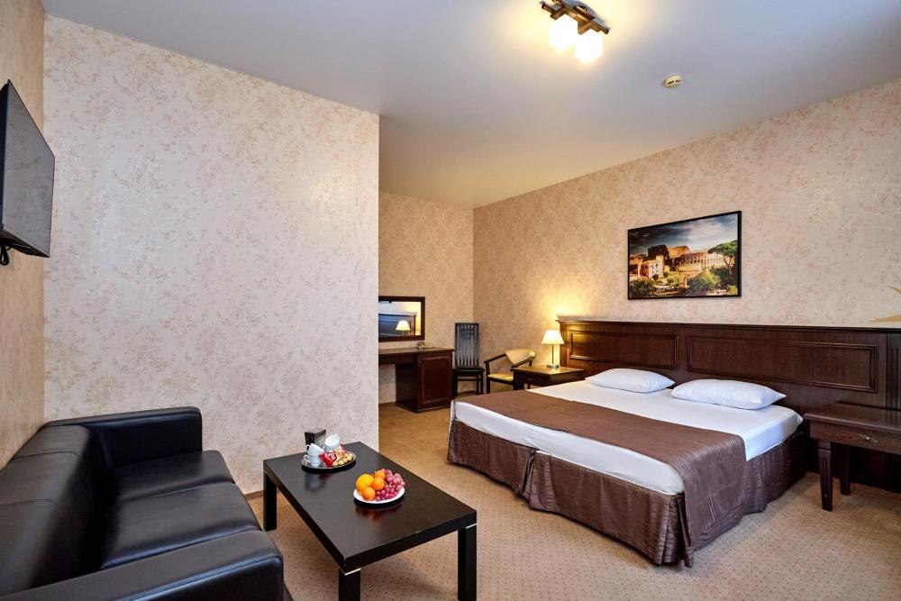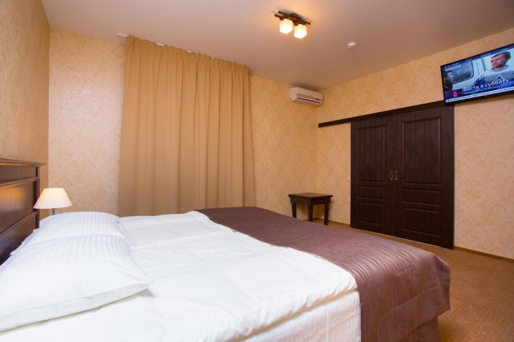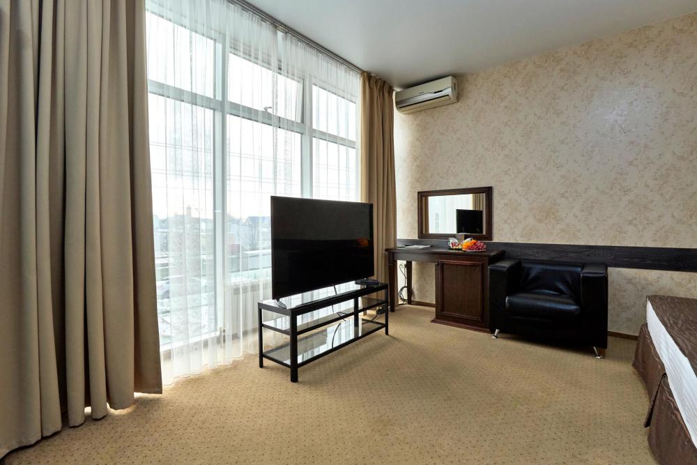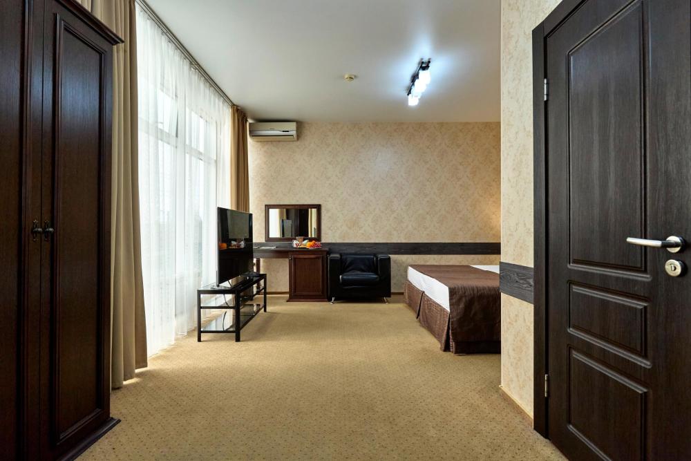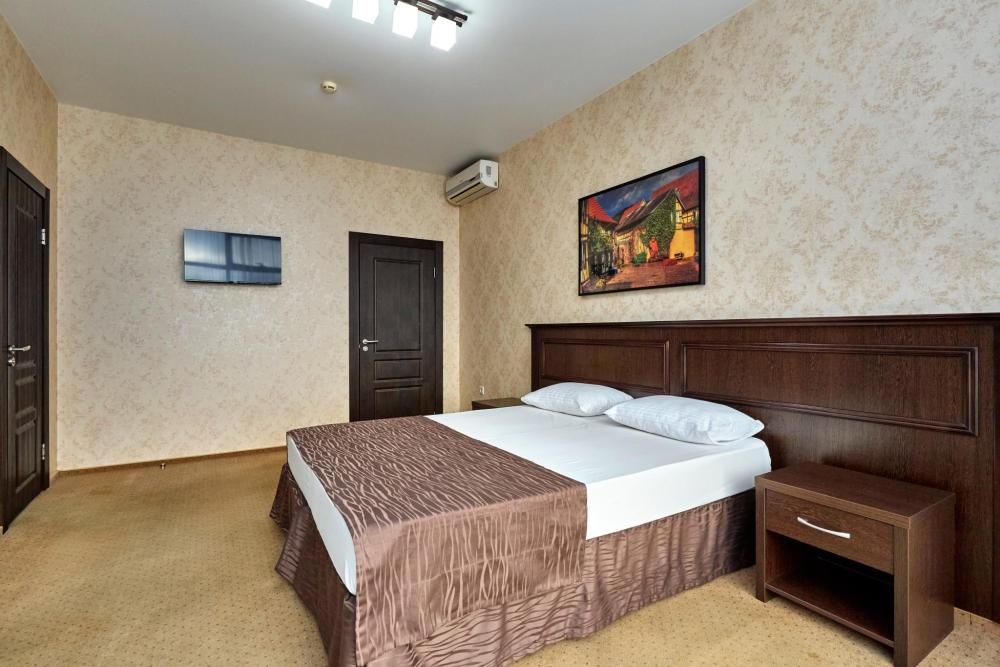 Двухкомнатный номер оборудованный всем необходимым для комфортного проживания. В номере: спальня и гостиная-переговорная, две двуспальные или двуспальная и 2 односпальные кровати, комплект мебели, кондиционер, телевизор, санузел с душем.