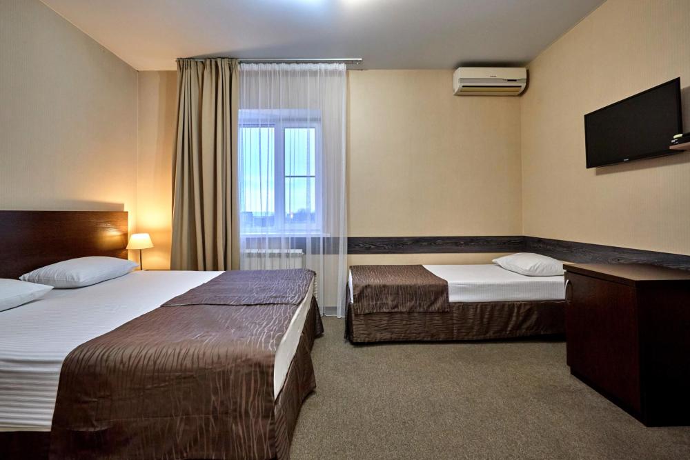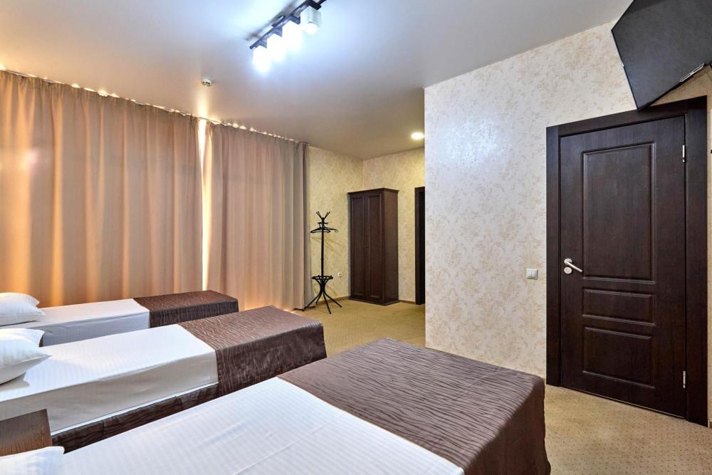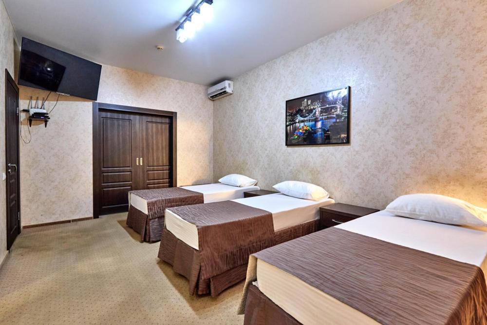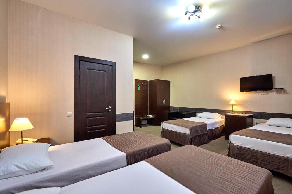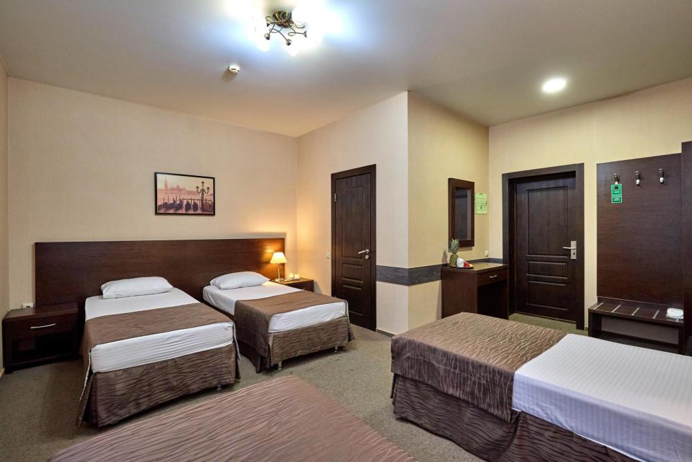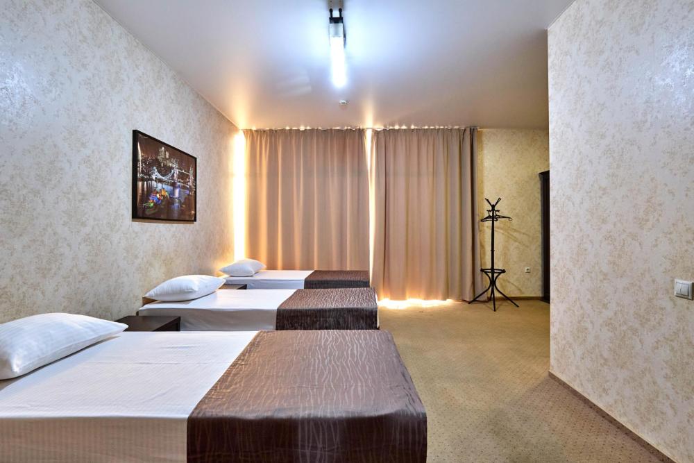 Трехместный номер стандарт, оборудованный всем необходимым для комфортного проживания. В номере: двуспальная и односпальная или три односпальных кровати, комплект мебели, телевизор, кондиционер, санузел с душем.