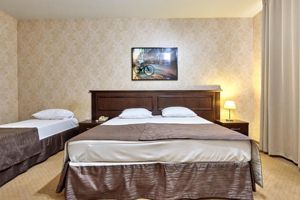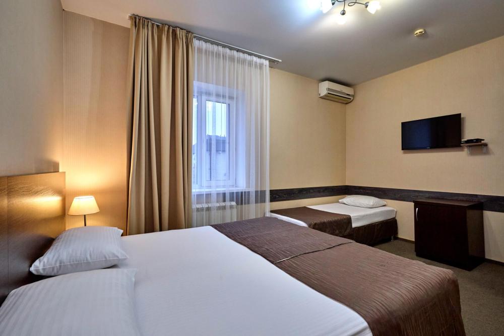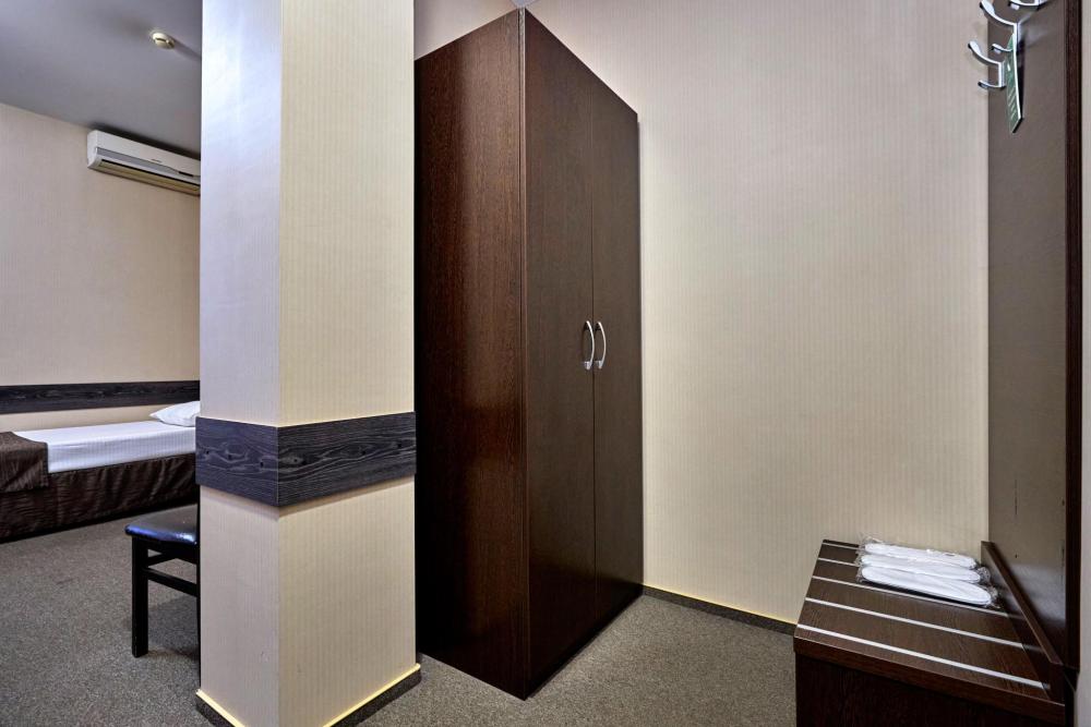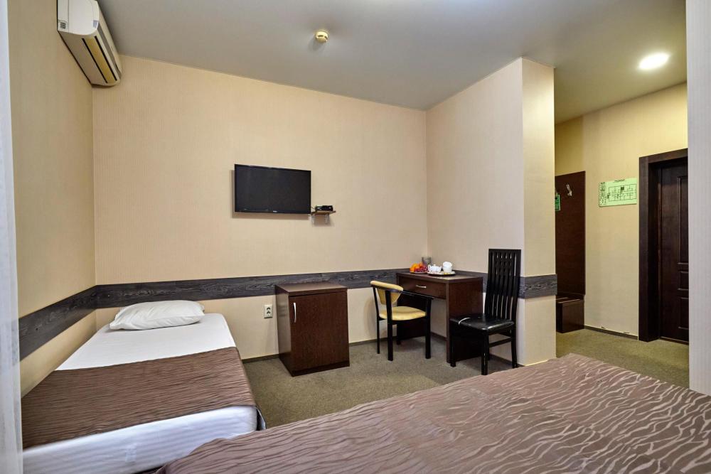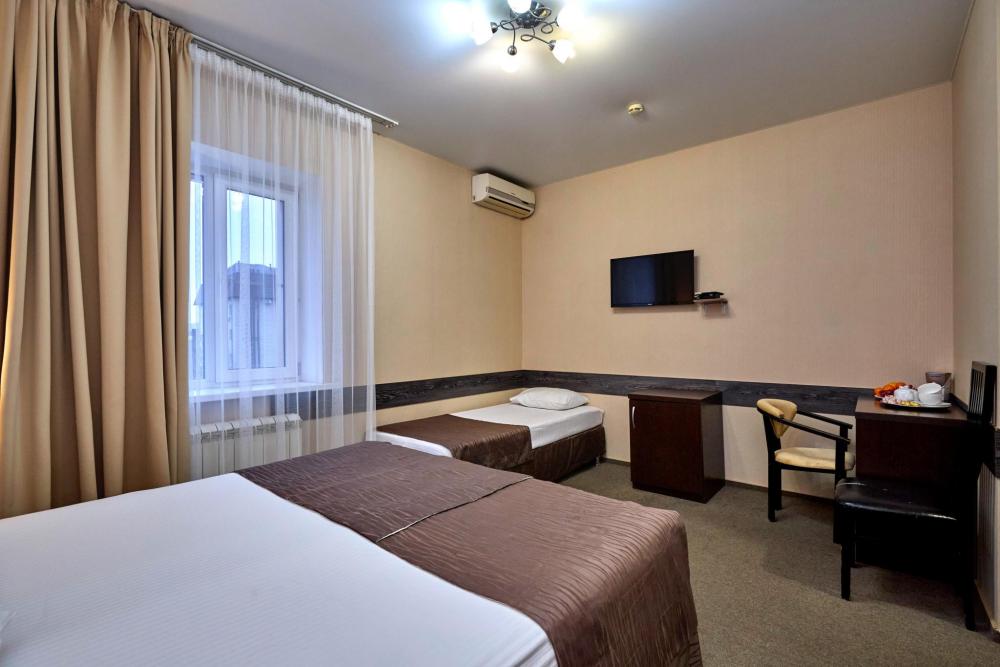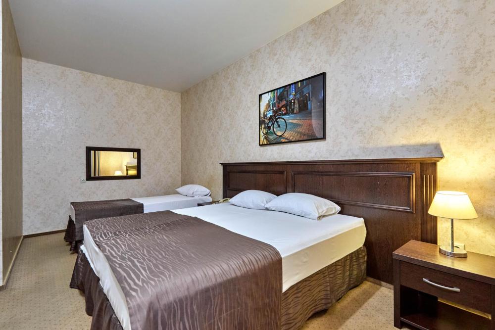 Трехместный номер стандарт, оборудованный всем необходимым для комфортного проживания. В номере: двуспальная и односпальная или три односпальных кровати, комплект мебели, телевизор, кондиционер, санузел с душем.