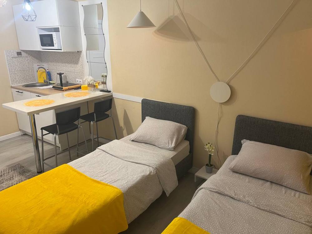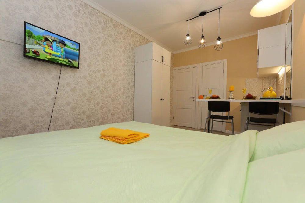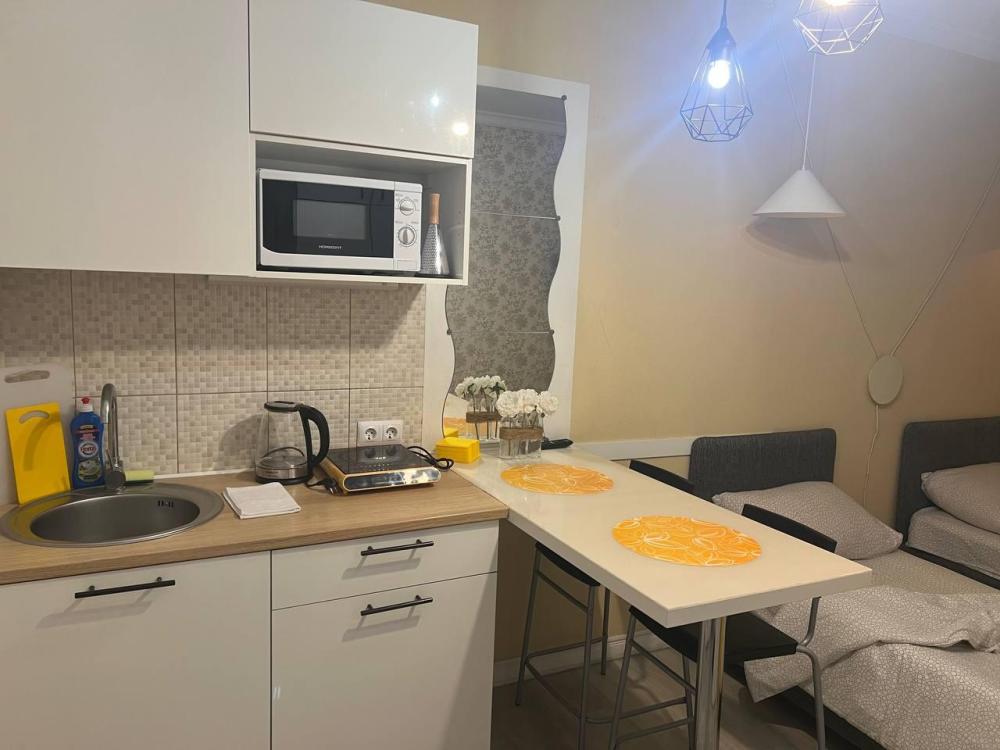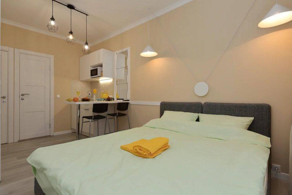Апартаменты оснащены: Мультимедиа: Wi-Fi, телевидение. Бытовая техника: электрическая варочная поверхность, чайник, утюг, фен, стиральная машина, микроволновая печь, холодильник. Дополнительно: туалетные принадлежности, полотенца, постельное бельё, тапочки, набор посуды,гладильная доска Удобства: двуспальная кровать, раскладной диван.