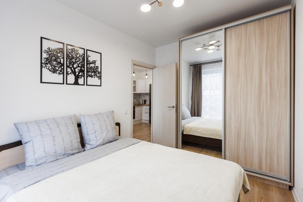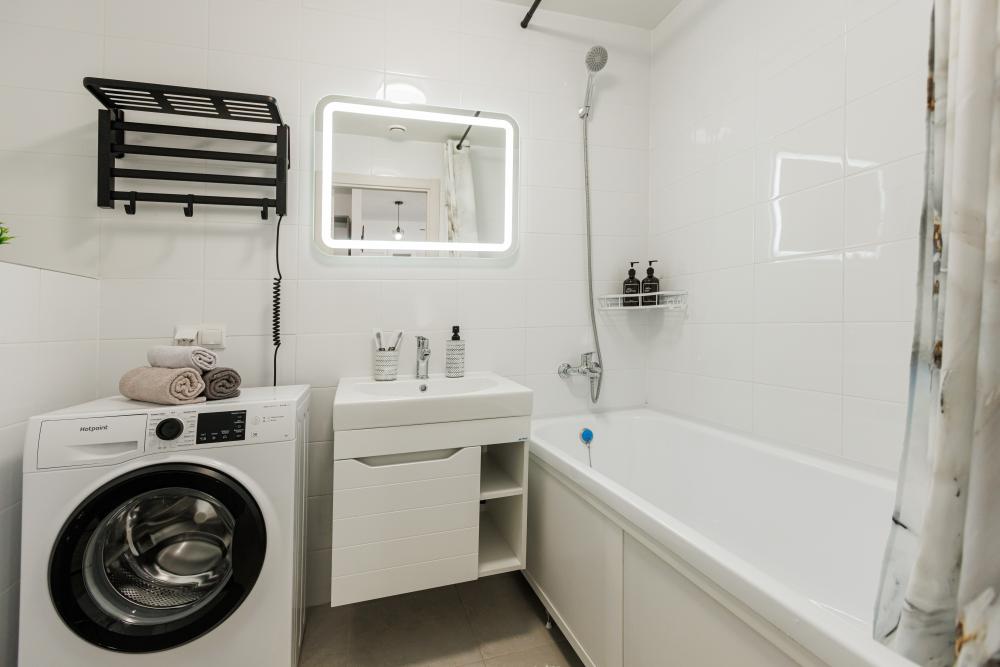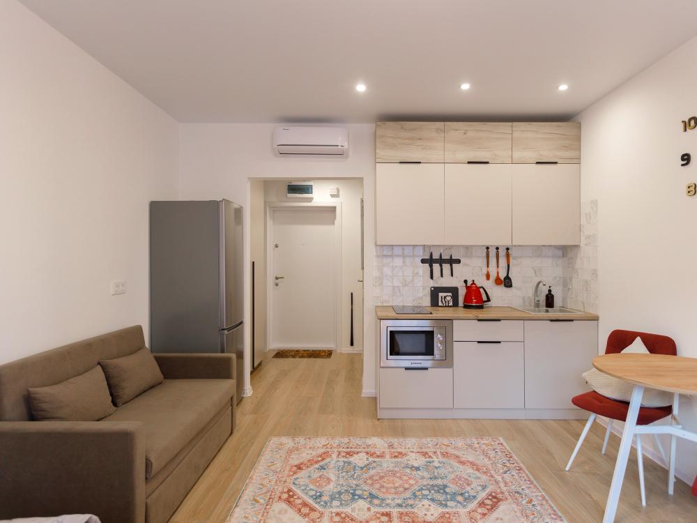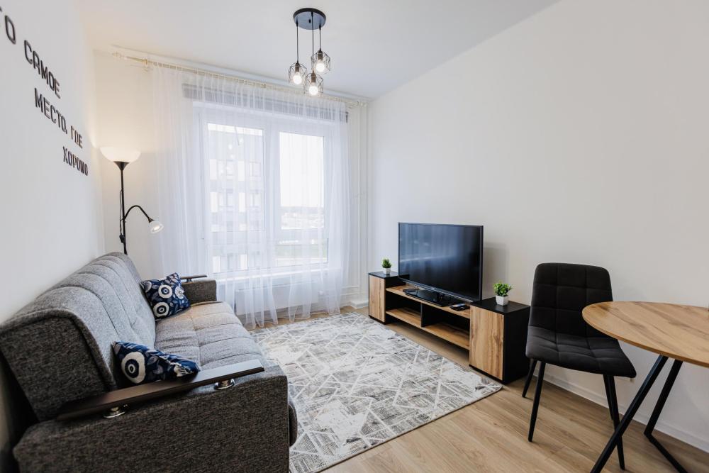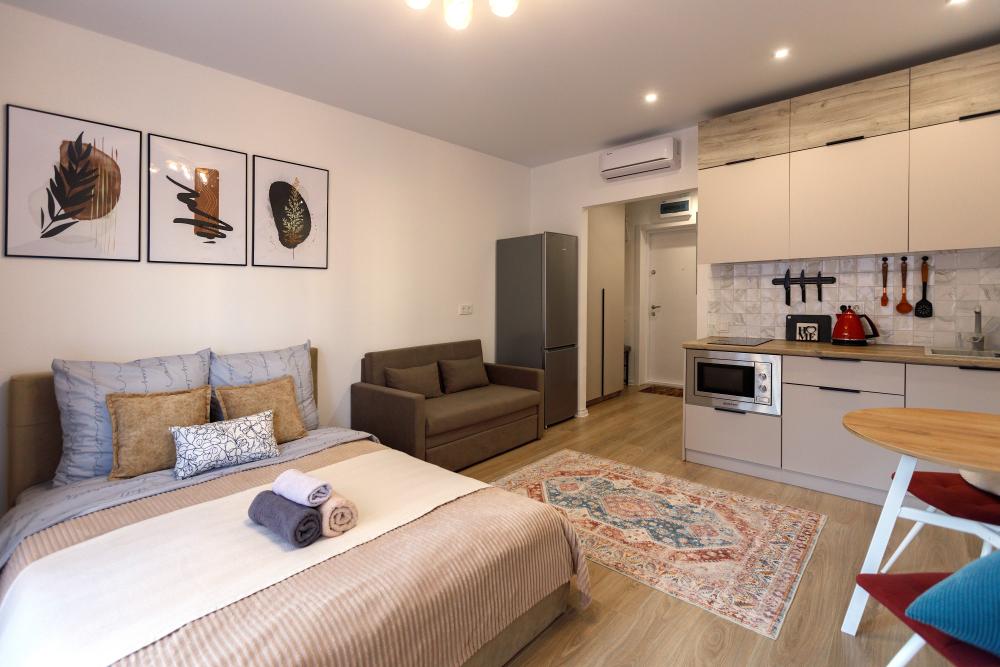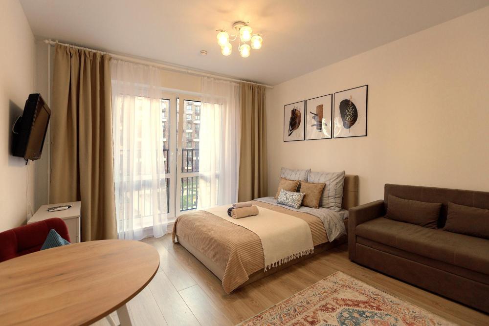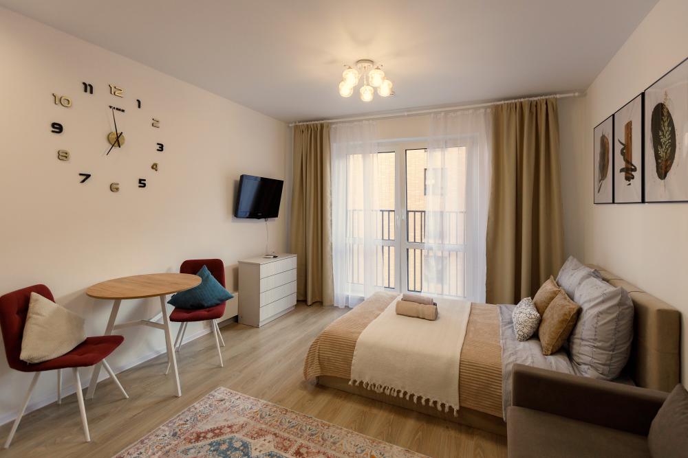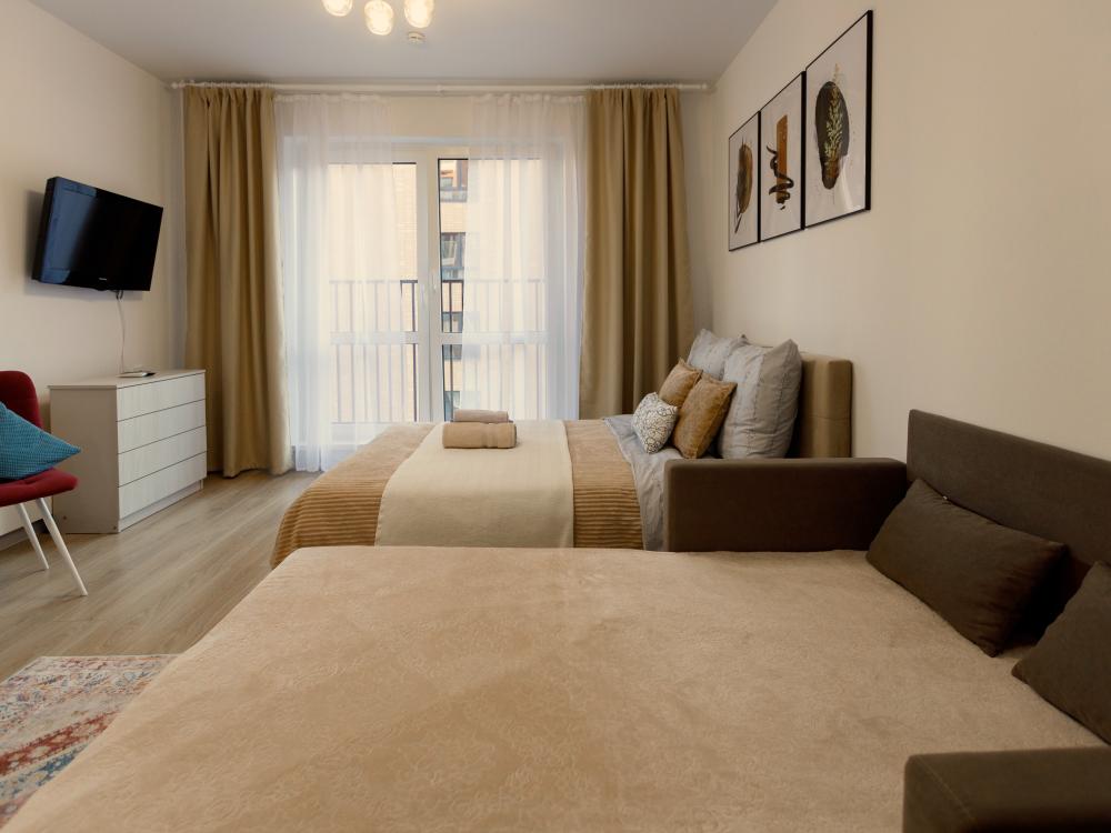 Апартаменты-студия подойдут для размещения 2-4 человек. Спальные места: двуспальная кровать с ортопедическим матрасом и раскладывающейся диван. Имеется все необходимое для комфортного проживания: высокоскоростной WI-FI и TV, стиральная машина, сушилка для белья, фен, гладильные принадлежности. В кухонной зоне: плита, холодильник, чайник, СВЧ-печь, посуда и кухонные принадлежности. Постельное белье, полотенца и средства личной гигиены предоставляются индивидуально.