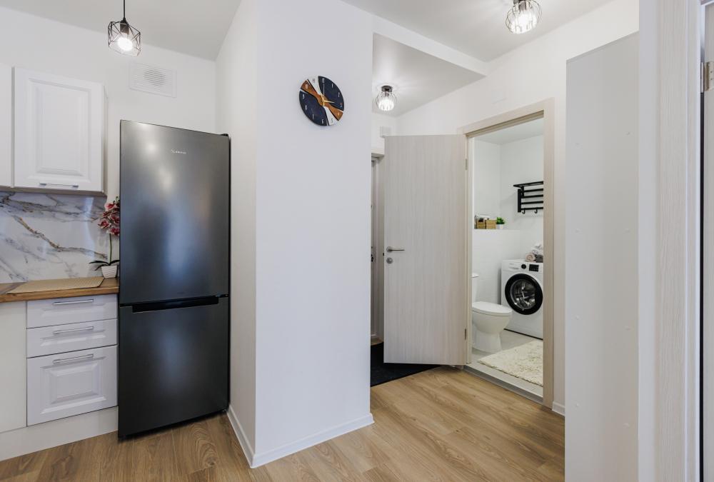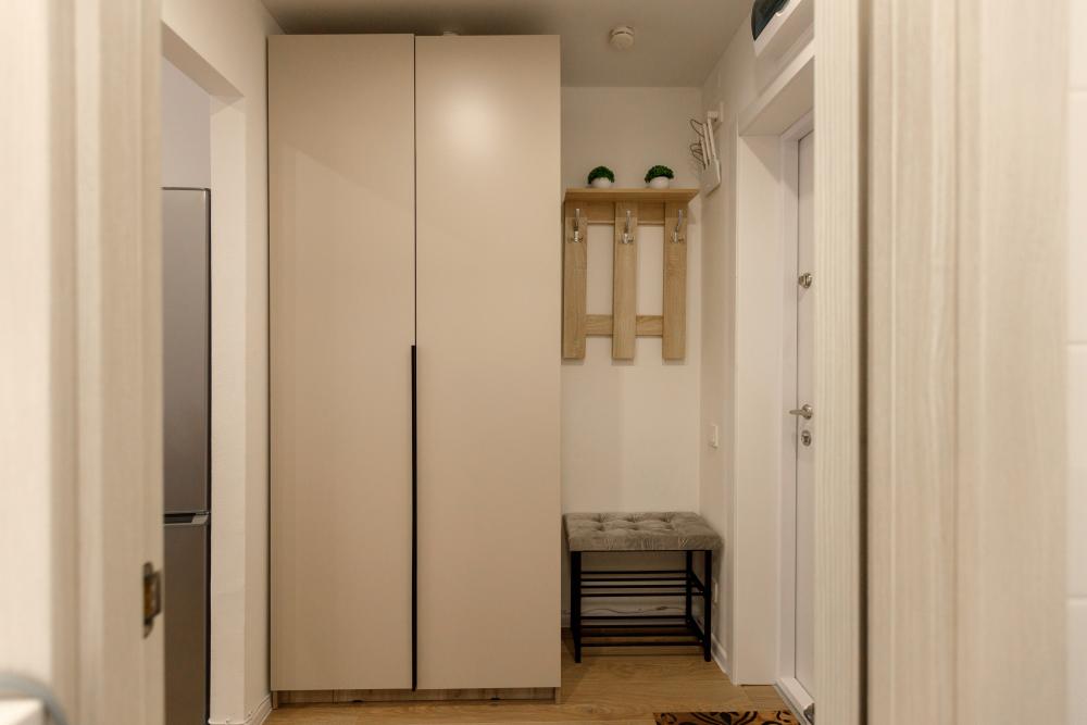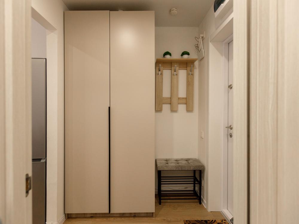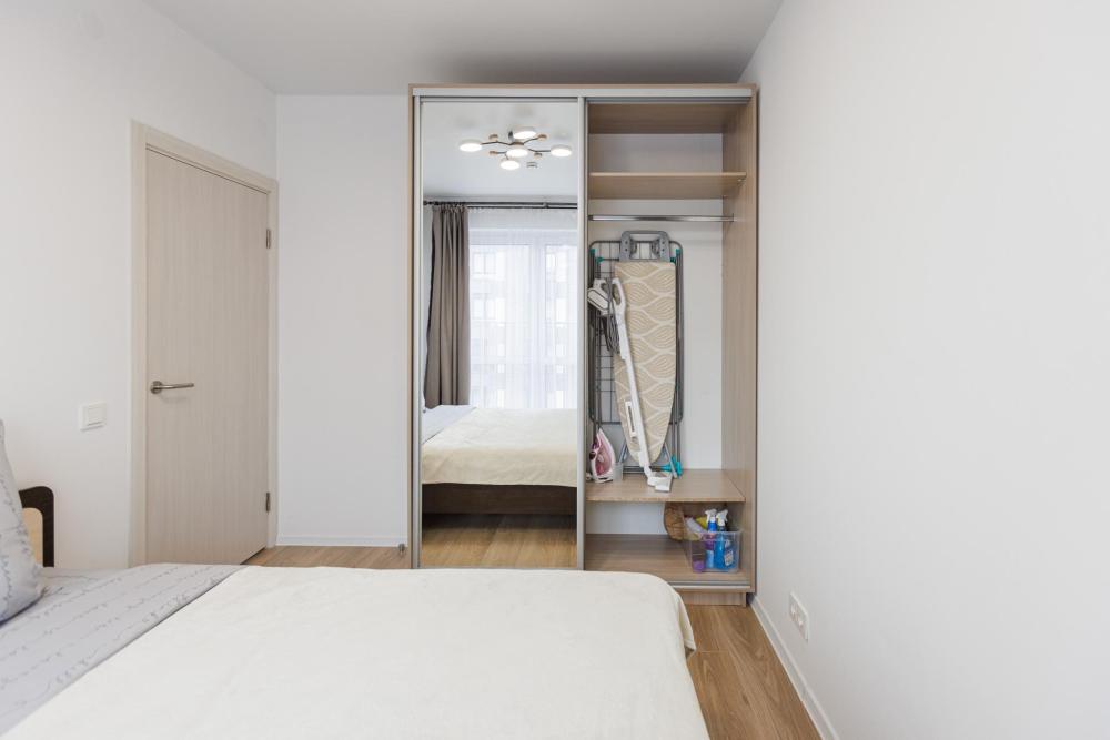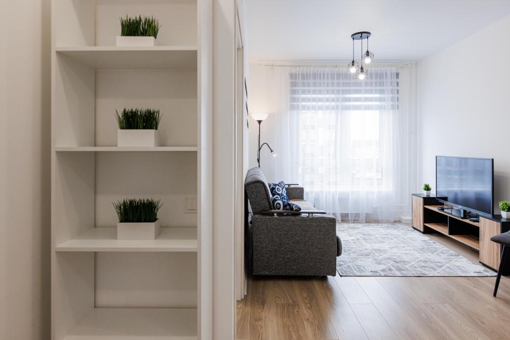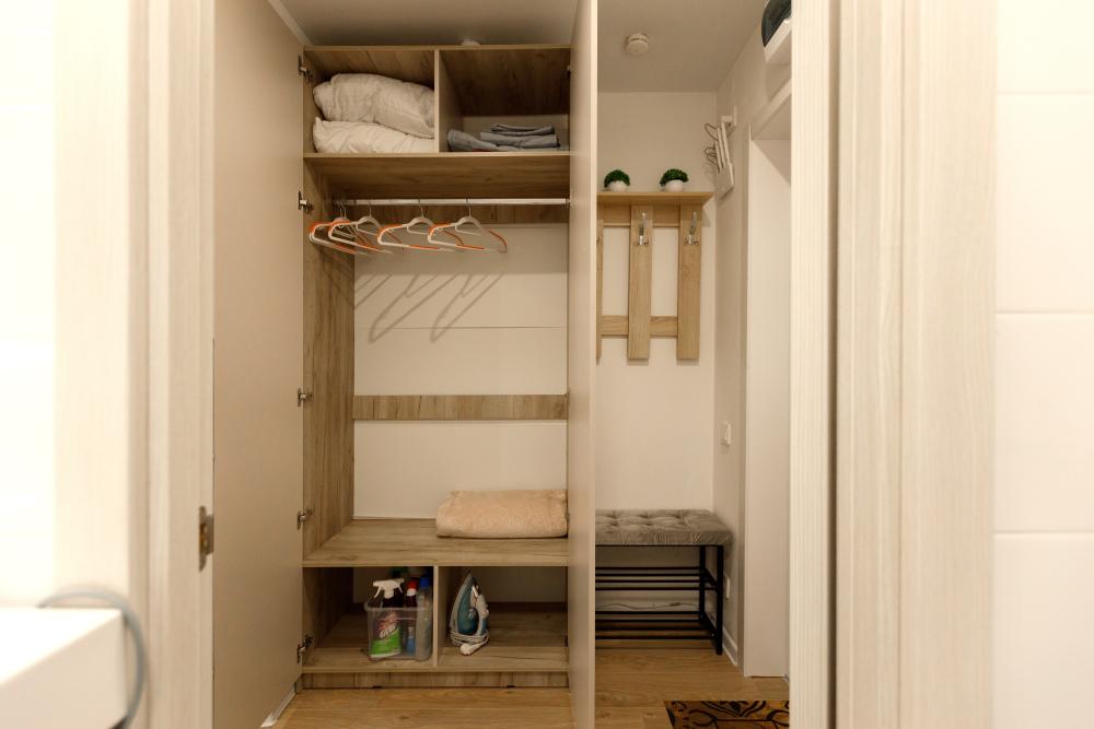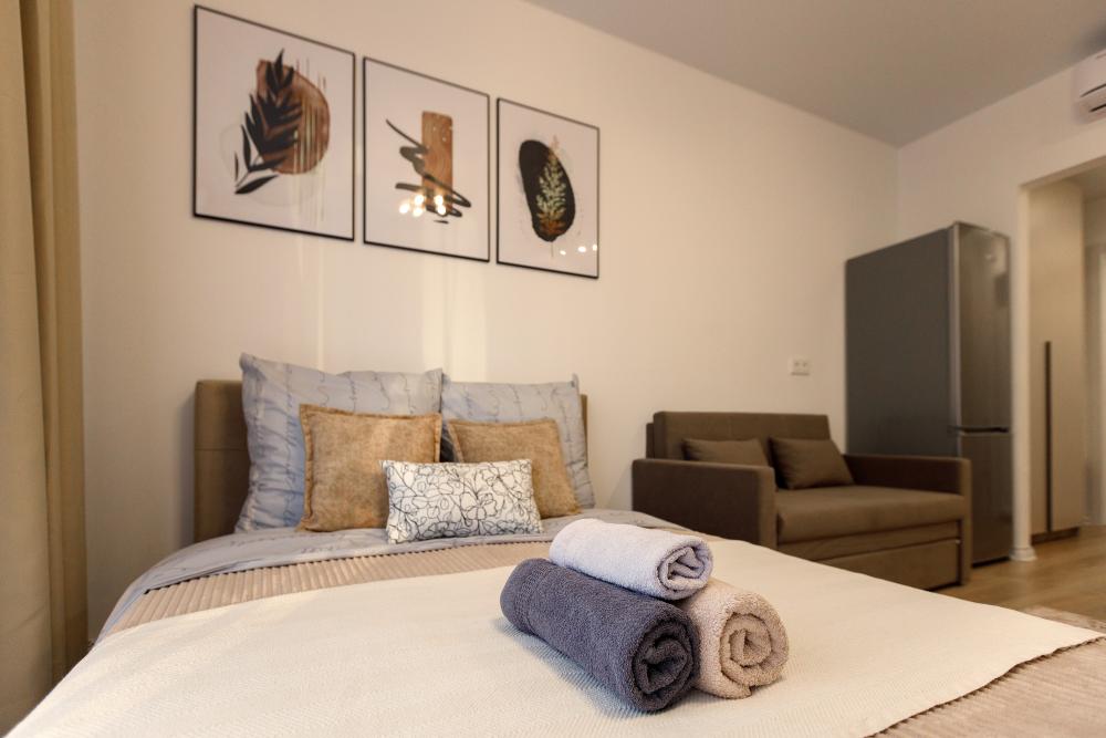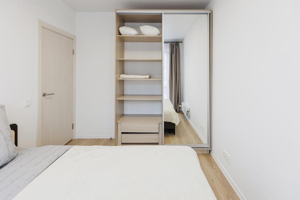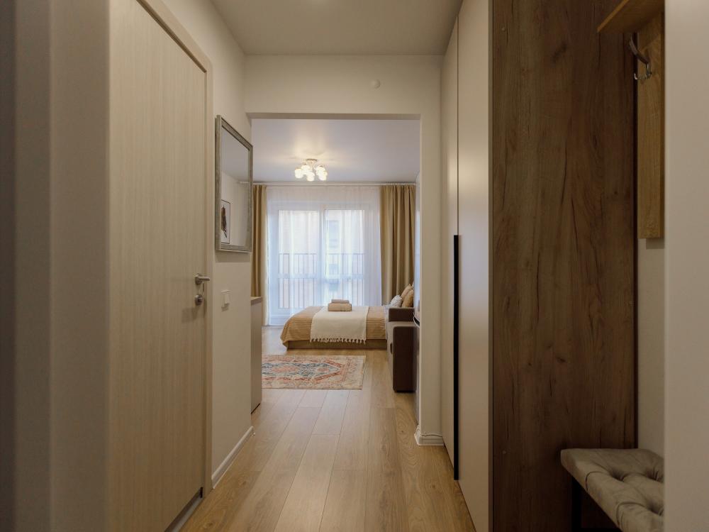 Апартаменты-студия подойдут для размещения 2-4 человек. Спальные места: двуспальная кровать с ортопедическим матрасом и раскладывающейся диван. Имеется все необходимое для комфортного проживания: высокоскоростной WI-FI и TV, стиральная машина, сушилка для белья, фен, гладильные принадлежности. В кухонной зоне: плита, холодильник, чайник, СВЧ-печь, посуда и кухонные принадлежности. Постельное белье, полотенца и средства личной гигиены предоставляются индивидуально.