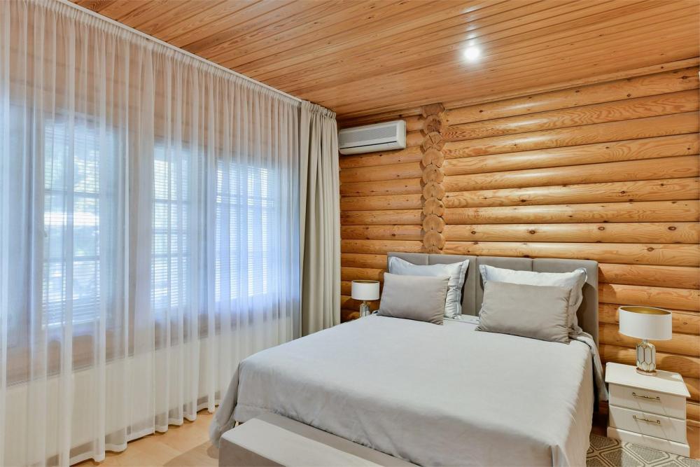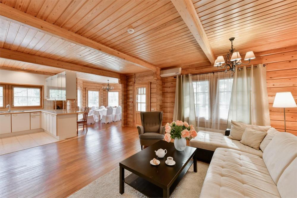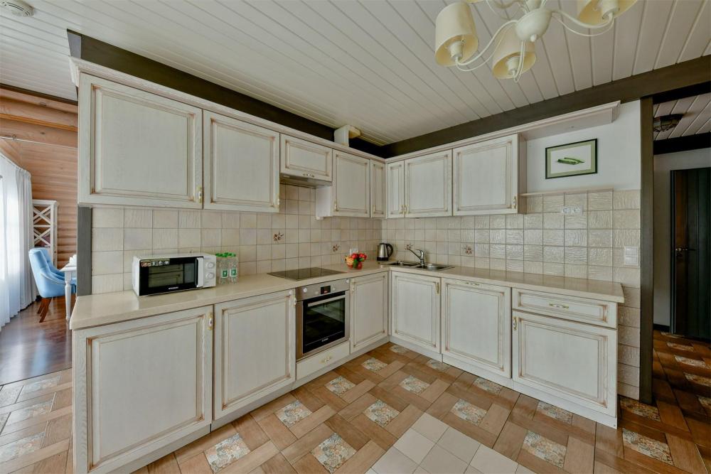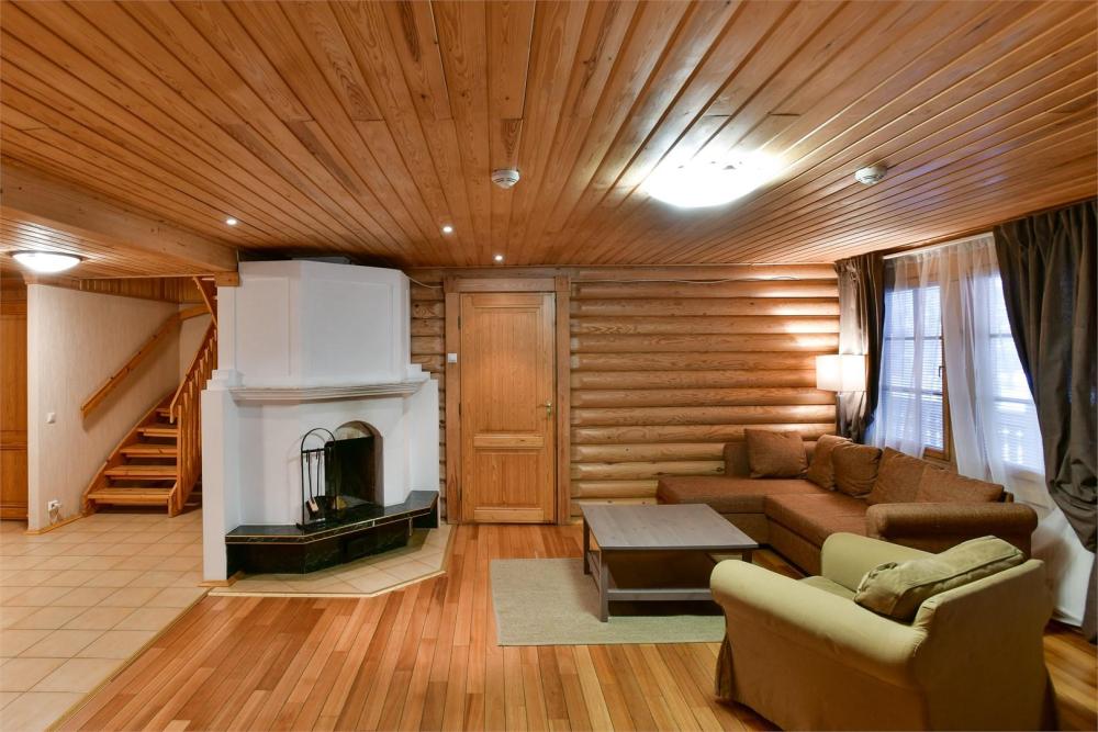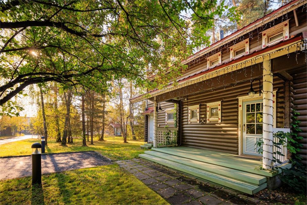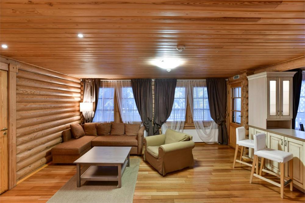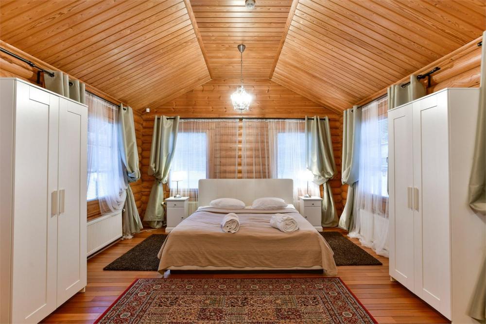 Одноэтажный деревянный коттедж с 3 спальнями, каминным залом, сауной. Каминный зал включает в себя кухню, гостинную и обеденную зоны. Действующий камин оборудован современной системой вытяжки. Для дополнительного удобства в коттедже имеется постирочная комната.