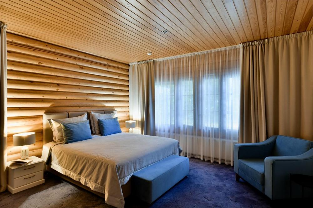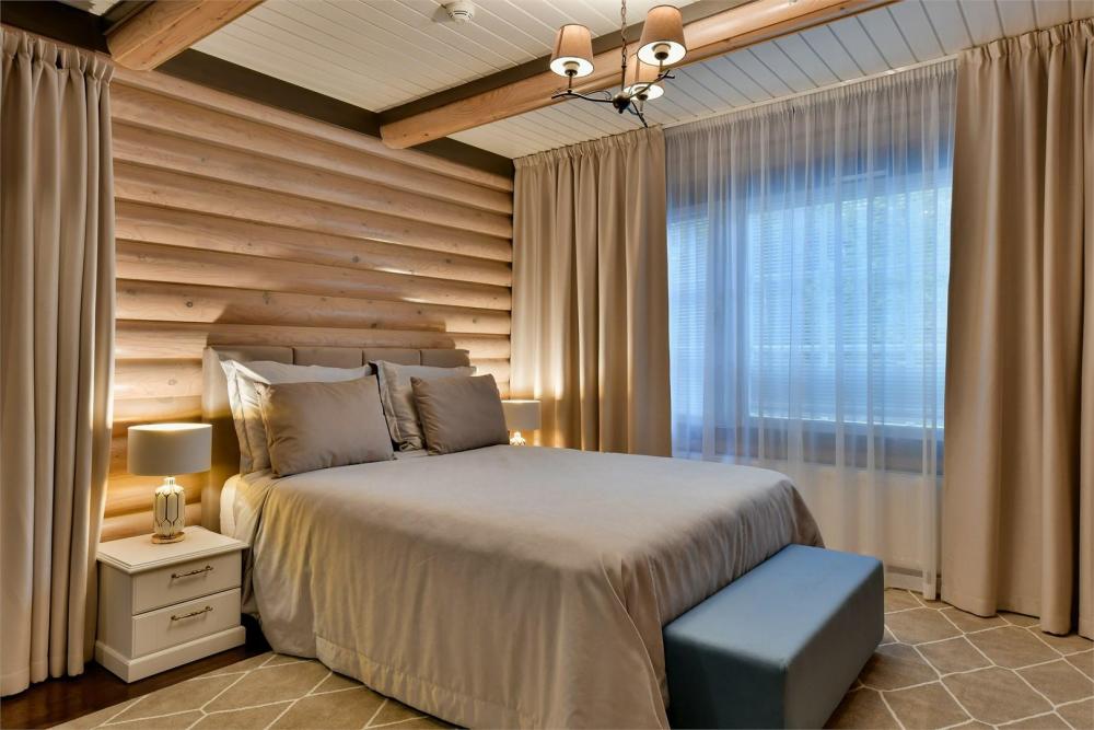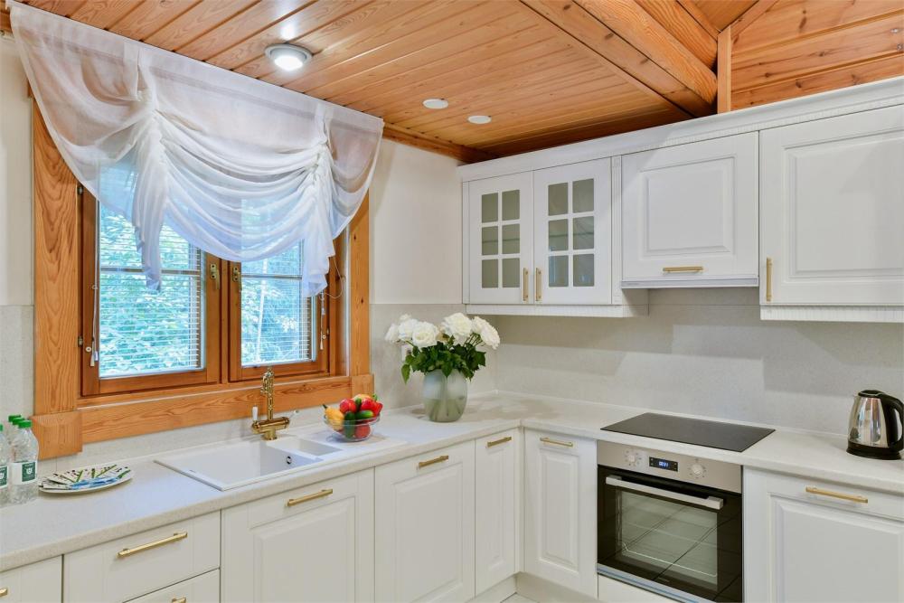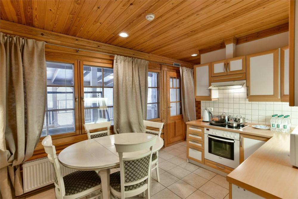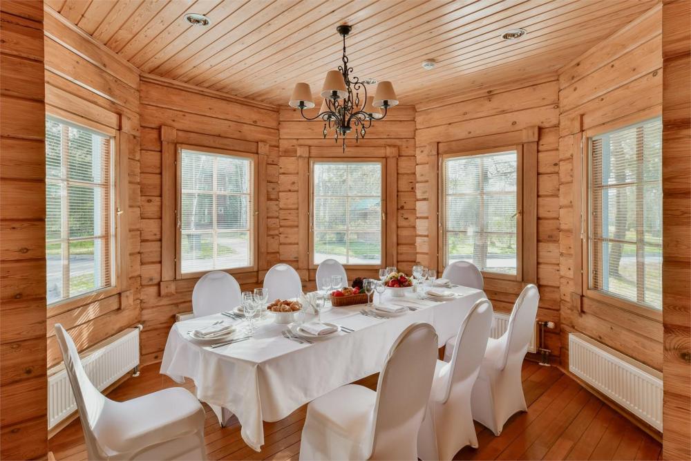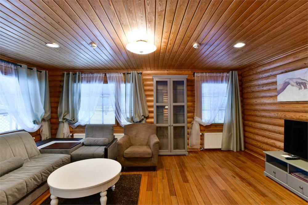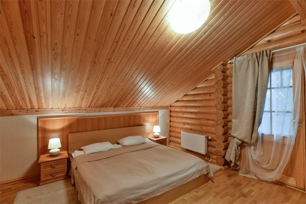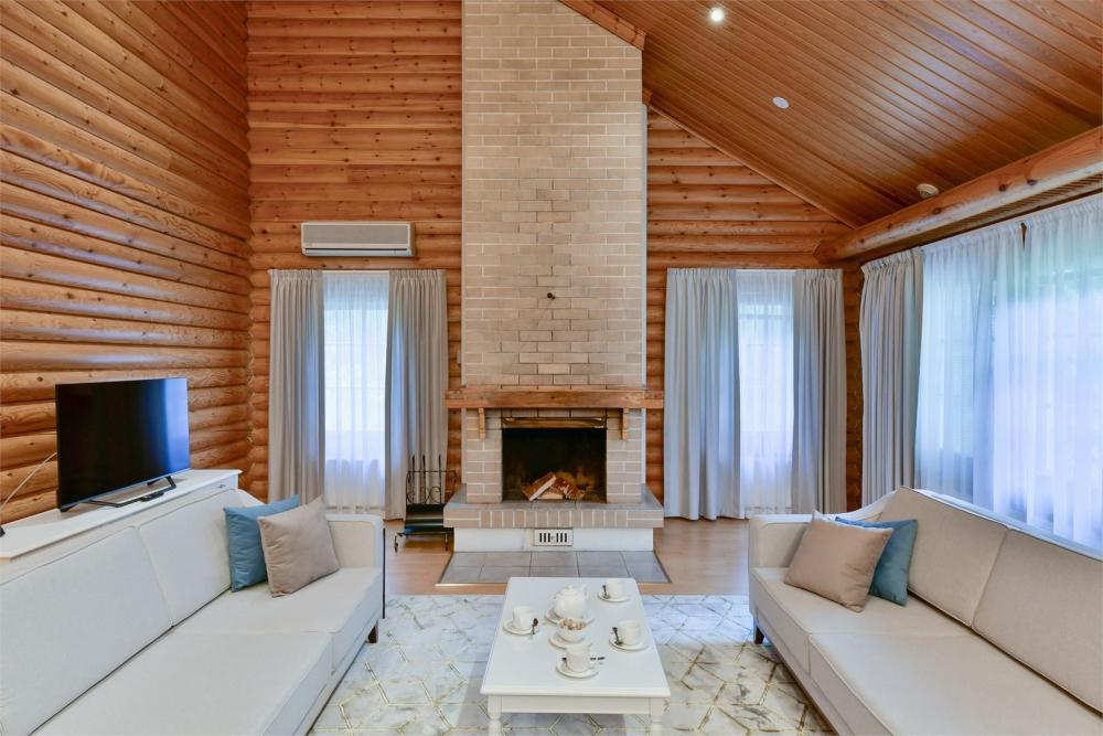 Одноэтажный деревянный коттедж с 3 спальнями, каминным залом, сауной. Каминный зал включает в себя кухню, гостинную и обеденную зоны. Действующий камин оборудован современной системой вытяжки. Для дополнительного удобства в коттедже имеется постирочная комната.